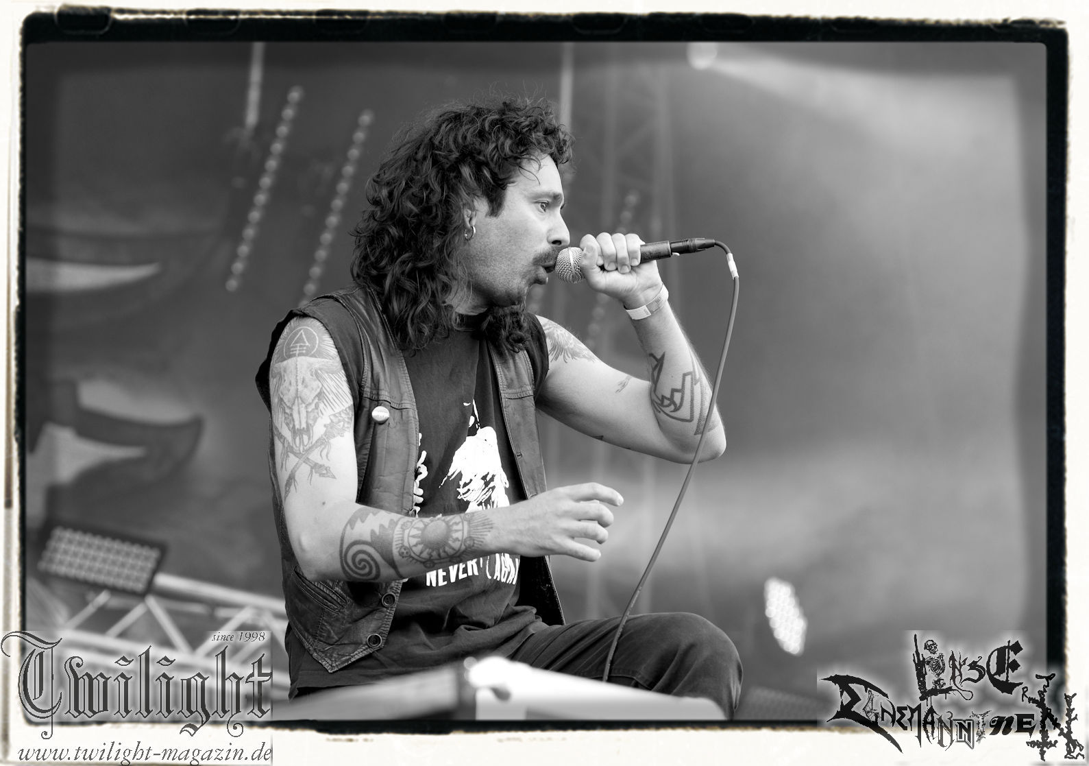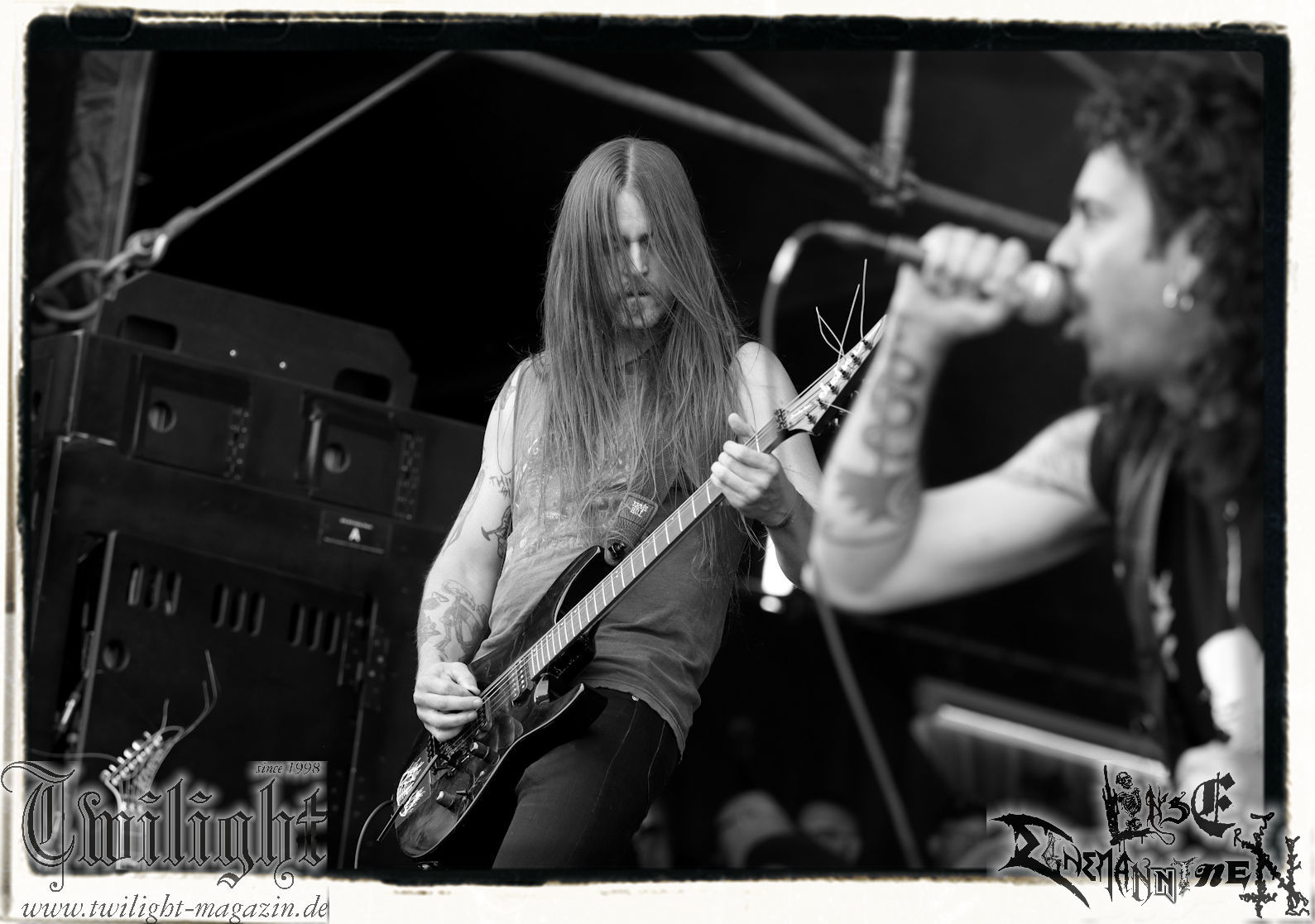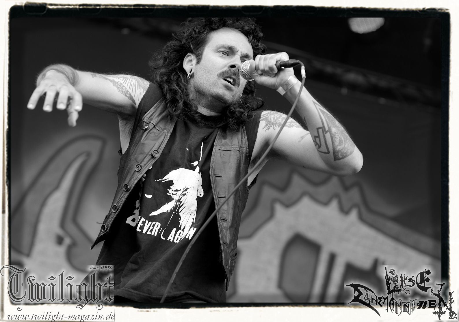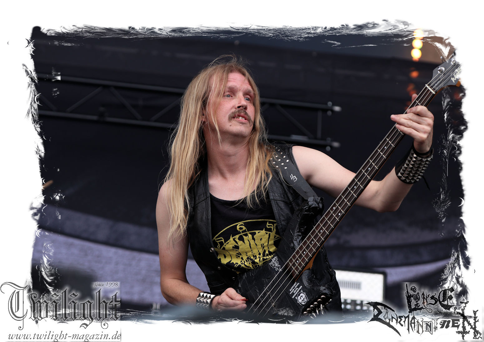 Nach den Hypocrisy- und Bolt Thrower-Covershows im vergangenen Jahr war das Engagement von BLOOD FIRE DEATH eigentlich eine reine Formsache. Denn auf welche Band, wenn nicht Bathory, sollte sich das Publikum des PARTY.SAN METAL OPEN AIRs, eines Festivals, das stilistisch im Kern von Heavy Metal über Thrash- und Death Metal bis hin zum Black Metal seine Schnittmenge hat, einigen können. Wobei Quorthon (R.I.P.) selbst nie aufgetreten ist und nicht mehr auftreten kann. Zum Glück gibt es ein Kollektiv wie Blood Fire Death, welches sich dem vielschichtigen Schaffen des schwedischen Visionärs, der wie kein anderer Einfluss auf die Death- und Black Metal-Szene genommen hat und ohne den es Subgenres wie Viking- oder Pagan-Metal in der heutigen Form vermutlich nicht geben würde, annimmt. Den Kern des einstündigen Sets bildet "Hammerheart" mit drei Songs inkl. des Finales "Road To Asa Bay". Der Einstieg erfolgt standesgemäß mit "Twilight Of The Gods". Dazwischen gibt´s mit "Women Of Dark Desires", "A Fine Day To Die", "Sacrifice" und "War" Klassiker um Klassiker. Trotz der flankierenden Banner am Bühnenrand wird leider kein Stück von "Blood On The Ice" gespielt. Die Darbietung ist absolut würdig, die Musiker über jeden Zweifel erhaben und angesichts des Songmaterials treibt es manch einem Fan im proppevollen Zelt, dass einer Sauna ohne frischen Aufguss gleicht, die Freudentränen in die Augen. Am Ende stellt sich mir nur die Frage, wieso und warum man einer Band, die diesen Aufwand auf der Bühne betreibt und so eine mitreißende Darbietung hinlegt, angesichts eines nahezu unerschöpflichen Fundus an Songmaterial von Bathory, nicht die vollen zwei Stunden des Frühschoppens performen lässt. Aber bekanntlich soll man immer dann aufhören, wenn es am schönsten ist. Fakt ist, Blood Fire Death dürfen mit alternativer Setlist gerne alsbald wiederkommen. (JD) Allerdings gibt es durchaus auch andere Wahrnehmungen: Da Bathory nie live aufgetreten sind, ist dies wohl die beste Möglichkeit, herauszufinden, ob ein solcher Auftritt eine gute Idee gewesen wäre. Dazu gibt es gespaltene Meinungen, ist die Musik von dem viel zu früh verstorbenen Mastermind Quorthon doch nie für Livebühnen geschrieben worden. Doch die Band gibt ihr Bestes und huldigt ihm 20 Jahre nach seinem Tod mit seinen unsterblichen Klassikern. Da schmeckt mir auch der erste Met des Tages wieder! (MS)