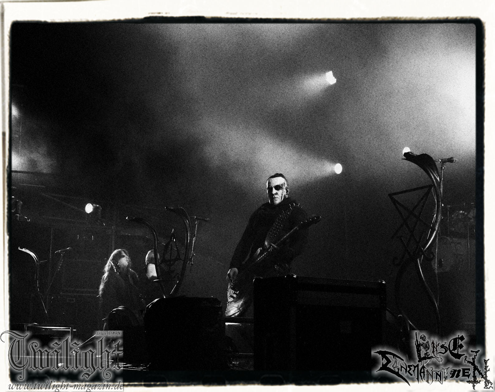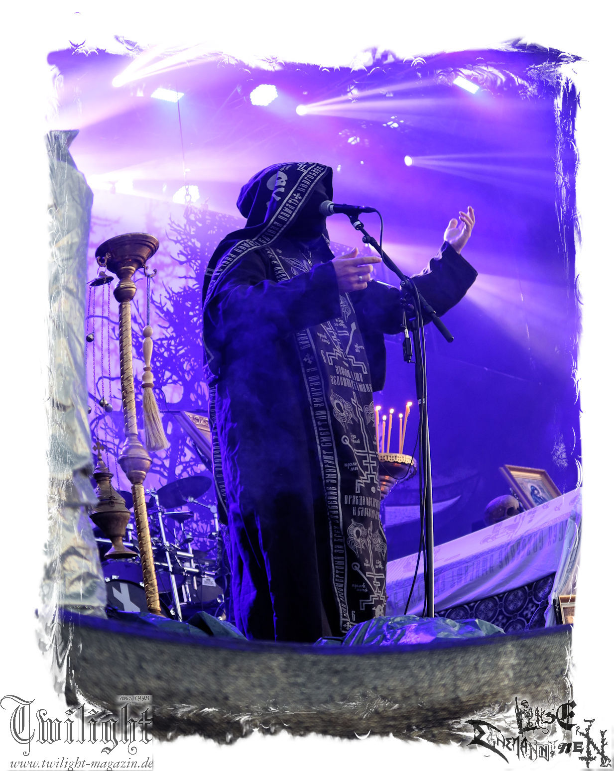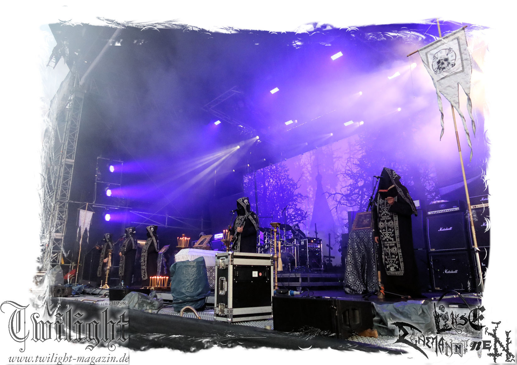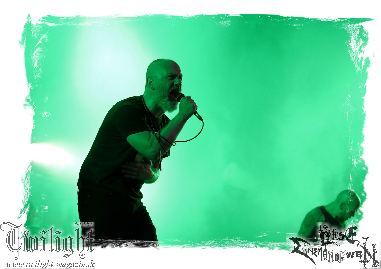 Obwohl ich mir immer wieder Schelte anhören muss, wenn ich ULTHA auslasse aber ich tue mich seit jeher schwer mit den Post Black Metal – Aufsteigern aus deutschen Landen, weil sie einfach irgendwie an mir vorbei musizieren. Und wo ich schon mal bei der gewerkschaftlichen Pause bin. Behemoth´s kleine Brüder HATE zwingen mich auch nicht schnell wieder vor die Bühne und ich weiß, der Stempel wird ihnen vielleicht auch nicht mehr so wirklich gerecht. Martin ist das wiederum näher dran: In der knalligen Mittagshitze dürfen dann die Kölner Ultha (ohne „R“!) ihren Post-Black Metal in die noch recht überschaubare Menge feuern. Wie für das Genre typisch, überlange Songs zieren die Setlist, doch werden diese auch durch das Zusammenspiel gleich zweier Sänger nicht langweilig und man kann sich in den Songstrukturen verlieren. Minutenlange monotone Rhythmen werden durch Schrei-Attacken unterbrochen, um dann in ruhigen Shoegaze-Passagen wieder zusammen zu fallen. Im kleinen Konzertsaal um die Ecke ist das sicher noch mal eindrucksvoller, doch einige Fans wird die Band sicherlich neu überzeugt haben. (MS) Bei PHANTOM WINTER im Zelt möchte ich dann doch mal Augen und Ohren riskieren. Viele Freunde aus meinem privaten Umfeld sind nicht erst seit dem neuen Output "Her Cold Material" begeistert von der Post Metal/Sludge-Formation aus Würzburg. Der Line-Check zieht sich zunächst ziemlich und dann ist es Drummer Christof, der gleich beim ersten Song seine Fußmaschine zertrümmert. Eine Panne, die Stage-Crew und Band beidermaßen souverän meistern. Ich weiß nicht, ob es diese unbeabsichtigten Längen sind oder dann doch die Musik ist, die dazu führen, dass ich mich nicht in den Malstrom aus wahrer LEIDENschaft, dem sich vor allem Sänger Christian und Gitarrist/Sänger Andreas zu ihrem massiven wie intensiven Klangkonstrukt hingeben, mitreißen lassen kann. Beide Sanges-Protagonisten stehen sich seitlich zum Publikum auf der Bühne gegenüber. Allerdings werde ich hier wohl noch einmal auf Tonträger genauer hinhören müssen. Im Zelt holt mich das gerade nicht ab... (JD) Da ich leider niemanden erwärmen konnte mitzukommen (Aber ich war doch vor Dir schon da - JD), stehe ich nun etwas verspätet vor der Zeltbühne, um mich von Phantom Winter durchschütteln zu lassen. Ich habe die Band 2015 mal live in Braunschweig im Nexus zusammen mit Ur gesehen und erinnere mich immer noch gerne an dieses beeindruckende Konzert. Deshalb wollte ich die Truppe auf dem PARTY.SAN auch nicht verpassen und sie mir endlich mal wieder live anschauen. Christian, Andreas, Florian (Gitarre), Kevin (Bass) und Christof (Drums) sind schon ordentlich eingegrooved und brennen auf der Bühne, eingehüllt in Nebel und weißes sowie blaues Licht, ein wahres Inferno der Emotionen ab. Auf den ersten Blick finde ich interessant, dass sich Christian und Andreas mittig leicht schräg gegenüberstehen und sich dadurch gegenseitig im Wechsel oder synchron anschreien, ankeifen, anröhren oder anflüstern. Das hat echt was und baut meiner Meinung nach sehr intensive Momente auf. Die beiden gehen förmlich, genauso wie Florian (linksstehend), Kevin (rechtsstehend) in der Musik auf, verlieren sich in ihr, lassen sich von ihr nicht nur emotional, sondern auch bewegungstechnisch, mitreißen, während Christof, bedingt durch die Drums, zwar in seinem Radius eingeschränkt ist aber still beim Spielen sitzen ist auch nicht seine Welt. Bei dieser alles mitreißenden und intensiven Musik ist es auch wirklich schwierig, von ihr nicht erfasst und mitgerissen zu werden. So geht es auch dem Publikum im gut gefüllten Zelt, welches teilweise schon versunken und verträumt diesen grandiosen Tönen lauscht, die sich von der Bühne aus, wabernden Schallwellen und einer alles durchdringenden Kraft an Gefühlen gleich, unserer bemächtigt. Eine Klänge gewordene Collage aus Wut, Verzweiflung, Entrücktheit, Dunkelheit, zerbrechlicher Schönheit und Tristesse beschreibt ihre Musik, die sich irgendwo zwischen Slugde, Black-, Doom-, Post-Metal/Rock ihre eigene Welt erschafft, sicherlich am besten und durch den echt tollen Bühnensound, die Beleuchtung und das Auftreten der Band an sich in Kombination mit den Songs, ist das Erleben dieses grandiosen Konzerts wie ein betörender, karthartischer Trip in die Abgründe unserer Seelen, der für mich persönlich wirklich angenehm und entspannend ist. Leider geht das Konzert nicht nur durch mein Zuspätkommen viel zu schnell zu Ende, glücklich bin ich aber trotzdem nach diesem Erlebnis und vielleicht dauert es nicht wieder so lange bis ich Phantom Winter mal wieder live sehen werde. (Rudi)