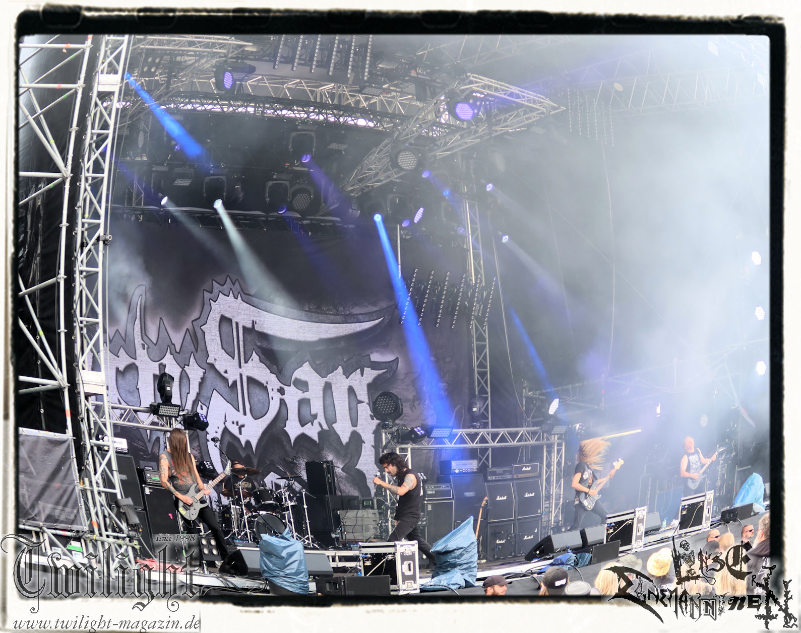 SULPHUR AEON hätten viele wohl lieber auf einem späteren Slot im Zelt, zumindest aber im Dunkeln gesehen. Die Sorge ist allerdings unbegründet. Die Band liefert auch auf der Mainstage in der Abendsonne. Was angesichts eines Albums wie "Seven Seals And Seven Crowns", das im vergangenen Jahr über Ván Records herausgekommen ist, kaum verwundern sollte. Außerdem ist die Band mittlerweile mit vier Longplayern und vielen Live-Auftritten im Rücken merklich gereift. Klassisches Entertainment oder viel Konversation mit dem Publikum darf man nicht erwarten, die Band zeigt sich eher introvertiert und lässt die Musik und den massiven wie einzigartigen düster-atmosphärischen Death Metal – Sound sprechen. Für meinen Geschmack sind Sulphur Aeon mächtig und gewaltig, wie nur wenige deutsche Bands. Es folgen OBSCURA, die ich weit weniger frickelig, als melodisch erlebe, zumindest bei den Ausschnitten, die ich am Rande beim Schlendern über das Festival-Gelände mitbekomme. Das hatte ich anstrengender in Erinnerung.