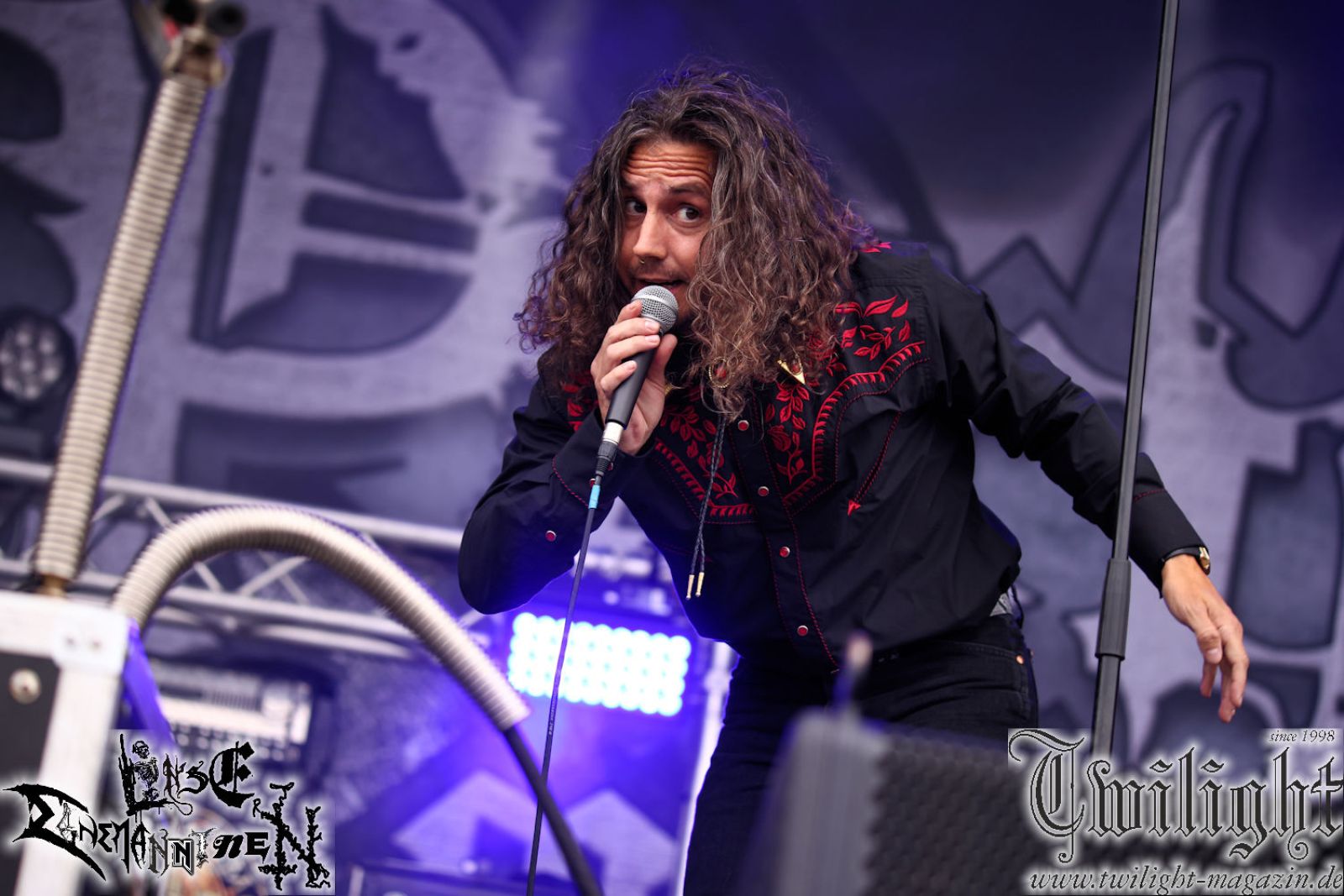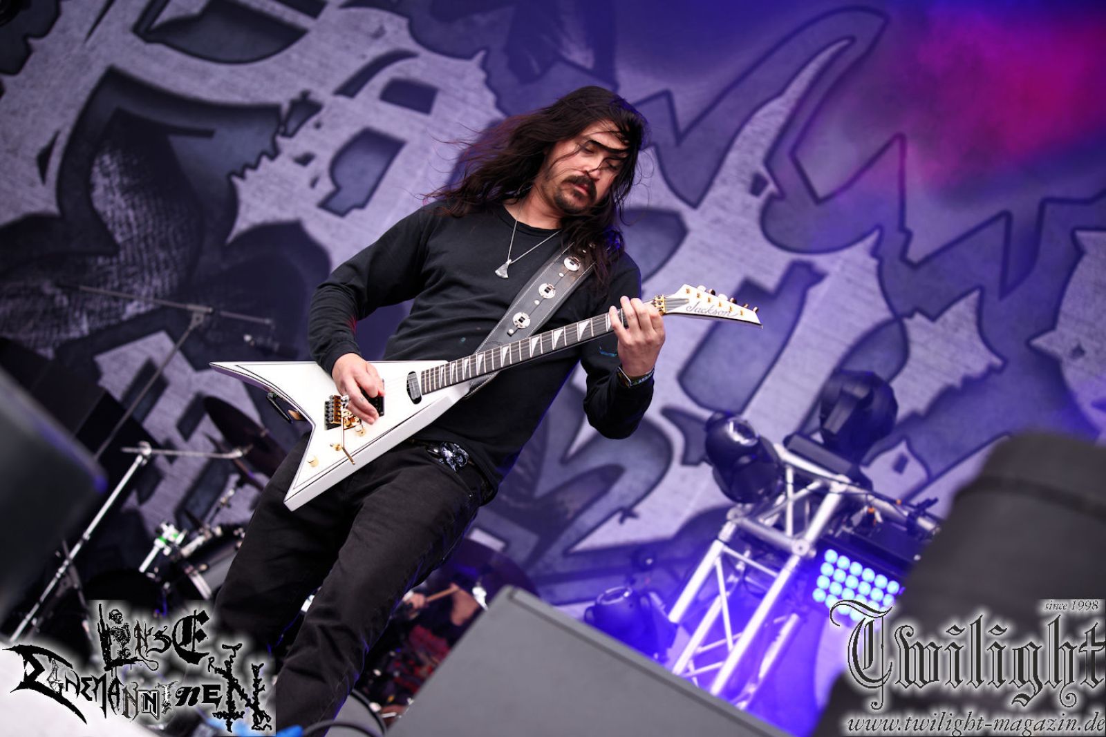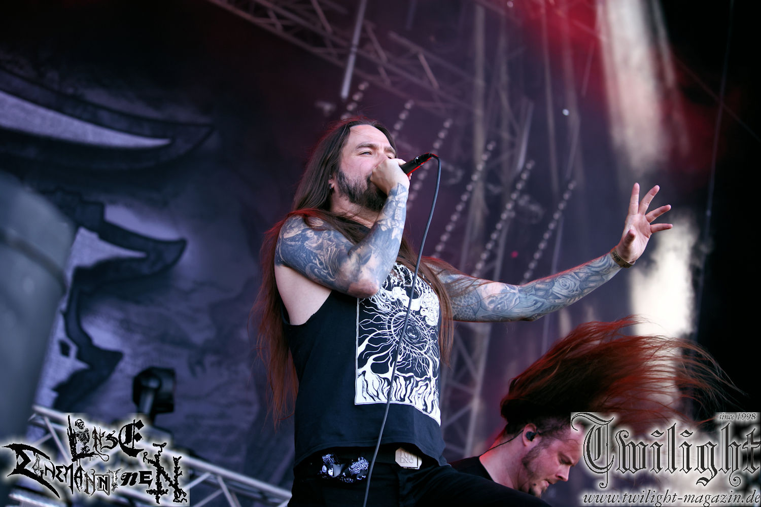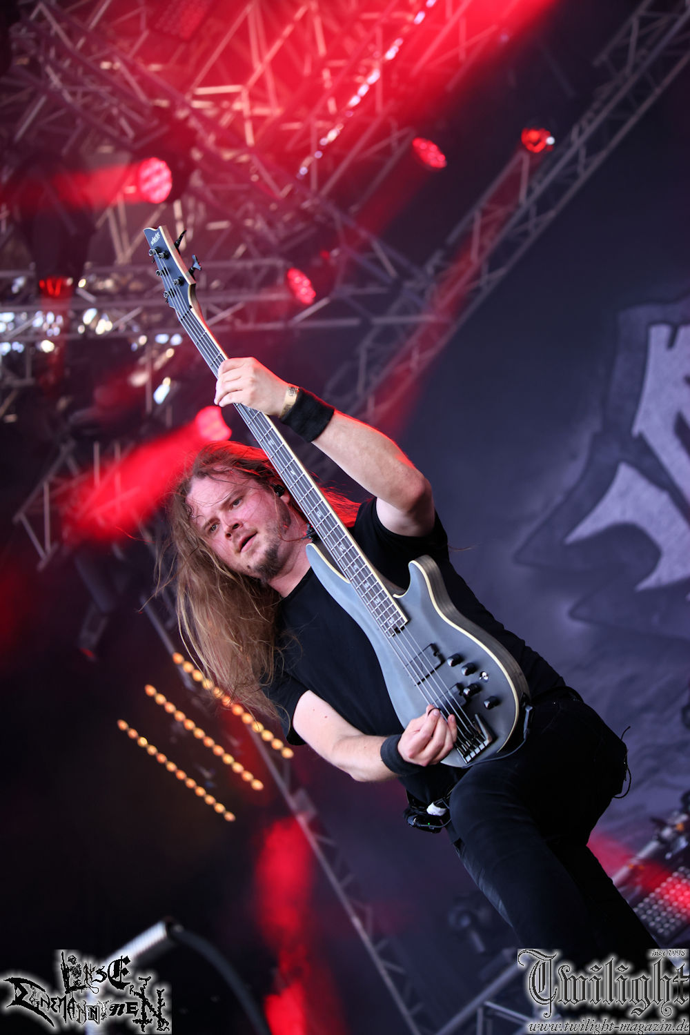 Nachdem ich mich schon die ganze Zeit tierisch darauf gefreut habe, ist es jetzt nun endlich soweit, denn die umwerfenden Night In Gales werden gleich im Zelt loslegen. Ich finde diese Melodic Death Metal - Institution ja wirklich einfach nur genial und ihr Sound ist für mich wunderbar, weshalb ich mich auch erneut mit frischem Bier in der ersten Reihe positioniert habe. Da muss ich einfach ganz vorne mit dabei sein und ich bin echt gespannt, welche Songs sie aus ihrem reichen Fundus wohl spielen werden, immerhin stehen ihnen nur 30 Minuten zur Verfügung. Mein Plan nicht ganz so betrunken zu sein, wie bei ihrem Gig zum 30. Geburtstag von Final Cry in Hannover, ist nicht so ganz aufgegangen, aber immer noch besser als das In Blackest Velvet, Night In Gales, Dew-Scented-Konzert 2001 in Salzgitter im Forellenhof, denn da kann ich mich nur noch teilweise an Dew-Scented erinnern. Egal, denn es geht endlich los und Christian (Gesang), Tobias (Bass), Adriano (Drums) und die Brüder Frank und Jens (beide Gitarre) betreten zu einem schönen Intro sichtlich motiviert die in blaues Licht und Nebel gehüllte sowie jeweils links und rechts von sehr cool aussehenden Sidedrops eingegrenzte Bühne mit dem grandiosen Bandlogo im Hintergrund und legen los. Und zwar mit „Dawnlight Garden“, dem Titelsongs ihres Albums von 2020. Knaller! Gepackt in einen wirklich sehr geilen und fetten Livesound macht sich schon beim ersten Song die große Stärke dieser Band sofort bemerkbar: Umwerfende, packende und emotional sehr mitreißende Melodien gepaart mit bestem Death Metal. Also die ursprüngliche Melo-Death-Schule, so wie ich sie liebe. Anfang der 2000er hatte sich die Band vom Sound her zwar etwas geöffnet, aber für sich festgestellt, dass nur die alte Lehre für sie Sinn macht (nachzulesen im famosen Mørkeskye – Anm. d. Verf.). Das stellen sie mit dem nun folgenden „The Spears Within“ von 2018 mächtig unter Beweis. Wie bereits erwähnt, hat die Band echt Bock, ist bewegungsfreudig und ordentlich am Bangen und Posen, dass es eine wahre Augenfreude ist. Hier wird nicht nur runtergezockt, sondern der eigene Sound erlebt und ausgelebt. Bei solch einer umwerfenden Musik, kann auch keiner unberührt bleiben und um mich herum sehe ich nur strahlende Gesichter und das Zelt ist auch so richtig gut gefüllt. Klasse, das freut mich für die Jungs wirklich sehr. Weiter geht es mit der Hymne „Into The Evergrey“ vom aktuellen Killeralbum „Shadowreaper“. Der Song ist echt sowas von geil, Leute. Als ich das erste Mal das Video sah und hörte, fühlte ich mich sofort in die 90er zurück versetzt, als ich als Teenager vor meiner Anlage saß und mich ergriffen dem Göteborg-Sound hingab. Das ist jetzt nicht anders und ich komme vor Freude gar nicht mehr aus dem Strahlen heraus. Danke dafür Jungs! Kollege Dunemann ist jetzt auch wieder mit dem Fotografieren fertig, hat sich zu mir nach vorne gesellt und mein Vornamensvetter ist ebenfalls anwesend und so feiern wir die Band jetzt gemeinsam ab. „Transition To Doom“ ist dafür auch wie gemacht. Im Rausch der Freude fordern Dunemann und ich den Klassiker „Razor“ und wir haben tatsächlich Glück und nicht nur wir sind entzückt, dass der Song jetzt kommt. Die Stimmung im Zelt kocht und das nicht nur wegen der Hitze. Und dem nicht genug, denn der nächste Klassiker wird uns um unsere Ohren gezimmert, nämlich „Autumn Water“ von „Towards The Twilight“. Wie schön und wenn Night In Gales schon in der alten Schatzkiste kramen, servieren sie uns dann auch noch „Sylphlike“! Ganz grooooßes Kino! Was für ein herrlich intensives und mitreißendes Konzert. Aber auch dieses geht leider irgendwann zu Ende und wird mit einem Klassiker beendet. Aber kein eigener, denn es gibt Iron Maiden ,mit ihrem gleichnamigen Song auf die Ohren und so gehen alle nochmal ordentlich ab und verlassen mehr als zufrieden das Zelt. Danke für dieses tolle Konzert Night In Gales! Ich bin zutiefst zufrieden. Und falls Night In Gales bei euch bisher unter dem Radar liefen und ihr Fans von mitreißenden feurigen, intensiven und von Herzblut angetriebenen Melodic Death Metal der alten Schule seid, ist diese Band für euch Pflicht!