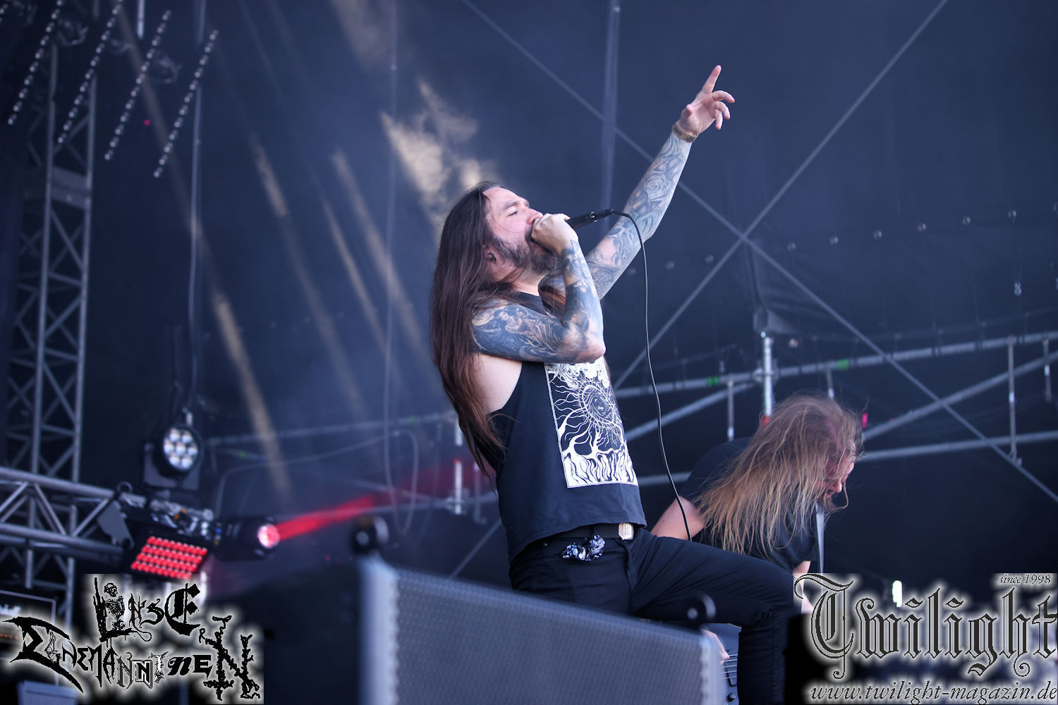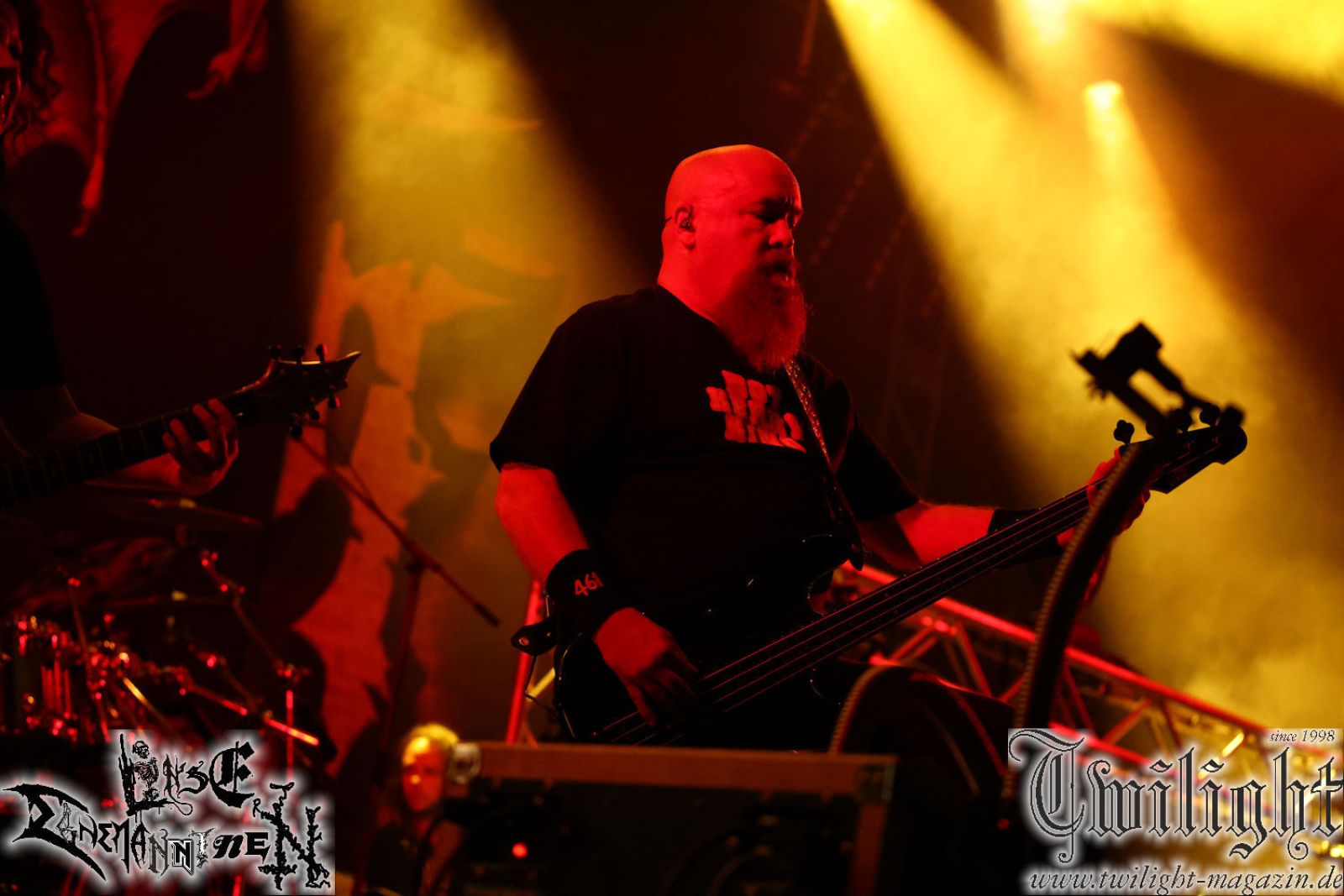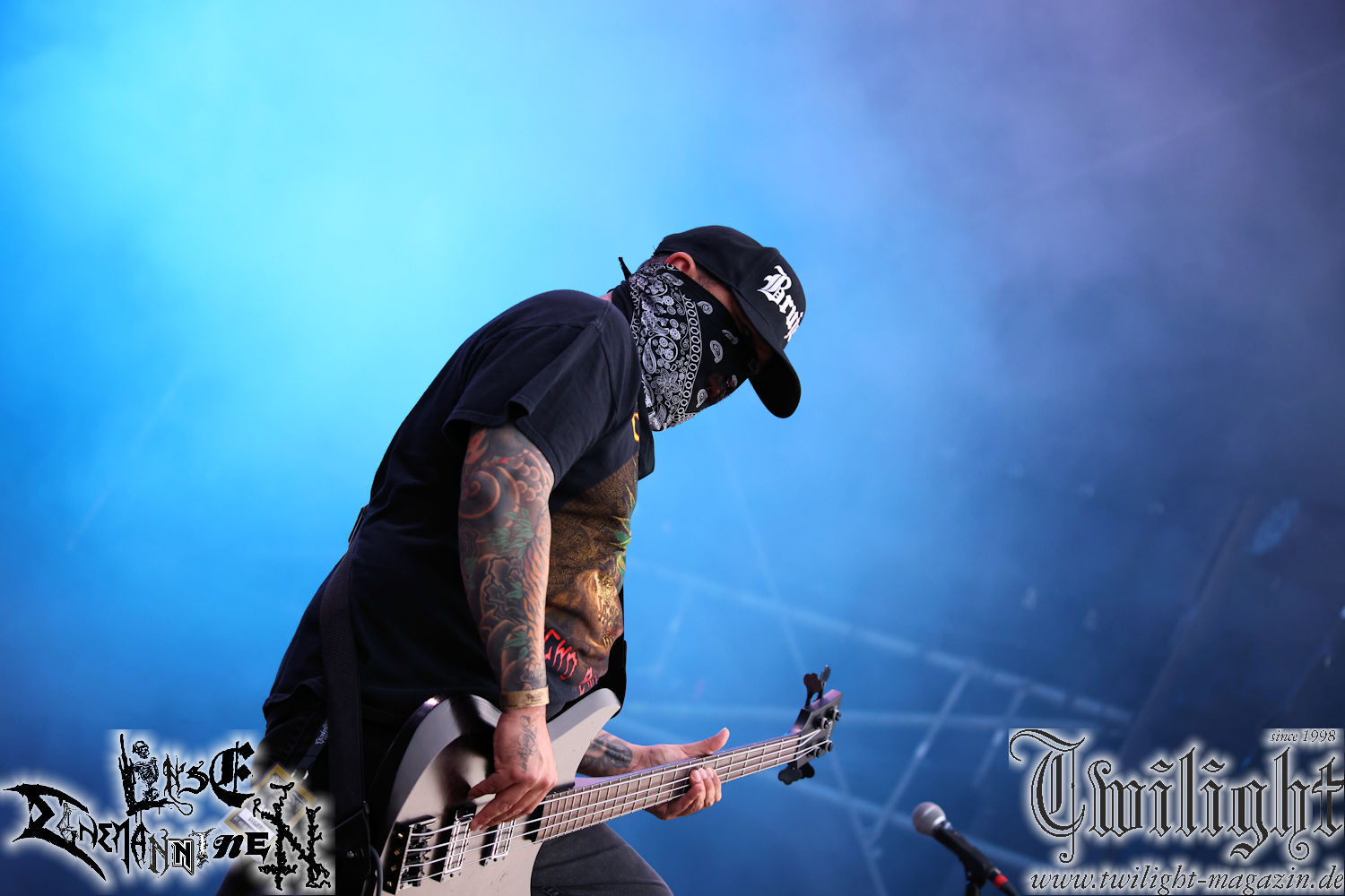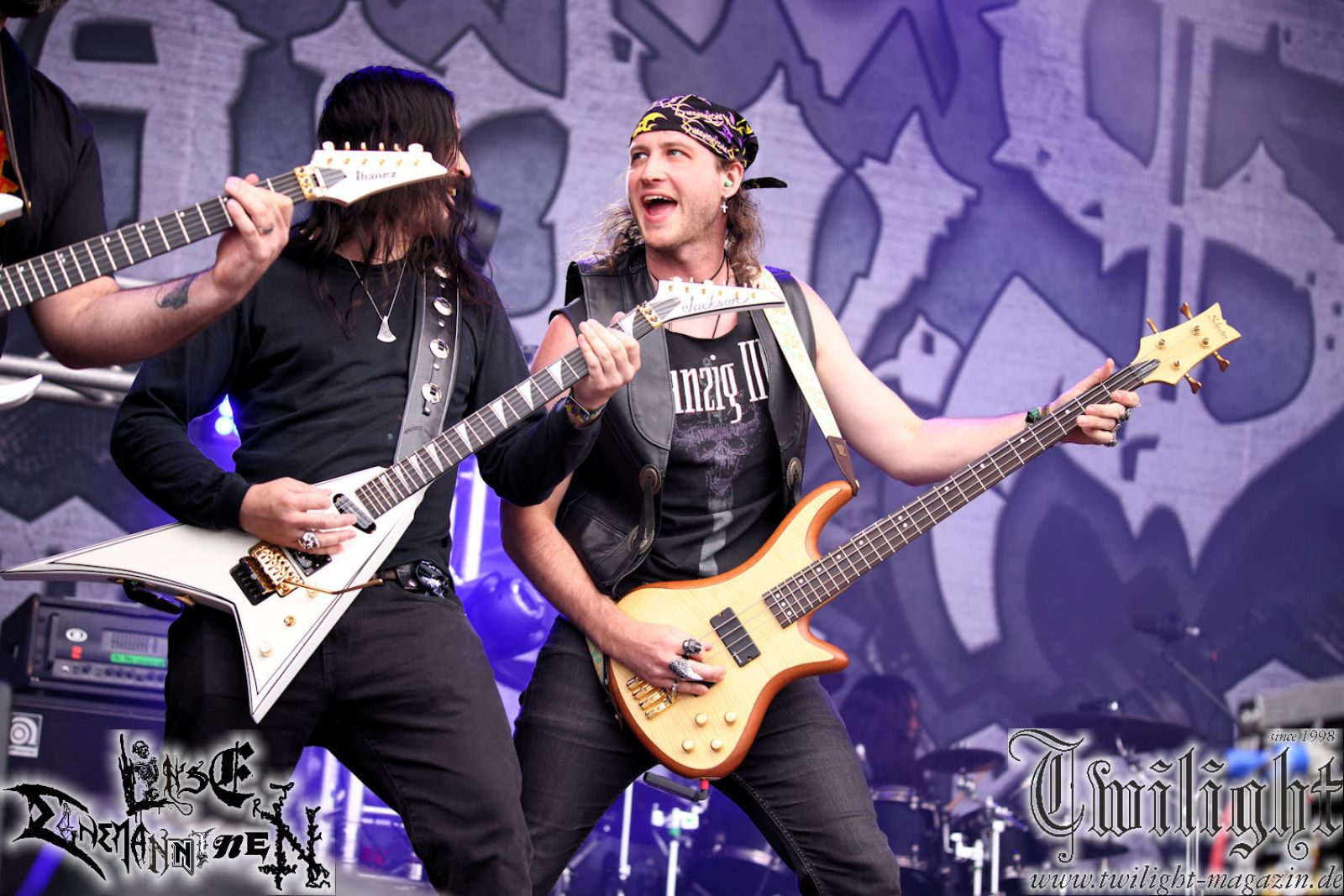 Nachdem ich mich schon die ganze Zeit tierisch darauf gefreut habe, ist es jetzt nun endlich soweit, denn die umwerfenden Night In Gales werden gleich im Zelt loslegen. Ich finde diese Melodic Death Metal - Institution ja wirklich einfach nur genial und ihr Sound ist für mich wunderbar, weshalb ich mich auch erneut mit frischem Bier in der ersten Reihe positioniert habe. Da muss ich einfach ganz vorne mit dabei sein und ich bin echt gespannt, welche Songs sie aus ihrem reichen Fundus wohl spielen werden, immerhin stehen ihnen nur 30 Minuten zur Verfügung. Mein Plan nicht ganz so betrunken zu sein, wie bei ihrem Gig zum 30. Geburtstag von Final Cry in Hannover, ist nicht so ganz aufgegangen, aber immer noch besser als das In Blackest Velvet, Night In Gales, Dew-Scented-Konzert 2001 in Salzgitter im Forellenhof, denn da kann ich mich nur noch teilweise an Dew-Scented erinnern. Egal, denn es geht endlich los und Christian (Gesang), Tobias (Bass), Adriano (Drums) und die Brüder Frank und Jens (beide Gitarre) betreten zu einem schönen Intro sichtlich motiviert die in blaues Licht und Nebel gehüllte sowie jeweils links und rechts von sehr cool aussehenden Sidedrops eingegrenzte Bühne mit dem grandiosen Bandlogo im Hintergrund und legen los. Und zwar mit „Dawnlight Garden“, dem Titelsongs ihres Albums von 2020. Knaller! Gepackt in einen wirklich sehr geilen und fetten Livesound macht sich schon beim ersten Song die große Stärke dieser Band sofort bemerkbar: Umwerfende, packende und emotional sehr mitreißende Melodien gepaart mit bestem Death Metal. Also die ursprüngliche Melo-Death-Schule, so wie ich sie liebe. Anfang der 2000er hatte sich die Band vom Sound her zwar etwas geöffnet, aber für sich festgestellt, dass nur die alte Lehre für sie Sinn macht (nachzulesen im famosen Mørkeskye – Anm. d. Verf.). Das stellen sie mit dem nun folgenden „The Spears Within“ von 2018 mächtig unter Beweis. Wie bereits erwähnt, hat die Band echt Bock, ist bewegungsfreudig und ordentlich am Bangen und Posen, dass es eine wahre Augenfreude ist. Hier wird nicht nur runtergezockt, sondern der eigene Sound erlebt und ausgelebt. Bei solch einer umwerfenden Musik, kann auch keiner unberührt bleiben und um mich herum sehe ich nur strahlende Gesichter und das Zelt ist auch so richtig gut gefüllt. Klasse, das freut mich für die Jungs wirklich sehr. Weiter geht es mit der Hymne „Into The Evergrey“ vom aktuellen Killeralbum „Shadowreaper“. Der Song ist echt sowas von geil, Leute. Als ich das erste Mal das Video sah und hörte, fühlte ich mich sofort in die 90er zurück versetzt, als ich als Teenager vor meiner Anlage saß und mich ergriffen dem Göteborg-Sound hingab. Das ist jetzt nicht anders und ich komme vor Freude gar nicht mehr aus dem Strahlen heraus. Danke dafür Jungs! Kollege Dunemann ist jetzt auch wieder mit dem Fotografieren fertig, hat sich zu mir nach vorne gesellt und mein Vornamensvetter ist ebenfalls anwesend und so feiern wir die Band jetzt gemeinsam ab. „Transition To Doom“ ist dafür auch wie gemacht. Im Rausch der Freude fordern Dunemann und ich den Klassiker „Razor“ und wir haben tatsächlich Glück und nicht nur wir sind entzückt, dass der Song jetzt kommt. Die Stimmung im Zelt kocht und das nicht nur wegen der Hitze. Und dem nicht genug, denn der nächste Klassiker wird uns um unsere Ohren gezimmert, nämlich „Autumn Water“ von „Towards The Twilight“. Wie schön und wenn Night In Gales schon in der alten Schatzkiste kramen, servieren sie uns dann auch noch „Sylphlike“! Ganz grooooßes Kino! Was für ein herrlich intensives und mitreißendes Konzert. Aber auch dieses geht leider irgendwann zu Ende und wird mit einem Klassiker beendet. Aber kein eigener, denn es gibt Iron Maiden ,mit ihrem gleichnamigen Song auf die Ohren und so gehen alle nochmal ordentlich ab und verlassen mehr als zufrieden das Zelt. Danke für dieses tolle Konzert Night In Gales! Ich bin zutiefst zufrieden. Und falls Night In Gales bei euch bisher unter dem Radar liefen und ihr Fans von mitreißenden feurigen, intensiven und von Herzblut angetriebenen Melodic Death Metal der alten Schule seid, ist diese Band für euch Pflicht!