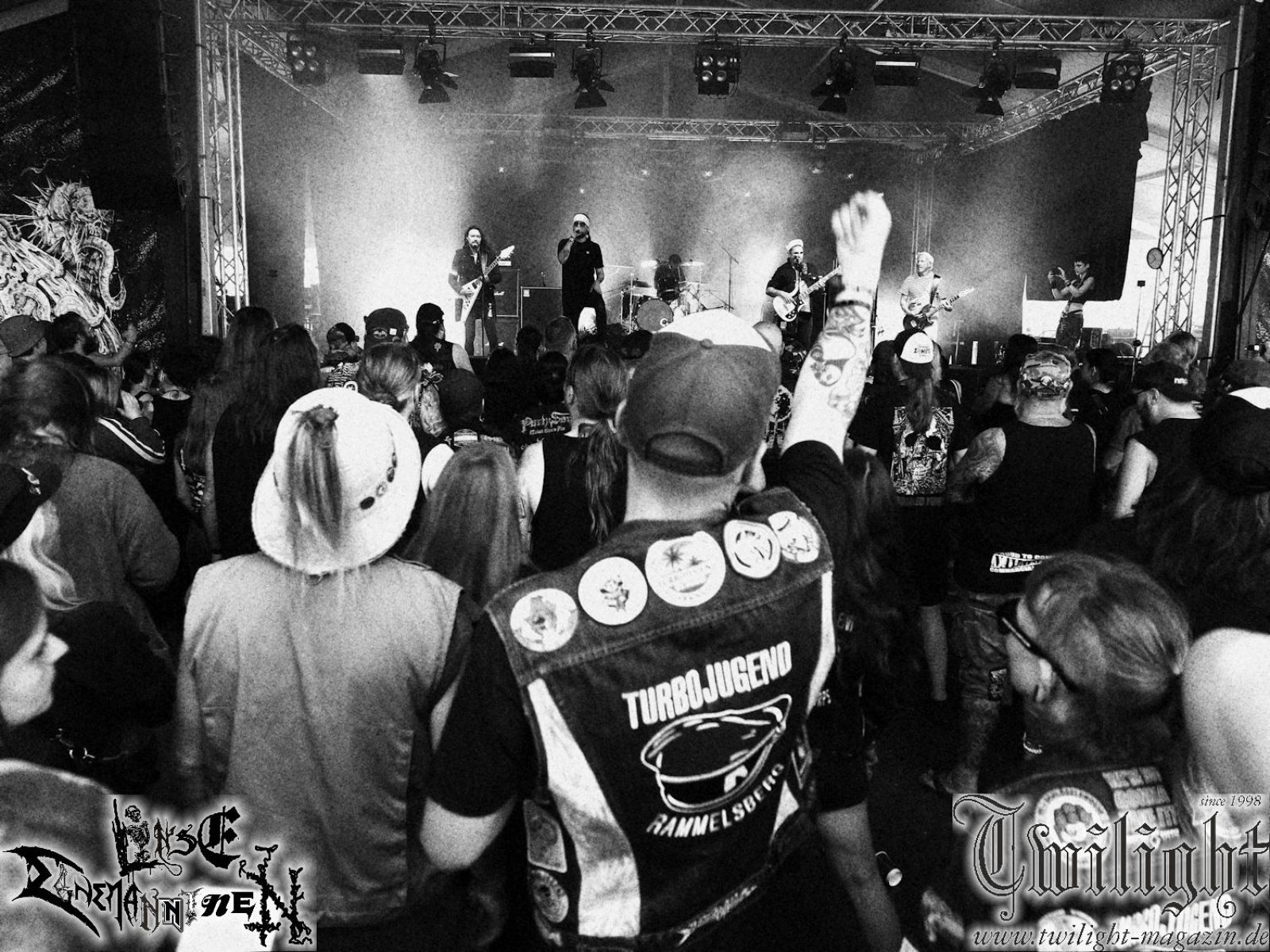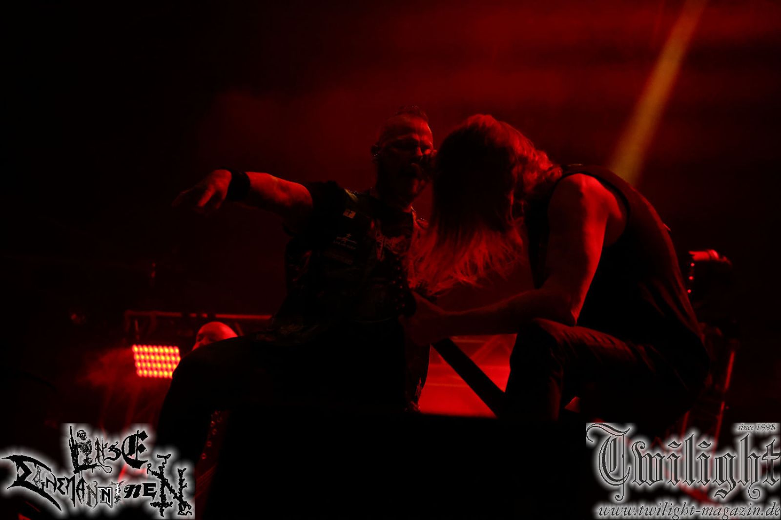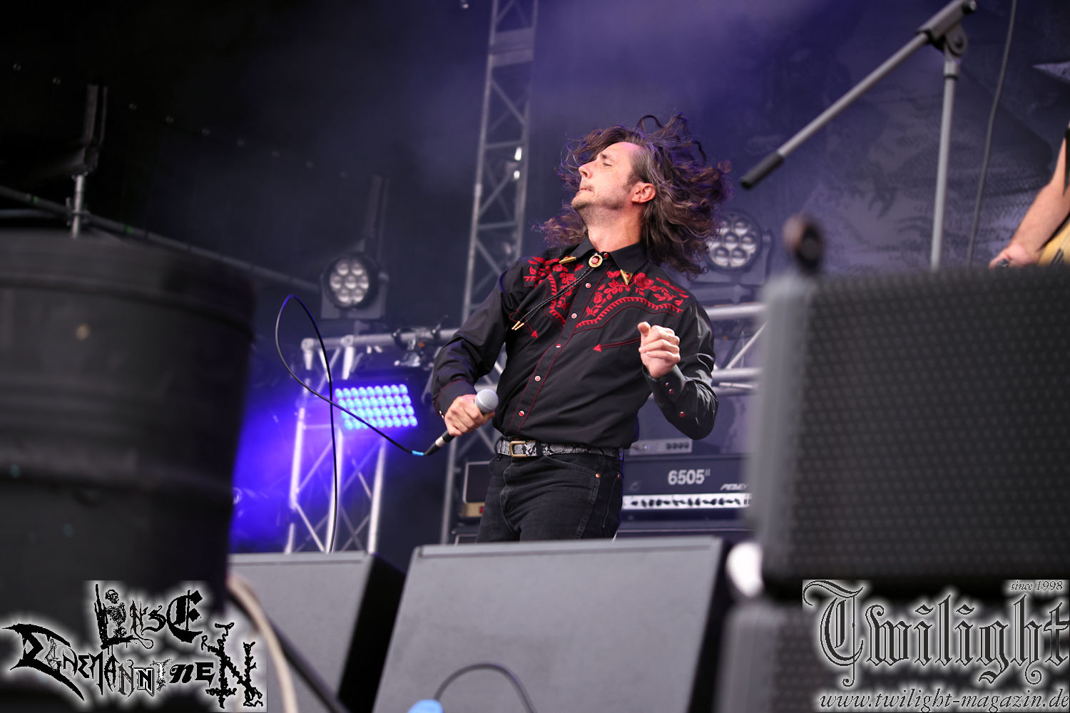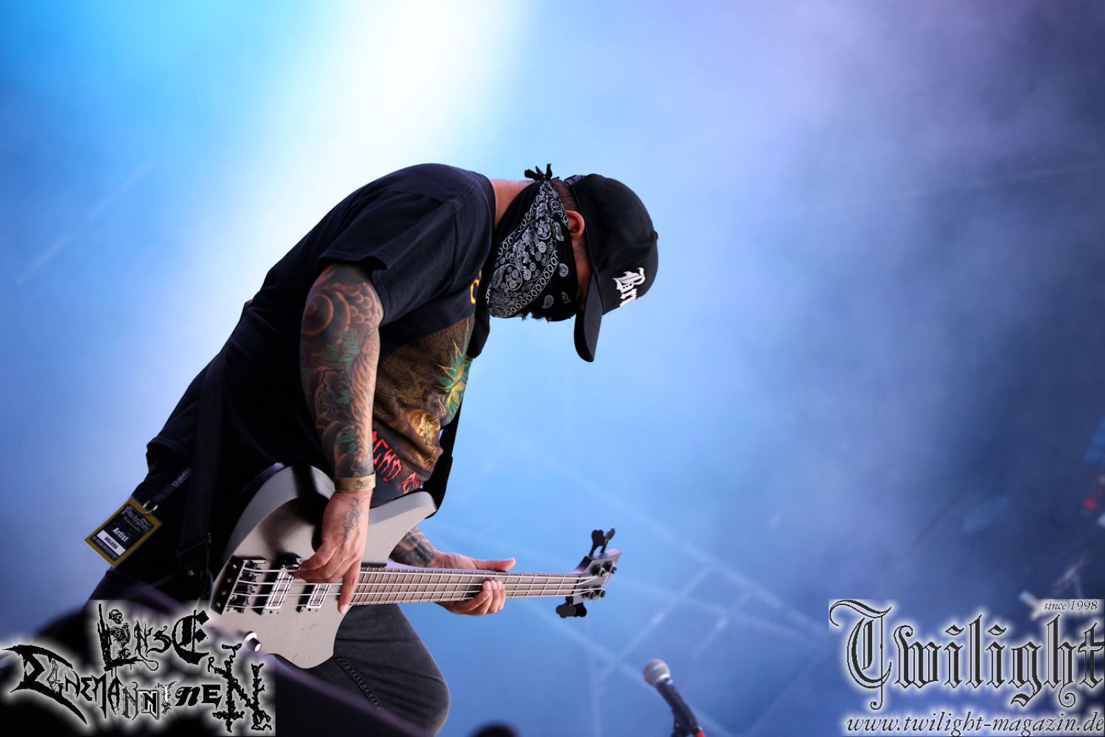 Nachdem ich mich schon die ganze Zeit tierisch darauf gefreut habe, ist es jetzt nun endlich soweit, denn die umwerfenden Night In Gales werden gleich im Zelt loslegen. Ich finde diese Melodic Death Metal - Institution ja wirklich einfach nur genial und ihr Sound ist für mich wunderbar, weshalb ich mich auch erneut mit frischem Bier in der ersten Reihe positioniert habe. Da muss ich einfach ganz vorne mit dabei sein und ich bin echt gespannt, welche Songs sie aus ihrem reichen Fundus wohl spielen werden, immerhin stehen ihnen nur 30 Minuten zur Verfügung. Mein Plan nicht ganz so betrunken zu sein, wie bei ihrem Gig zum 30. Geburtstag von Final Cry in Hannover, ist nicht so ganz aufgegangen, aber immer noch besser als das In Blackest Velvet, Night In Gales, Dew-Scented-Konzert 2001 in Salzgitter im Forellenhof, denn da kann ich mich nur noch teilweise an Dew-Scented erinnern. Egal, denn es geht endlich los und Christian (Gesang), Tobias (Bass), Adriano (Drums) und die Brüder Frank und Jens (beide Gitarre) betreten zu einem schönen Intro sichtlich motiviert die in blaues Licht und Nebel gehüllte sowie jeweils links und rechts von sehr cool aussehenden Sidedrops eingegrenzte Bühne mit dem grandiosen Bandlogo im Hintergrund und legen los. Und zwar mit „Dawnlight Garden“, dem Titelsongs ihres Albums von 2020. Knaller! Gepackt in einen wirklich sehr geilen und fetten Livesound macht sich schon beim ersten Song die große Stärke dieser Band sofort bemerkbar: Umwerfende, packende und emotional sehr mitreißende Melodien gepaart mit bestem Death Metal. Also die ursprüngliche Melo-Death-Schule, so wie ich sie liebe. Anfang der 2000er hatte sich die Band vom Sound her zwar etwas geöffnet, aber für sich festgestellt, dass nur die alte Lehre für sie Sinn macht (nachzulesen im famosen Mørkeskye – Anm. d. Verf.). Das stellen sie mit dem nun folgenden „The Spears Within“ von 2018 mächtig unter Beweis. Wie bereits erwähnt, hat die Band echt Bock, ist bewegungsfreudig und ordentlich am Bangen und Posen, dass es eine wahre Augenfreude ist. Hier wird nicht nur runtergezockt, sondern der eigene Sound erlebt und ausgelebt. Bei solch einer umwerfenden Musik, kann auch keiner unberührt bleiben und um mich herum sehe ich nur strahlende Gesichter und das Zelt ist auch so richtig gut gefüllt. Klasse, das freut mich für die Jungs wirklich sehr. Weiter geht es mit der Hymne „Into The Evergrey“ vom aktuellen Killeralbum „Shadowreaper“. Der Song ist echt sowas von geil, Leute. Als ich das erste Mal das Video sah und hörte, fühlte ich mich sofort in die 90er zurück versetzt, als ich als Teenager vor meiner Anlage saß und mich ergriffen dem Göteborg-Sound hingab. Das ist jetzt nicht anders und ich komme vor Freude gar nicht mehr aus dem Strahlen heraus. Danke dafür Jungs! Kollege Dunemann ist jetzt auch wieder mit dem Fotografieren fertig, hat sich zu mir nach vorne gesellt und mein Vornamensvetter ist ebenfalls anwesend und so feiern wir die Band jetzt gemeinsam ab. „Transition To Doom“ ist dafür auch wie gemacht. Im Rausch der Freude fordern Dunemann und ich den Klassiker „Razor“ und wir haben tatsächlich Glück und nicht nur wir sind entzückt, dass der Song jetzt kommt. Die Stimmung im Zelt kocht und das nicht nur wegen der Hitze. Und dem nicht genug, denn der nächste Klassiker wird uns um unsere Ohren gezimmert, nämlich „Autumn Water“ von „Towards The Twilight“. Wie schön und wenn Night In Gales schon in der alten Schatzkiste kramen, servieren sie uns dann auch noch „Sylphlike“! Ganz grooooßes Kino! Was für ein herrlich intensives und mitreißendes Konzert. Aber auch dieses geht leider irgendwann zu Ende und wird mit einem Klassiker beendet. Aber kein eigener, denn es gibt Iron Maiden ,mit ihrem gleichnamigen Song auf die Ohren und so gehen alle nochmal ordentlich ab und verlassen mehr als zufrieden das Zelt. Danke für dieses tolle Konzert Night In Gales! Ich bin zutiefst zufrieden. Und falls Night In Gales bei euch bisher unter dem Radar liefen und ihr Fans von mitreißenden feurigen, intensiven und von Herzblut angetriebenen Melodic Death Metal der alten Schule seid, ist diese Band für euch Pflicht!