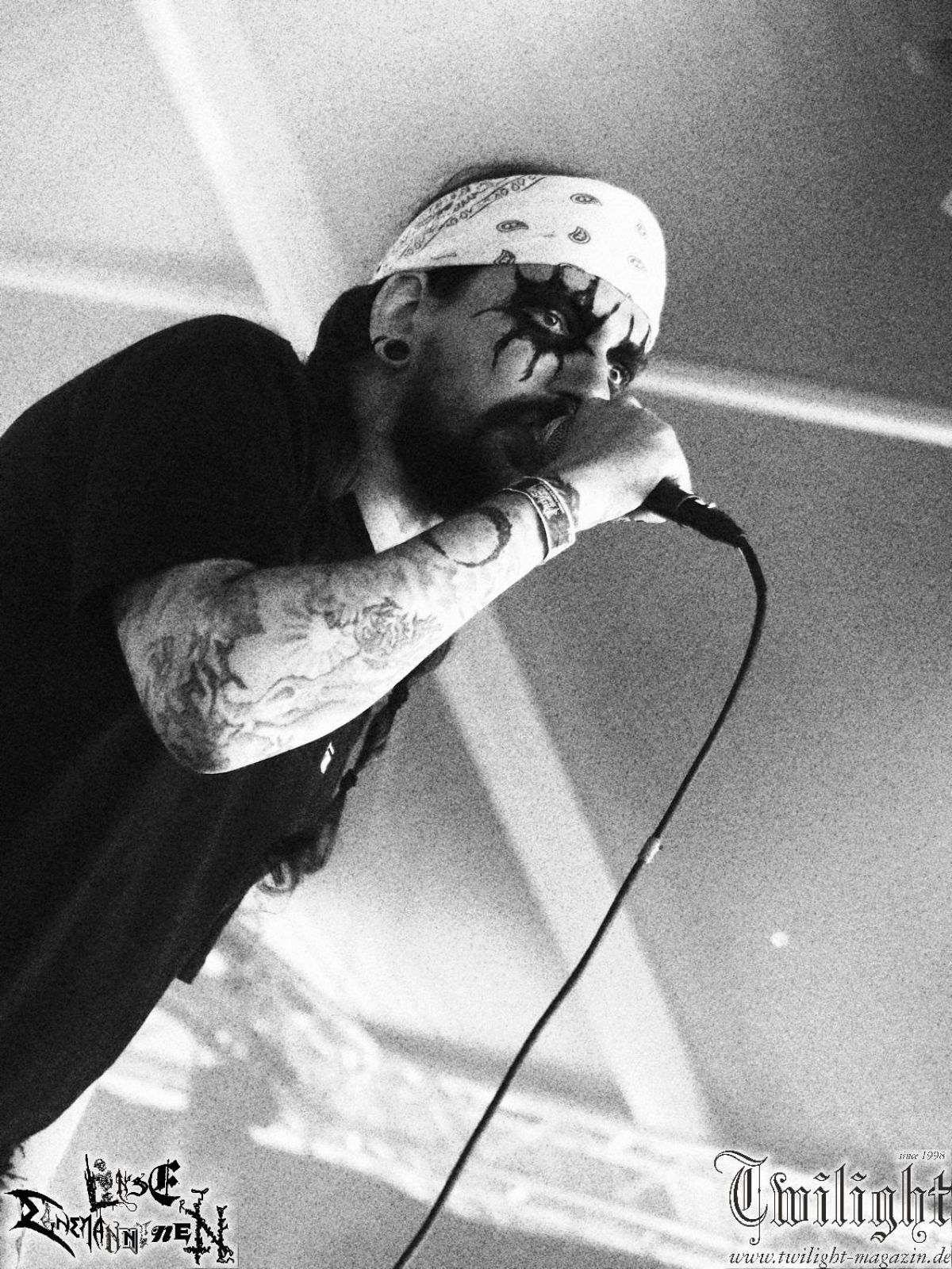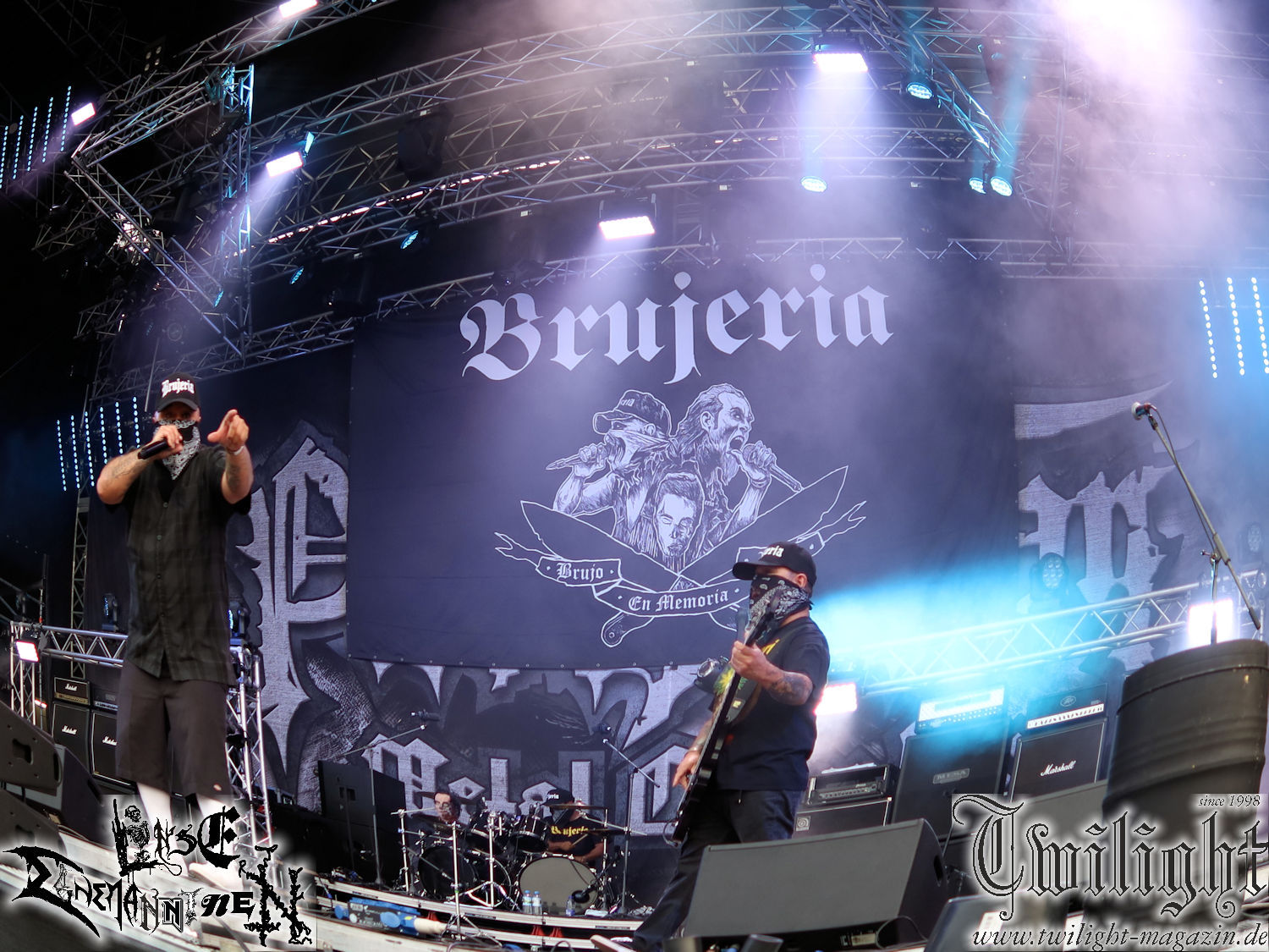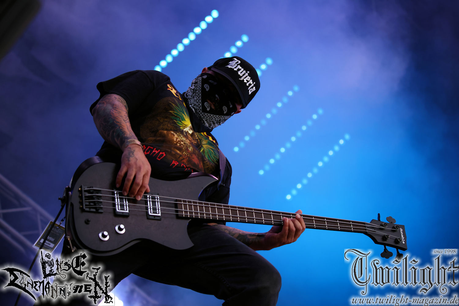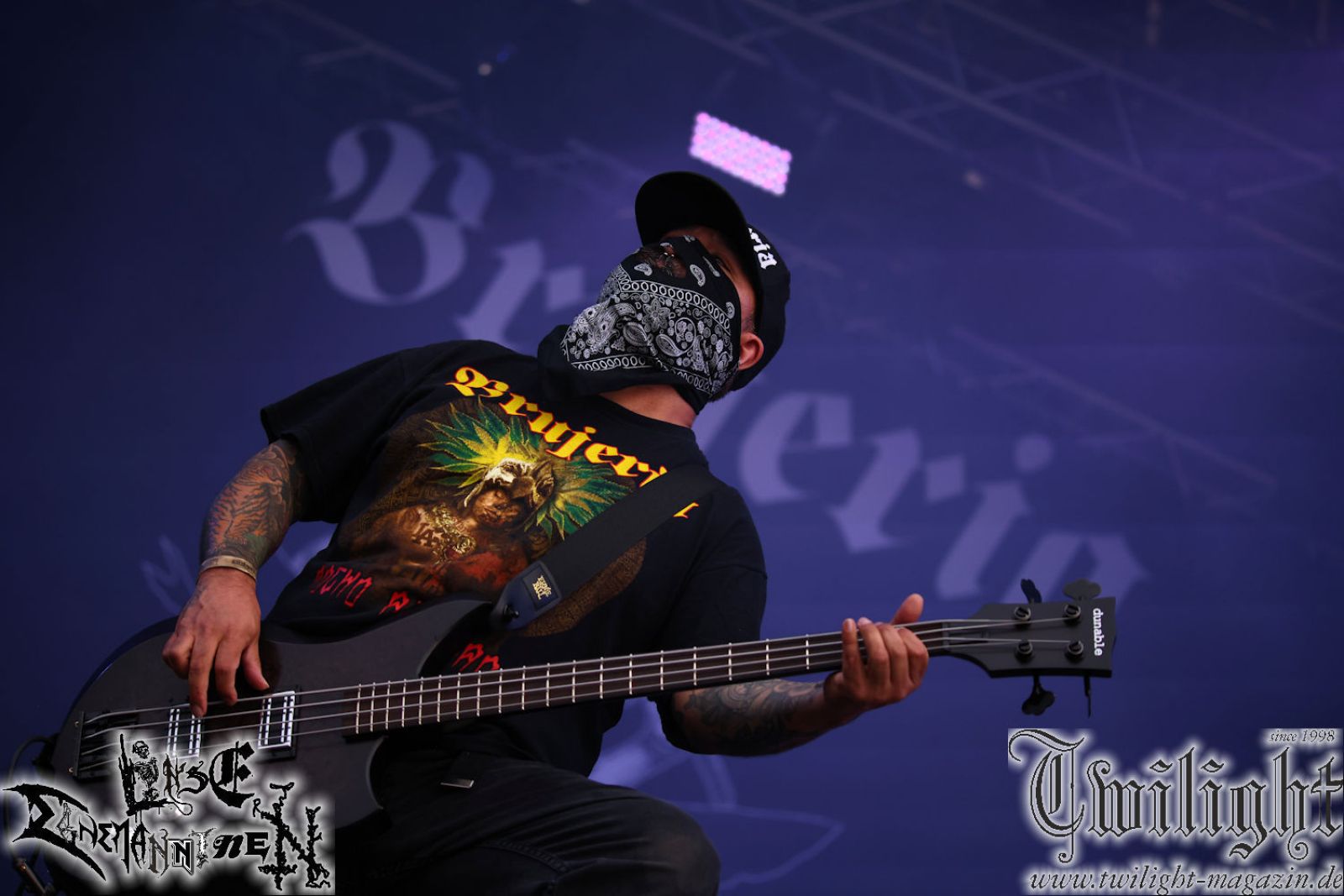 Nachdem ich mich schon die ganze Zeit tierisch darauf gefreut habe, ist es jetzt nun endlich soweit, denn die umwerfenden Night In Gales werden gleich im Zelt loslegen. Ich finde diese Melodic Death Metal - Institution ja wirklich einfach nur genial und ihr Sound ist für mich wunderbar, weshalb ich mich auch erneut mit frischem Bier in der ersten Reihe positioniert habe. Da muss ich einfach ganz vorne mit dabei sein und ich bin echt gespannt, welche Songs sie aus ihrem reichen Fundus wohl spielen werden, immerhin stehen ihnen nur 30 Minuten zur Verfügung. Mein Plan nicht ganz so betrunken zu sein, wie bei ihrem Gig zum 30. Geburtstag von Final Cry in Hannover, ist nicht so ganz aufgegangen, aber immer noch besser als das In Blackest Velvet, Night In Gales, Dew-Scented-Konzert 2001 in Salzgitter im Forellenhof, denn da kann ich mich nur noch teilweise an Dew-Scented erinnern. Egal, denn es geht endlich los und Christian (Gesang), Tobias (Bass), Adriano (Drums) und die Brüder Frank und Jens (beide Gitarre) betreten zu einem schönen Intro sichtlich motiviert die in blaues Licht und Nebel gehüllte sowie jeweils links und rechts von sehr cool aussehenden Sidedrops eingegrenzte Bühne mit dem grandiosen Bandlogo im Hintergrund und legen los. Und zwar mit „Dawnlight Garden“, dem Titelsongs ihres Albums von 2020. Knaller! Gepackt in einen wirklich sehr geilen und fetten Livesound macht sich schon beim ersten Song die große Stärke dieser Band sofort bemerkbar: Umwerfende, packende und emotional sehr mitreißende Melodien gepaart mit bestem Death Metal. Also die ursprüngliche Melo-Death-Schule, so wie ich sie liebe. Anfang der 2000er hatte sich die Band vom Sound her zwar etwas geöffnet, aber für sich festgestellt, dass nur die alte Lehre für sie Sinn macht (nachzulesen im famosen Mørkeskye – Anm. d. Verf.). Das stellen sie mit dem nun folgenden „The Spears Within“ von 2018 mächtig unter Beweis. Wie bereits erwähnt, hat die Band echt Bock, ist bewegungsfreudig und ordentlich am Bangen und Posen, dass es eine wahre Augenfreude ist. Hier wird nicht nur runtergezockt, sondern der eigene Sound erlebt und ausgelebt. Bei solch einer umwerfenden Musik, kann auch keiner unberührt bleiben und um mich herum sehe ich nur strahlende Gesichter und das Zelt ist auch so richtig gut gefüllt. Klasse, das freut mich für die Jungs wirklich sehr. Weiter geht es mit der Hymne „Into The Evergrey“ vom aktuellen Killeralbum „Shadowreaper“. Der Song ist echt sowas von geil, Leute. Als ich das erste Mal das Video sah und hörte, fühlte ich mich sofort in die 90er zurück versetzt, als ich als Teenager vor meiner Anlage saß und mich ergriffen dem Göteborg-Sound hingab. Das ist jetzt nicht anders und ich komme vor Freude gar nicht mehr aus dem Strahlen heraus. Danke dafür Jungs! Kollege Dunemann ist jetzt auch wieder mit dem Fotografieren fertig, hat sich zu mir nach vorne gesellt und mein Vornamensvetter ist ebenfalls anwesend und so feiern wir die Band jetzt gemeinsam ab. „Transition To Doom“ ist dafür auch wie gemacht. Im Rausch der Freude fordern Dunemann und ich den Klassiker „Razor“ und wir haben tatsächlich Glück und nicht nur wir sind entzückt, dass der Song jetzt kommt. Die Stimmung im Zelt kocht und das nicht nur wegen der Hitze. Und dem nicht genug, denn der nächste Klassiker wird uns um unsere Ohren gezimmert, nämlich „Autumn Water“ von „Towards The Twilight“. Wie schön und wenn Night In Gales schon in der alten Schatzkiste kramen, servieren sie uns dann auch noch „Sylphlike“! Ganz grooooßes Kino! Was für ein herrlich intensives und mitreißendes Konzert. Aber auch dieses geht leider irgendwann zu Ende und wird mit einem Klassiker beendet. Aber kein eigener, denn es gibt Iron Maiden ,mit ihrem gleichnamigen Song auf die Ohren und so gehen alle nochmal ordentlich ab und verlassen mehr als zufrieden das Zelt. Danke für dieses tolle Konzert Night In Gales! Ich bin zutiefst zufrieden. Und falls Night In Gales bei euch bisher unter dem Radar liefen und ihr Fans von mitreißenden feurigen, intensiven und von Herzblut angetriebenen Melodic Death Metal der alten Schule seid, ist diese Band für euch Pflicht!