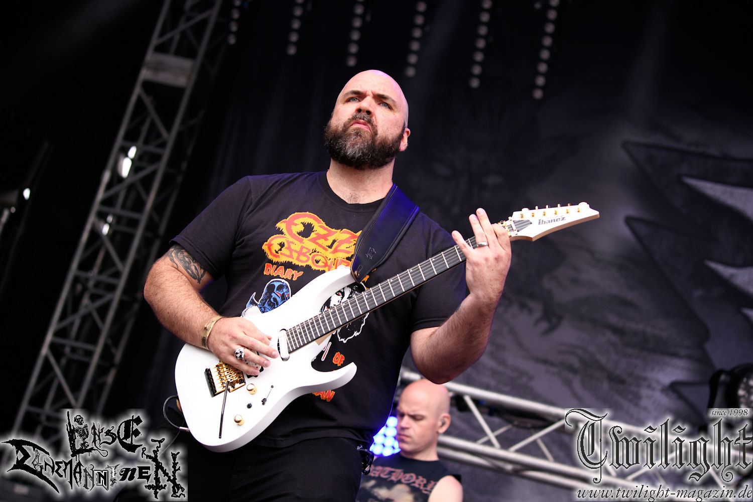 Und nun kommen wir zu einem Konzert, auf das ich mich schon seit dem letzten Party.San freue, als ich las, dass sie dieses Jahr hier spielen. Die Rede ist von den wirklich umwerfenden Death Metallern Nightbearer, die ich ja schon seit Jahren abfeiere, deren Scheiben regelmäßig bei mir laufen und die mit ihrem aktuellen Longplayer „Defiance“ wirklich ein absolutes Meisterwerk abgeliefert haben. Deswegen darf ich natürlich keinen Moment davon im Zelt verpassen. Da sind die angestaute Hitze und die verbrauchte Luft im Zelt nicht von Relevanz und so stehe ich nun mit zwei frisch gezapften Köstritzer, welches mir die immer nette und freundliche Thekencrew (muss ja auch mal erwähnt werden) soeben kredenzte, in der ersten Reihe und freue mich auf das was nun kommen wird, denn ich habe Nightbearer tatsächlich noch nie live gesehen. Mit den Klängen zu „Dust“ betreten Michael Torka (Gesang), Dominik Hellmuth (Leadgitarre), Manuel Lüke (Drums), Florian Böhmfeld (Bass) und Tristan Schubert (Rhythmusgitarre) in blauem Licht gehüllt die Bühne und was dann kommt übertrifft meine kühnsten Erwartungen, denn die kommende halbe Stunde wird einfach nur ein Traum. Ausgestattet mit einem umwerfenden und schön differenzierten Sound reißt die Band sehr präzise eine Lehrstunde im Fach klassischer Old School Death Metal der schwedischen Art und grandiosen Melodien ab, denn nach dem Intro geht es auch gleich wie auf „Defiance“ mit dem umwerfenden „His Dark Materials“ weiter und es ist einfach nur herrlich, das live erleben zu dürfen. Gerade das abschließende Solo mit Blind Guardian-mäßiger Melodie ist einfach nur Gänsehaut pur. Es ist der Band auch eindeutig anzumerken, dass das nicht ihr erstes Konzert ist und so legen sie all ihre Erfahrungen in diesen Gig, denn sie wissen genau, dass das gerade IHR Moment ist, und geben wirklich alles und ich spüre diese Euphorie und Energie eindeutig, lasse mich von ihr anstecken und genieße wirklich jeden Moment dieses absolut grandioses Konzertes. Da stört auch die heftige Hitze und die stickige Luft im Zelt zu keinem Moment. Hier regiert der Death Metal der alten Schule in allerhöchster Qualität, was ich mit akkuratem Abgehen liebend gerne unterstütze. Die Jungs haben echt Bock, bewegen sich ordentlich auf der Bühne und lassen ihre Nackenwirbel gut rotieren. Sowas mag ich ja, wenn die Band nicht nur rumsteht und ihr Set runterzieht, sondern in ihrer Musik aufgeht und auch selber Bock hat, ordentlich abzugehen. Die Euphorie ist auch in Michas Ansagen zu spüren und so führt er uns gut gelaunt durch das Konzert. Als nächstes steht „The Dragon Reborn“ vom Zweitling „Ghosts Of A Darkness To Come“ an der Reihe. Noch so ein geiler Song. Ich komme aus dem Grinsen gar nicht mehr heraus. Zwischendurch drehe ich mich immer wieder mal um und sehe nur strahlende Gesichter in einem zum bersten gefüllten Zelt! Der Hammer und wirklich absolut verdient, denn Nightbearer sind Herzblut pur. Ein breites Grinsen ist auch der Band ins Gesicht gezimmert, die überwältigt von unserer Resonanz sichtlich ergriffen ist. „Lycanthrophic Death Squad“, der Hit des ersten Longplayers „Tales Of Sorcery And Death“ folgen als nächstes und bei diesem Groovemonster gibt es wirklich kein Halten mehr. Killer! Richtig gelungen finde ich auch die Lightshow während des gesamten Konzerts, die die Stimmung toll untermalt und von den Farben her, meiner Meinung nach die dominanten Farbtöne der Artworks ihrer drei Longplayer nutzt. Sieht echt cool aus. Wenn wir schon beim Debüt sind, geht es mit dessen Opener „Beware The Necromancer“ auch gleich weiter. Mittlerweile hat mein Kumpel Dunemann seine Bilder gemacht und sich mit einer lecker Gerstensaftkaltschale zu mir gesellt. Sehr schön, denn mit guten Freunden macht das Abgehen doch am meisten Spaß. Gerade wenn es sich um so geilen Todesblei wie den von Nightbearer handelt. Meine Freude ist wahrlich riesengroß. Was für ein tolles Konzert. Welches ja leider viel zu kurz ist und so wird mit „Dying Knows No Bound“ vom aktuellen Album der leider schon vorletzte Song angekündigt. Wehmut ist hier aber fehl am Platze, denn es heißt bei diesem Brett nochmal die letzten Kraftreserven zu aktivieren. Mittlerweile bestehen meine Klamotten glaube ich auch nur noch aus Schweiß statt aus Stoff! Aber was muss, das muss! Was gibt es besseres, als ein grandioses Konzert mit dem Titelsong des aktuellen Monsteralbums abzuschließen und so wird mit „Defiance“ wirklich nochmal alles in mir motiviert und nach den letzten Tönen des Songs stehe ich einfach nur baff und völlig euphorisiert vor der Bühne und hoffe, dass ich Nightbearer bald mal wieder live sehen kann. Das wäre der Hammer! Zum Schluss gibt es noch eine Gruppenphoto mit allen Fans und so werden wir sehr glücklich in die glühende Sonne entlassen.