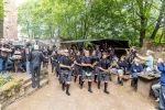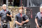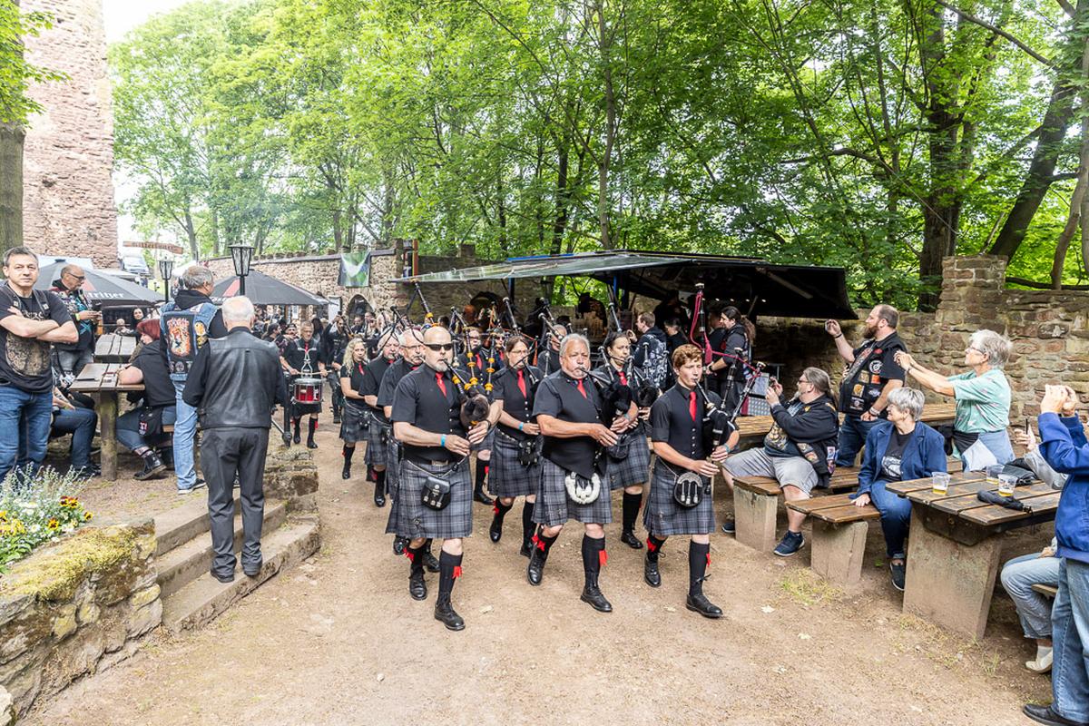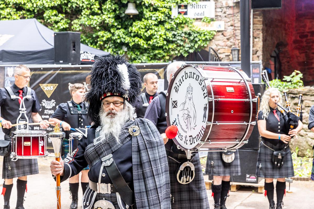 Ich habe Donnerstag Freunde auf dem Campingplatz A besucht und hatte das Glück den ersten musikalischen Auftakt auf dem Festivl miterleben zu dürfen. Eine Handvoll Musiker von der Gruppe Barbarossa Pipes & Drums spielen auf dem Campingplatz ein kurzes Stück und ziehen dann runter zur Bühne. Zusammen mit dem Rest der Gruppe begeben sich die Musiker geschlossen in die Burg. Vor der Bühne stellt sich die Gruppe kurz vor und spielt dann mehrere Stücke als Opener des Festivals. Dabei spielen sie auf den Dudelsäcken althergebrachten Stücke, wie "Flower of Scottland", und moderne Stücke, wie "Smoke on the Water". Manche der modernen Stücke klappen nicht so ganz auf diesem Instrument, aber unterhaltsam ist es allemal und sie ernten eine Menge Applaus dafür. Für mich ein gelungener Auftakt für die nächsten drei Tage.