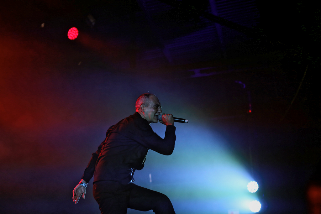 Und dann gings weiter im Hangar mit DAF. Die Helden des NDW und Wegbereiter des EBM Gabi Delgado-López und Robert Görl haben nichts von ihrer Dynamik eingebüßt. Gabis Wasserflaschenverbrauch während des Konzerts nimmt dabei allerdings wieder einmal die Ausmaße einer Großfamilie an. Beste Bühnenpräsenz und Dynamik. „Tanz den Mussolini!“