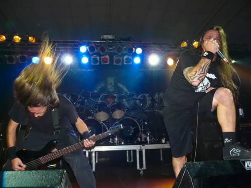 ...mit Aborted die nächste Kannonade einsetzte. "Enterrement of an Idol" leitete vor ca. 200 Zuschauern einen Auftritt ein, der zwar nicht spektakulär war (die Band ist wohl auch größere Massen gewohnt), aber auf jeden Fall solide. Frontsau Sven de Caluwe grunzte sich die Lunge aus dem Leib wie eh und je und fand zwischen fetten Vocals und kranker Mimik auch noch Zeit für hyperaktives Herumsausen auf der Bühne (eine verdammt nervige Eigenschaft, wenn man versucht, ein vernünftiges Foto von ihm und der Band zu schießen).
