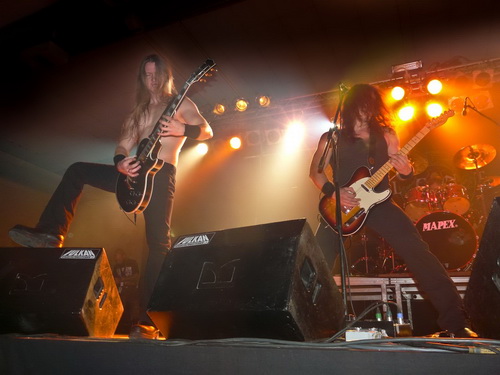 Tyr wurden nämlich schon ähnlich heiß erwartet, wie Alestorm zuvor. Schließlich haben die vier Herren von den Faröer-Inseln sich mit ihrer sehr progressiven, melodischen und von einheimischen Sängen und Sagen inspirierten Interpretation des Viking/Folk Metal mittlerweile eine beachtliche Fanbasis erspielt. Ihre Live-Auftritte dürften dazu Einiges beigetragen haben - danach zu urteilen, was sie in der nun folgenden Stunde ablieferten. Neben dem üblichen Viking-Pathos und mehrstimmigen Chören (die auf Konserve aber auch schon mal besser klangen) gab's vor allem viel Publikumsnähe. Gleich zu Anfangs durfte das famose "Hail to the Hammer" mitgesungen werden, bevor dann zu "Ragnarøk" ein Meer von Feuerzeugen über den Köpfen schwankte. Außerdem gab's auch eine Menge neuer Titel vom im Mai veröffentlichten Album "Land". Besonders gut kamen aber vor allem die bereits bekannten Titel an, die es auch weiterhin reichlich regnete: Sowohl das Cover "The Wild Rover", als auch Tyrs Epos "Ramund Hin Unge" wurden spitze aufgenommen, so dass es nach Ende des "letzten" Liedes laute Zugabe-Rufe gab - eine Bitte, der Tyr gern noch mit einem weiteren Titel nachkamen.