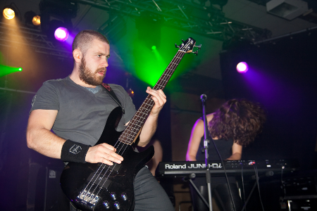 Als nächstes wurd's oldschoolig. Ein wenig zumindest. Denn bei der Passauer Lokalformation Steel Engraved gab's erstmals an diesem Tag auch reinrassigen Heavy Metal um die Ohren - komplett mit Lederoutfit und (etwas exzessiv genutzter) Heul-/Vibrato-Stimme. Stilistisch irgendwo zwischen Manowar und Iron Maiden zu verorten, lieferten die Fünfe zwar sicher nichts Brandneues ab - kopierten ihre Vorbilder jedoch grundsolide und kamen noch dazu recht sympathisch rüber. Das merkte auch das Publikum irgendwann: Nachdem die Meute sich den ersten Teil der Show über nur warmgehört hatte, wurde spätestens bei "Stainless Steel" ordentlich mitgegebangt und zu den elegischeren Teilen des Titels auch Feuerzeuge entzündet. Als Steel Engraved sich nach 40 Minuten Action mit "I Am the One" verabschiedeten, konnten sie daher absolut zufrieden sein, hinterließen sie doch einen gut aufgewärmten Zuschauerraum, der bereit war für mehr.