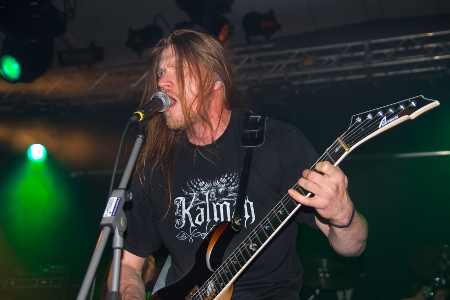 Seit nunmehr zehn Jahren bemühen sich Kalmah, ihre Landsmänner von den Children of Bodom zu beerben. Im Gegensatz zu den Kindern vom Bodomsee hat die Band sich allerdings stets die Brachialität ihrer Anfangstage bewahrt, so dass sich auch heute noch genuine Black- und Death Metal-Riffs in den Kompositionen der fünf Finnen finden. Auf der Metal Invasion rollten Kalmah das ganze Repertoire einer Dekade auf, und boten von "Swampsong" (1999) bis zum aktuellen "12 Gauge"-Album (2010) alles, was das Sumpfbewohnerherz begehrte. Dabei gingen die Finnen ihrem Job mit einer Energie und Spielfreude nach, wie sie auf dem Festival ihresgleichen suchte. Chefsympathikus Pekka Kokko heizte seinem Publikum gehörig ein und animierte mehrfach zu Moshpit, Mattendreschen und Mitarbeit. Die brechend volle Halle nahm's gern auf und war selbst bis weit in die hinteren Reihen noch in Bewegung - eine schweißtreibende Angelegenheit, denn mit mehr als einer Stunde Spielzeit bewiesen Kalmah auch eine enorme Durchhaltefähigkeit bei konstant hohem Niveau. Verdient hatten sie ihr Bierchen daher allemal, als sie nach dem letzten Titel freudig die Schlagstöcke ins Publikum droschen und noch viel Spaß mit Eluveitie wünschten. Ein fulminanter Auftritt, für mich persönlich sogar der gelungenste des Festivals!
