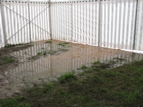 Ansonsten befanden sich die beiden Bühnen fest nebeneinander auf einem großen Platz, in dessen hinterem Bereich sich diesmal allerlei unterschiedlichste Fressbuden von traditionell (Schnitzelsemmel, Fritten und Co.) über trendy (integrierter Kaffeebar-Sandwichstand) bis hin zu exotisch (vegetarisch-indisch) befanden. Nicht zu vergessen der allseits beliebte Haribo-Candyman! Auch das Hartwarenangebot konnte sich sehen lassen, neben dem quasi-offiziellen Merch-Stand boten zahlreiche Händler CDs, Bekleidungsgegenstände und genretypische Accessoires feil. Camping- und Parkplatz fielen diesmal zusammen, so dass nicht alle Utensilien auf einmal mühsam durch die Gegend geschleppt werden mussten, sondern teilweise im PKW verbleiben konnten, welcher zudem aufgrund räumlicher Nähe als ständig verfügbares (trockenes!) Refugium zur Verfügung stand. Der Laufweg betrug selbst vom äußeren Ende des Campingplatzes zu den Bühnen nur wenig mehr als 5 Minuten, und der Untergrund besaß zumindest etwas abseits der zerfurchten Fahrwege genug Saugkraft, um die beständig niederfallenden Wassermassen aufzunehmen. Unterm Strich lässt sich festhalten - etwas weniger Atmosphäre, dafür aber deutlich mehr "Ergonomie" - ein durchaus sinnvoller Locationwechsel!