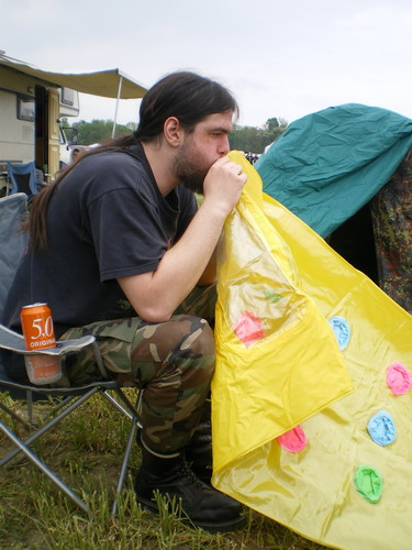 Soviel zur Umgebung...and now for something (partitially) completely different. Als wir um kurz nach 9 am VIP-Eingang eintrafen, um unsere Pässe zu holen, herrschte noch weitgehende Leere, und selbst der für den Empfang abgestellte Mitarbeiter traf erst ein paar Minuten später ein - noch nach Scared to Death und Benighted, welche sich direkt hinter uns mit ihren Vans einreihten und knapp zwei Stunden später bereits auf der Bühne zu stehen hatten, um die Meute anzuheizen. Dementsprechend genervt waren die beiden Truppen denn auch, als der berühmte Turban-Mann anfing, dem Orga-Mitarbeiter seine Lebensgeschichte zu erzählen (so zumindest mein Endruck). Die scheinbare morgendliche Verplantheit des Mitarbeiters trug sicher ebenfalls ihren Teil bei. Immerhin ließ sich die Zeit dazu nutzen, mit den Jungs von Scared to Death zu plauschen und ein paar ganz interessante Infos zu ergattern (zum Beispiel, dass es dieses Jahr noch zu einer Neuauflage der bereits tot geglaubten Metal Invasion kommen wird). Und schließlich wurde jeder doch noch bedient - Scared to Death verzogen sich in den Backstagebereich, um sich auf den Auftritt vorzubereiten und wir aufs Campinggelände, um unsere Heimstatt für die nächsten Tage aufzubauen, solange es noch trocken blieb.