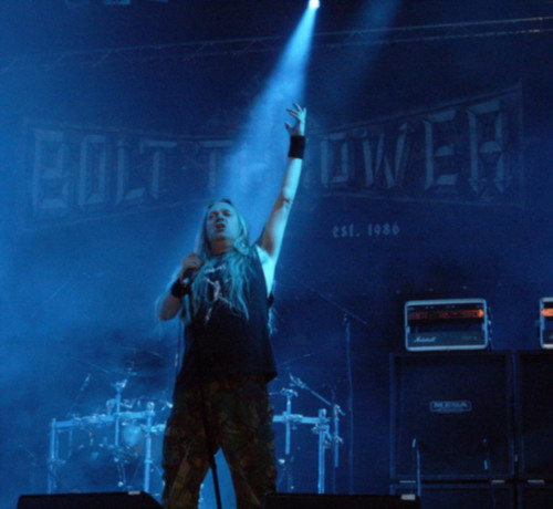 Bolt Thrower das erste Mal zu sehen ist wie den ersten Blowjob spendiert bekommen. Aufregend, mitreissend, auslaugend und am Ende legt man sich befriedigt schlafen. Natürlich war am Anfang eine gewisse Skepsis da. Würden die Jungs wirklich soviel hergeben wie gemunkelt wird oder ist das alles viel Lärm um Nichts? Diese Frage stellten sich wohl auch viele Festivalbesucher, denn der Raum vor der Bühne war voller als bei jeder anderen Band. Nach einem dramatischen Intro stiegen die Death-Metaller aus grauer Vorzeit aus dem Nebel auf, um in einer stimmungsvollen Lichtshow zu posen und sich dem Publikum zu präsentieren. Selbiges war eher zurückhaltend was die Lautstärke betrifft, ob dies nun an der herrschenden Ehrfurcht oder der Müdigkeit bleibt wohl offen. Trotzdem wurde zu Klassikern wie "At First Light", "Anti-Tank" und "No Guts - No Glory" ordentlich gebangt, gesurft und Hände gen Himmel gereckt, denn nach den ersten Songs war die Ehrfurcht endloser Begeisterung gewichen. Man merkte dieser Band eben die 26 Jahre Erfahrung deutlich an, denn sie wussten die Menge aus der Reserve zu locken. Da das Songrepertoire sich von langsamen über Mid-Tempo bis hin zu derbem Geknüppel hinzog wurde die Stunde auch alles andere als langweilig.