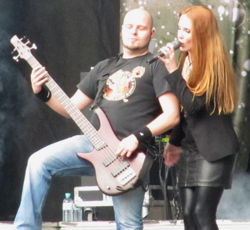 Einer der großen Namen des Female fronted Metal bekam anschließend Gelegenheit, sich zu beweisen: Leave's Eyes, ein aus dem Weggang von Ex-Theater of Tragedy-Frontfrau Liv Kristin unter Zuhilfenahme des harten Kerns von Atrocity entstandenes Spaltprodukt verbindet überaus gekonnt symphonisch-hymnische Klänge und klaren weiblichen Gesang mit fetten Gitarrenriffs und den fiesen Growls aus der Kehle von Atrocity-Frontmann Alexander Krull. Wie sich schnell zeigen sollte, funktioniert so etwas nicht nur im Studio. Schnell füllten sich die anfangs noch spärlich besetzten Reihen, und wie zur Bestätigung ließ für ein paar Augenblicke der Regen nach und sich die Sonne blicken. Der Höhepunkt der Stimmung wurde mit dem Scream-Contest erreicht, über den Alex feststellen wollte, welcher Teil des Publikums wohl lauter sei - der deutsche oder der österreichische? Wenn man bedenkt, wo das Festival denn stattfand, dürfte das Ergebnis kaum überraschen...musikalisches Highlight war für mich das an den Contest anschließende "Take the devil in me", welches die Qualitäten der Band voll auf den Punkt brachte - ein grandioser Auftritt!