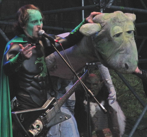 ...welches erstmal ein wenig auf sich warten ließ. 15 Minuten, um genau zu sein. Inzwischen hatte es wieder zu regnen begonnen, als mit Eluveitie die eine Hälfte der Pagan Alliance die Bühne betrat und loslegte. Mit Einschränkungen, muss man wohl sagen, da das Mikro von Eluveitie-Frontmann Chrigel nicht so richtig wollte. Bei Finntroll, die anschließend nachrückten, lief es deutlich runder. Doch schien zunächst keine überragende Stimmung beim Publikum aufzukommen im Vergleich zu den bisher erlebten Einzelkonzerten der beiden Bands. Das änderte sich auch bei den folgenden Stücken (überwiegend von den jeweils aktuellen Alben) nicht, die in Mischbesetzung zum Besten gegeben wurden. Weiterhin wurde Chrinel von Mikroaussetzern geplagt, weshalb Finntroll-Fronter Vreed ihm praktisch durchgehend zur Seite stehen musste, damit die Vocals nicht vollkommen unter den Bühnenboden fielen. Erst als die Mikroprobleme behoben und vermehrt Songs des Slania- bzw. Nattfodd-Albums abgefeuert wurden stieg die Resonanz des Publikums sprunghaft an, und bei "Inis Mona" gröhlte schließlich das ganze Bierzelt mit. Schade nur, dass es bis dahin fast 1 1/2 Stunden gebraucht hatte. Als dann gegen Ende das unverzichtbare "Trollhammaren" (angereichert durch die von Eluveitie ausgeborgten Damen an Violine und Drehleier) aufgefahren wurde, war dann auch schon wieder Schluss. Insgesamt darf man sagen, dass das Projekt sicher die ein oder andere Facette zu den einzelnen Songs hinzufügen konnte, die Umsetzung jedoch absolut desolat war. Auch das Risiko, mit dem weniger bekannten neuen Material loszulegen hätte man nicht eingehen müssen, wenn man weiß, dass gewisse Songs einfach immer und sofort zünden. So bleibt die Feststellung: Eluveitie und Finntroll jederzeit wieder, aber dann bitte nicht parallel.