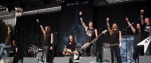 Die niederländischen Paganen von Heidevolk konnten die Audience ebenfalls vom Fleck weg mitreißen. Die zahlreichen Hörner, die sich bald in Richtung Bühne erhoben, deuteten an, wohin die Reise gehen sollte, und die Fans wurden nicht enttäuscht. Weniger Kriegs- und mehr Trinklieder wurden gewünscht und auch serviert. Zwar wurde kurz darauf hingewiesen, dass die Band bei diesem Auftritt auf einen Ersatzgitarristen und -bassisten zurückgreifen musste, doch wirkten die Mannen wie eine eingespielte Einheit. Der klare Zweigesang, der die Formation von den meisten anderen Gruppen des Genres abhebt, kam dank diesmal ordentlicher Soundmischung gut zur Geltung, besonders überzeugt hat er mich in "Het wilde Heer".
