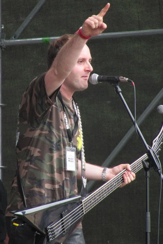 Nach einer kühlen, durchweichten Nacht ging es am Vormittag heiter los mit den in ihrer Folkbesetzung angetretenen Schelmish - das bedeutete: Tröten statt Gitarren, keine Verzerrer und dergleichen...die Truppe dürfte so ziemlich die einzige sein, die ihre Songs regelmäßig in zwei verschiedenen Formen darbietet und dabei den Eindruck zweier zwar überaus unterschiedlicher, aber gleichsam guter Bands hinterlässt. Über Nacht hatte sich der Platz direkt vor der Bühne in einen knöcheltiefen Tümpel verwandelt, was die Erschienenen aber nicht zu stören schien, den sie gingen mindestens genauso gut ab wie die Truppe auf der Bühne. Besonders die Klöppelfraktion hinterließ einen nachhaltigen Eindruck und das übrige Instrumentarium von der Präsenz her chancenlos - so macht Trötenmusik Spaß!