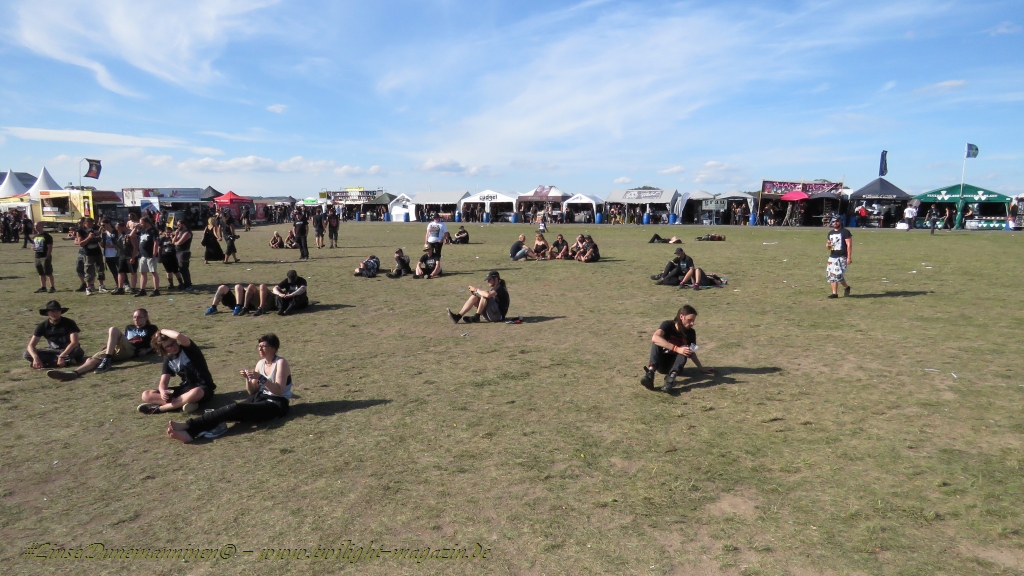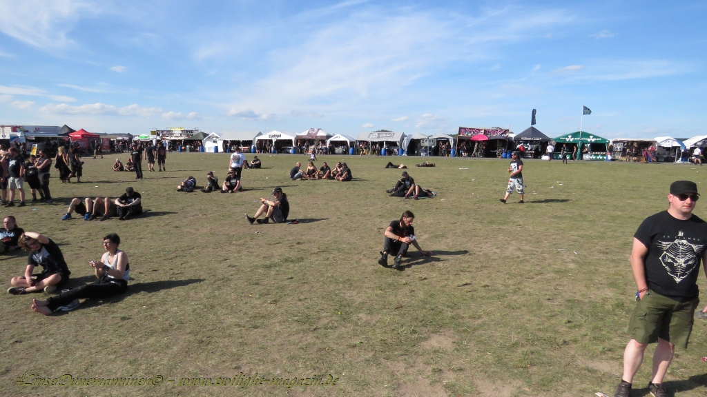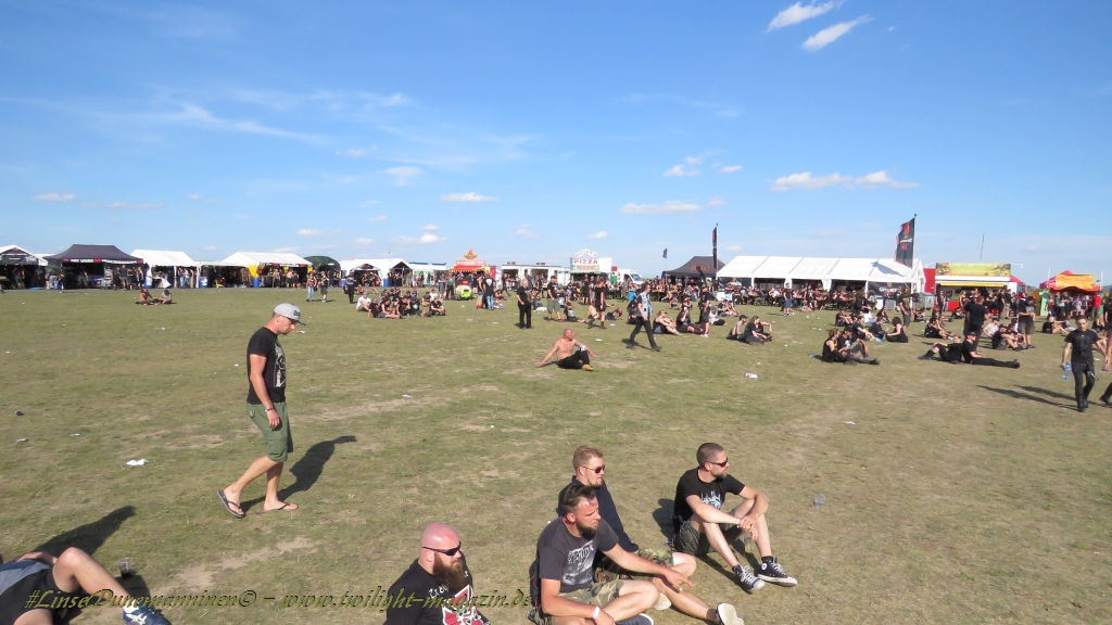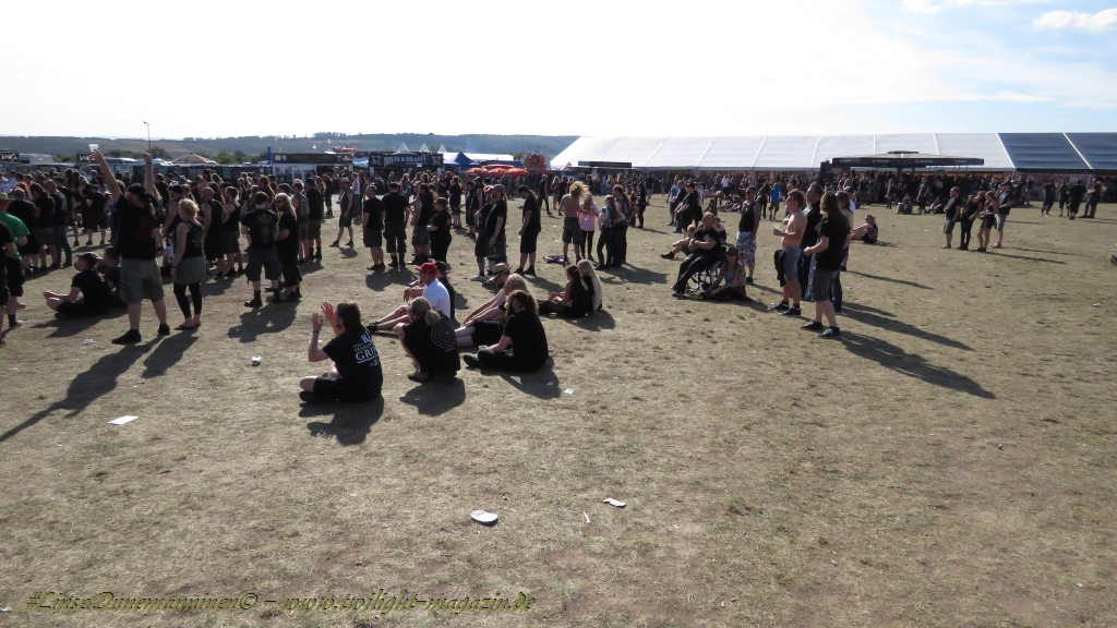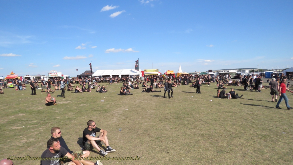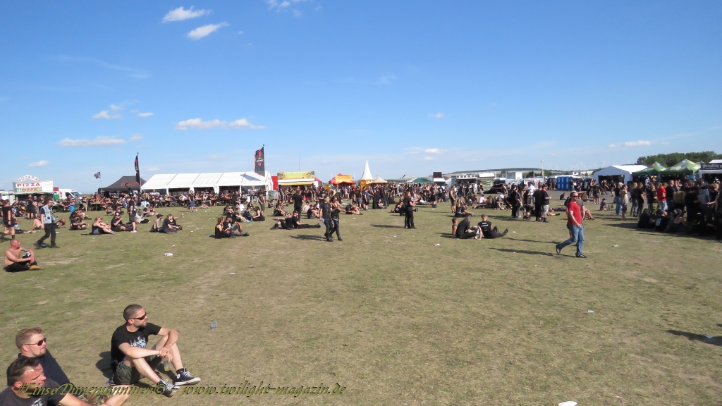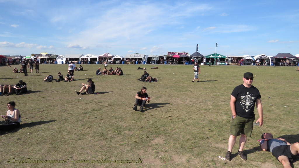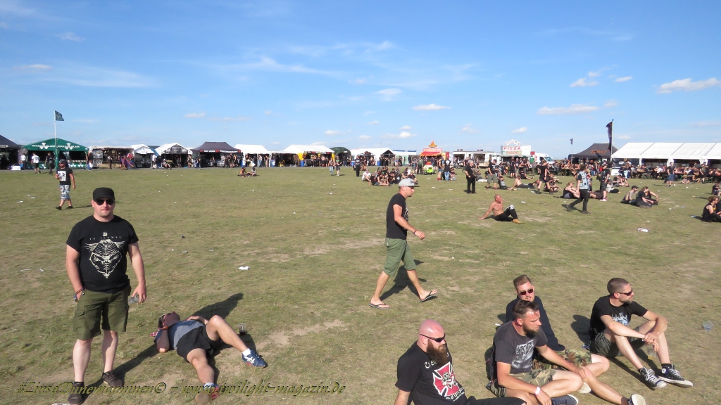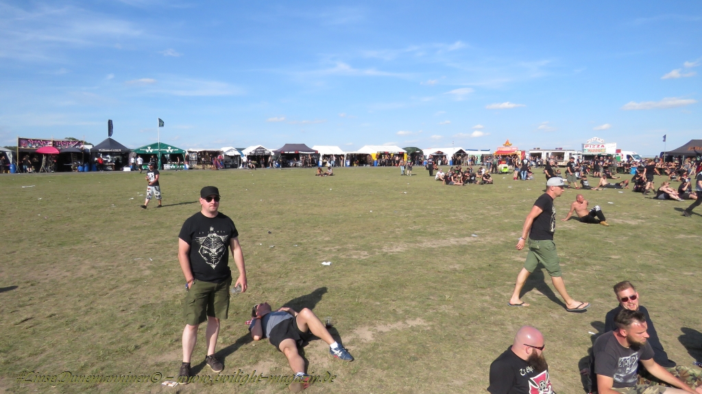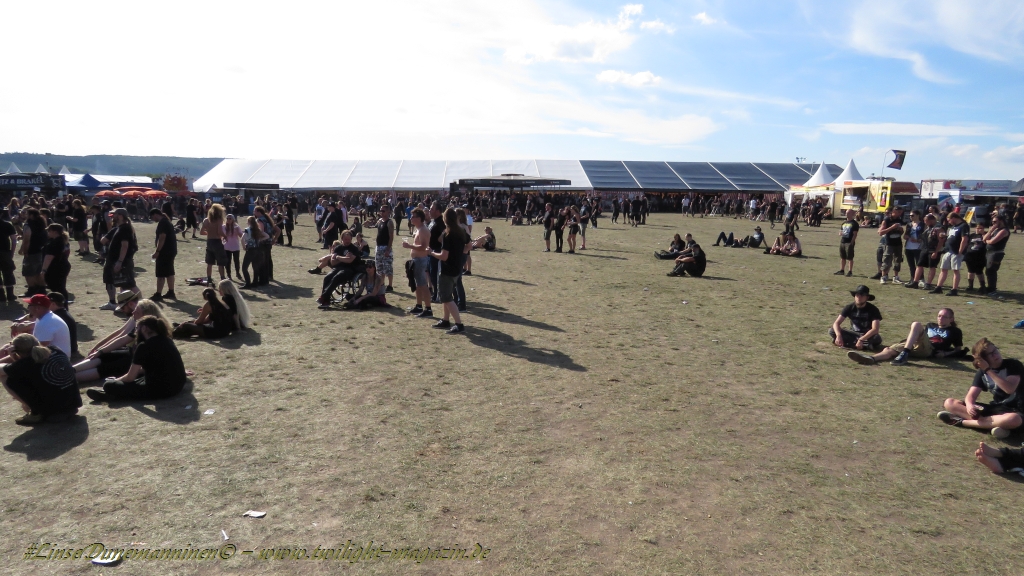 Nachdem man den Besuchern mit dem Whiskey-Pub eine äußerst gediegene Neuerung angekündigt hatte, darf man den massiven Ausbau der (gegen Entgelt) vorreservierbaren Campingflächen und dem damit verbundenen Verlust an freien Flächen durchaus diskutieren. Denn die Reservation garantiert keinesfalls kurze Wege, allerdings kann sie zeitversetzt anreisenden Gruppen jedoch einiges an Stress ersparen. Es gilt das Windhund-Prinzip und damit die alte Tatsache "Wer zuerst kommt...", sowohl bei der Reservierung, wie auch bei der klassischen Anreise ohne Vorreservierung. Eine Vielzahl von im Vorfeld abgesteckter Claims sollte eigentlich auch der Security bzw. den Einweisern die Arbeit erleichtern, doch bei unserer zeitigen Anreise am Mittwoch-Vormittag müssen wir leider erstmalig im Bereich der freien Camping-Flächen eine komplett überforderte Crew dabei erleben, die auf den Platz strömenden Massen mit angemessenen Campingflächen zu versorgen und dabei sicherheitsrelevante Aspekte zu beachten. Letztendlich ist das Problem dann aber relativ schnell behoben und nachdem unser massiver Pavillon ausgerechnet zu jenem Zeitpunkt aufgebaut wird, als sich der einzige relevant aber sturmumtoste, unwetterartige Regenguss des gesamten Wochenendes über die noch jungfreuliche Spielwiese ergießt, kehrt nicht nur Ruhe sondern feierliche Vorfreude ins alljährliche Lagerleben ein. Und diese positive Erwartungshaltung will gepflegt werden, wofür einmal mehr beim traditionellen Metal-Disko - Auftakt im Zelt mit Speis und Trank der Boden bereitet ist, wobei dem Stammkunden recht schnell auffällt, dass sowohl die Bierpreise wie auch der Preis der superben Weimarer Bratwurst leicht angezogen haben. Neben der feuchten Husche von oben haben die Meteorologen auch zielsicher den damit einhergehenden massiven Temperatursturz vorher gesagt, was des Nächtens nicht nur für ungewöhnliche Temperaturen nahe des Gefrierpunktes, sondern am Donnerstag Vormittag auch zum Wolldecken-Engpass bei einem Textil-Discounter in der Schlotheimer City sorgt. Selbst in den schattigen Nächten zu Bad Berka habe ich es in all den Jahren nie so frostig empfunden, wie in diesem Jahr zum Festival-Auftakt. Weitere Kapriolen bleiben jedoch erfreulicher Weise aus und insgesamt meinen es die Wetterfrösche mit den Veranstaltern und dem Publikum auch 2016 mehr als gut. Zwar bleibt es mitunter durchwachsen, doch mit mit voranschreitender Dauer darf sich im Verlauf der nächsten Tage mehr und mehr die Sonne durchsetzen.