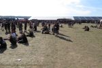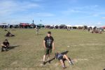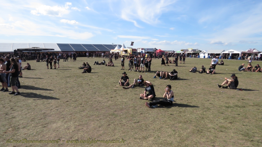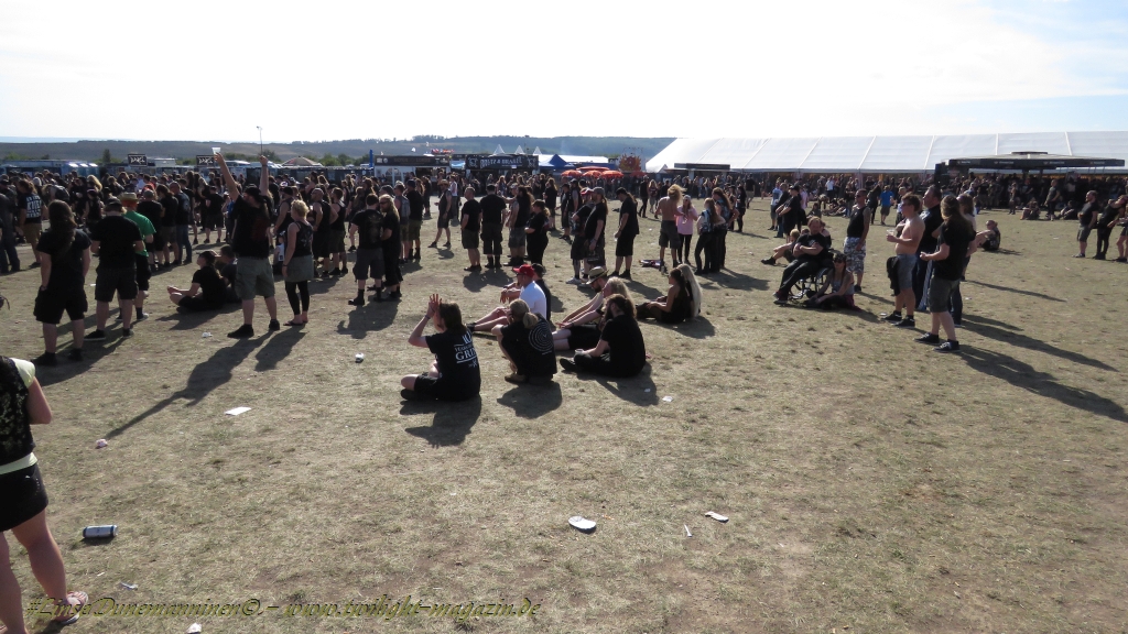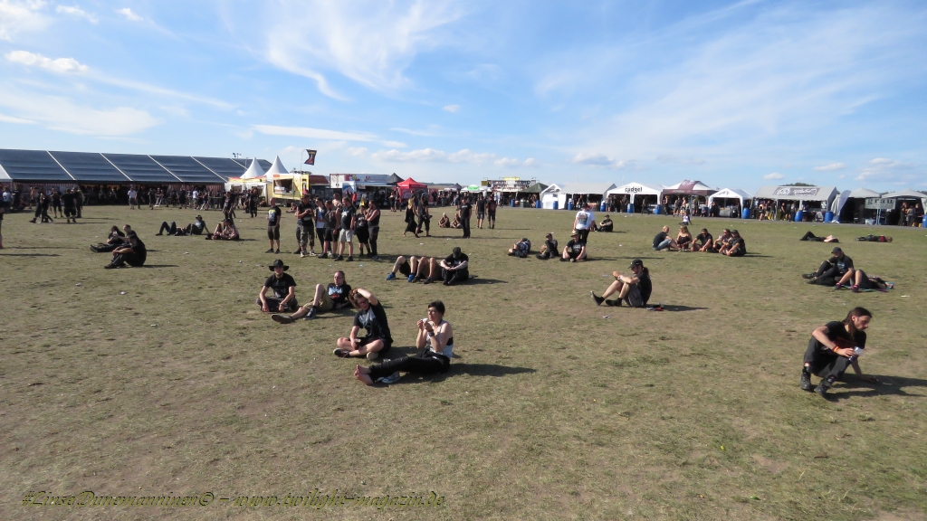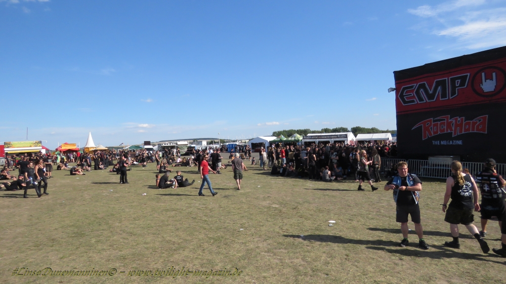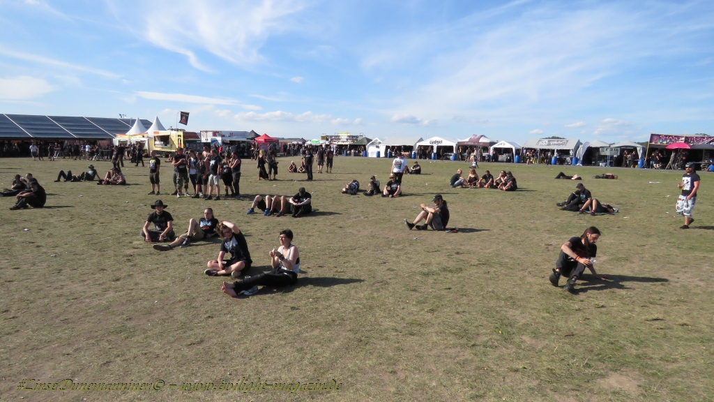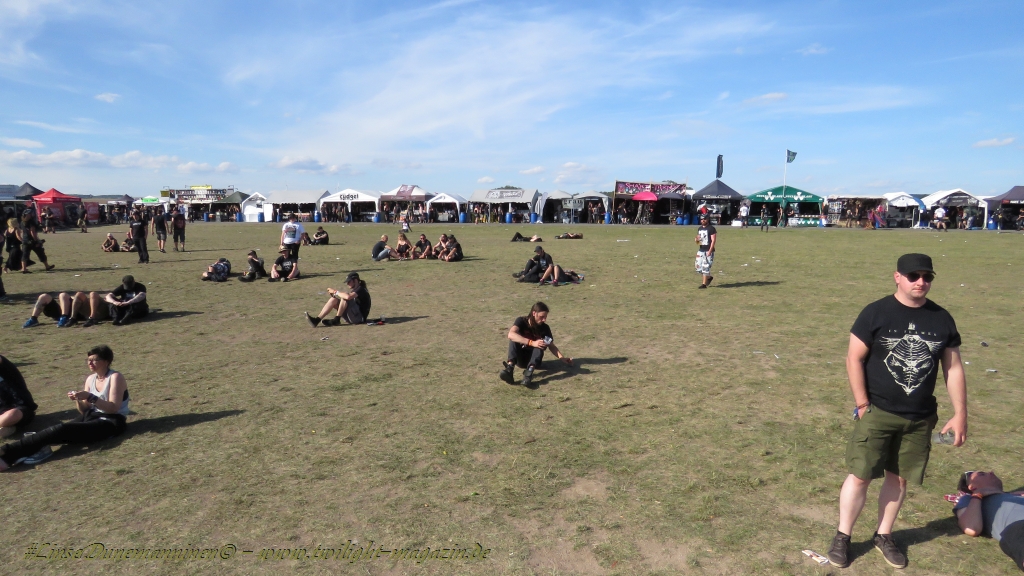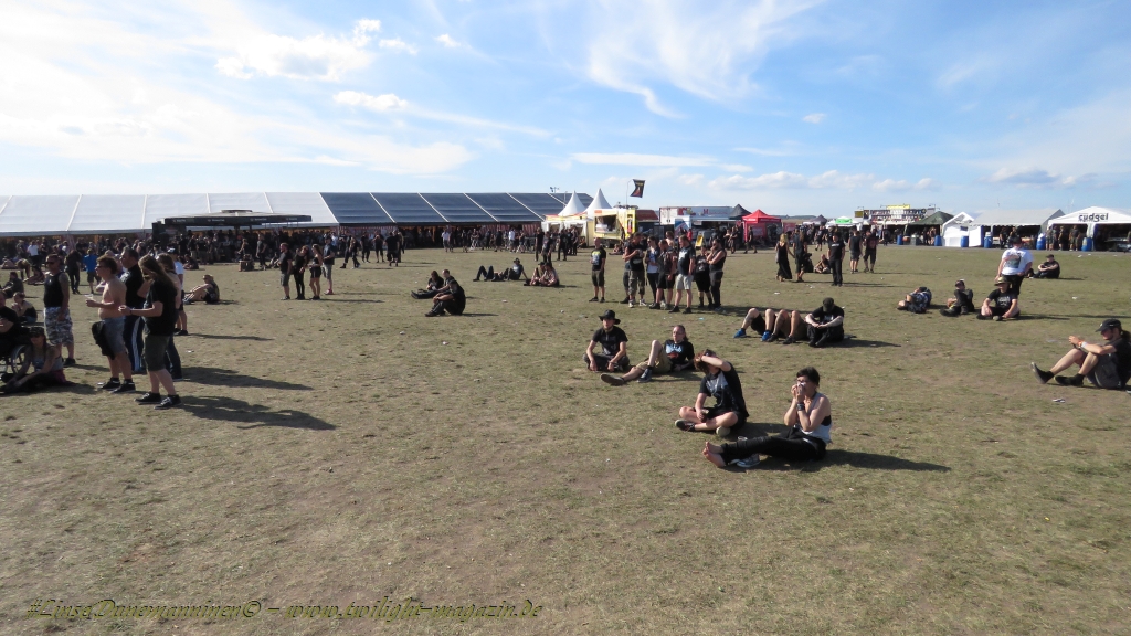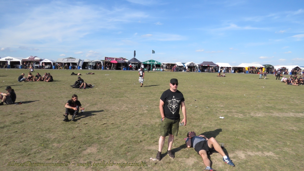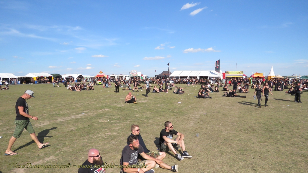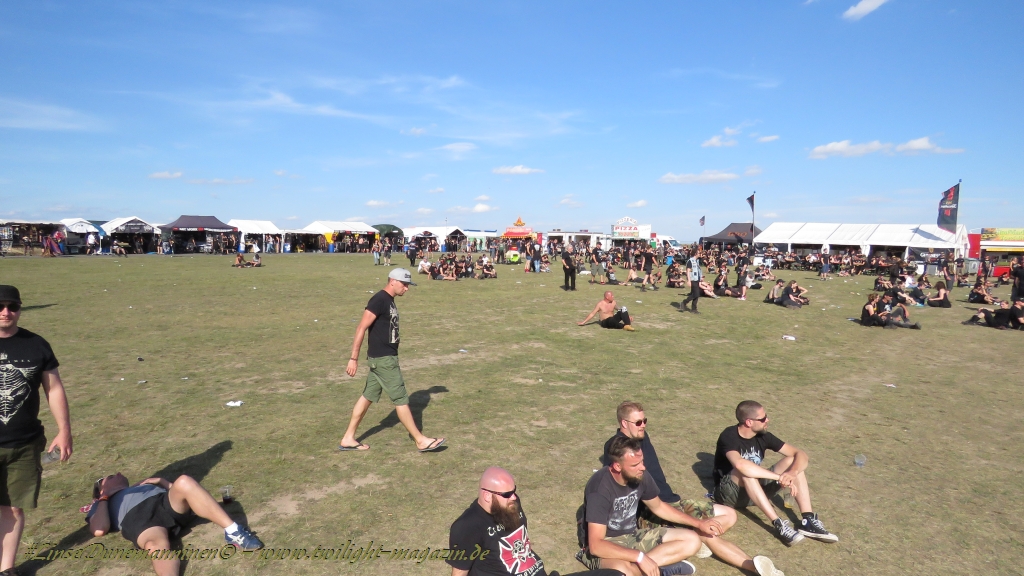 Nachdem man den Besuchern mit dem Whiskey-Pub eine äußerst gediegene Neuerung angekündigt hatte, darf man den massiven Ausbau der (gegen Entgelt) vorreservierbaren Campingflächen und dem damit verbundenen Verlust an freien Flächen durchaus diskutieren. Denn die Reservation garantiert keinesfalls kurze Wege, allerdings kann sie zeitversetzt anreisenden Gruppen jedoch einiges an Stress ersparen. Es gilt das Windhund-Prinzip und damit die alte Tatsache "Wer zuerst kommt...", sowohl bei der Reservierung, wie auch bei der klassischen Anreise ohne Vorreservierung. Eine Vielzahl von im Vorfeld abgesteckter Claims sollte eigentlich auch der Security bzw. den Einweisern die Arbeit erleichtern, doch bei unserer zeitigen Anreise am Mittwoch-Vormittag müssen wir leider erstmalig im Bereich der freien Camping-Flächen eine komplett überforderte Crew dabei erleben, die auf den Platz strömenden Massen mit angemessenen Campingflächen zu versorgen und dabei sicherheitsrelevante Aspekte zu beachten. Letztendlich ist das Problem dann aber relativ schnell behoben und nachdem unser massiver Pavillon ausgerechnet zu jenem Zeitpunkt aufgebaut wird, als sich der einzige relevant aber sturmumtoste, unwetterartige Regenguss des gesamten Wochenendes über die noch jungfreuliche Spielwiese ergießt, kehrt nicht nur Ruhe sondern feierliche Vorfreude ins alljährliche Lagerleben ein. Und diese positive Erwartungshaltung will gepflegt werden, wofür einmal mehr beim traditionellen Metal-Disko - Auftakt im Zelt mit Speis und Trank der Boden bereitet ist, wobei dem Stammkunden recht schnell auffällt, dass sowohl die Bierpreise wie auch der Preis der superben Weimarer Bratwurst leicht angezogen haben. Neben der feuchten Husche von oben haben die Meteorologen auch zielsicher den damit einhergehenden massiven Temperatursturz vorher gesagt, was des Nächtens nicht nur für ungewöhnliche Temperaturen nahe des Gefrierpunktes, sondern am Donnerstag Vormittag auch zum Wolldecken-Engpass bei einem Textil-Discounter in der Schlotheimer City sorgt. Selbst in den schattigen Nächten zu Bad Berka habe ich es in all den Jahren nie so frostig empfunden, wie in diesem Jahr zum Festival-Auftakt. Weitere Kapriolen bleiben jedoch erfreulicher Weise aus und insgesamt meinen es die Wetterfrösche mit den Veranstaltern und dem Publikum auch 2016 mehr als gut. Zwar bleibt es mitunter durchwachsen, doch mit mit voranschreitender Dauer darf sich im Verlauf der nächsten Tage mehr und mehr die Sonne durchsetzen.