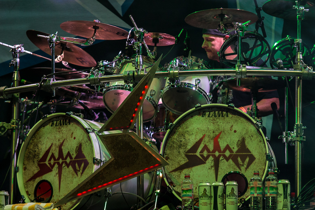 Uhh, anschließend hab´ ich mich wieder so gefühlt, wie 1997, als ich Krisiun zum ersten Mal live gesehen hab. Abriss! Wahnsinn, was die Brasilianer da zaubern und der Sound ist für das Geholze auch mehr als brillant. Was soll man dazu noch sagen? BRAZILIAN DEATH METAL rules! Während die norwegischen Schwarzheimer von TAAKE mit Standard-Kost krampfhaft zu schocken versuchen überzeugen die berliner Occult-Deather DROWNED als Abschluss im Zelt vollends. Da stimmt alles von hinten bis vorne. Sound super, Songs super, Sonne fast weg. So soll es sein.(JD/LT) 2012 wurde SODOM leider nicht der Respekt (Position im Billing und Spielzeit) entgegen gebracht, der einer Formation gebührt, von der mindestens die Hälfte aller Combos, die in den vergangenen Dekaden auf dem PARTY.SAN METAL OPEN AIR die Klinke in die Hand gegeben haben, in irgendeiner Weise beeinflusst wurde. Tom Angelripper, Bernemann und Maka machen richtig Spaß und glänzen mit guter Laune, Spielfreude und sind damit weit entfernt von einer "Standard-Altherren-Bühnenshow". Klar, bei der Setlist samt (u. a.) "Ausgebombt", "Remember The Fallen", "Tired And Red", "Sodomy And Lust", "Outbreak Of Evil" sowie "Stigmatized" oder "City Of God" kann man auch nicht viel verkehrt machen. Das Ruhrpott-Trio überzeugt und erfüllt alle Hoffnungen, die ich in Onkel Tom und seine Mannen gelegt habe.