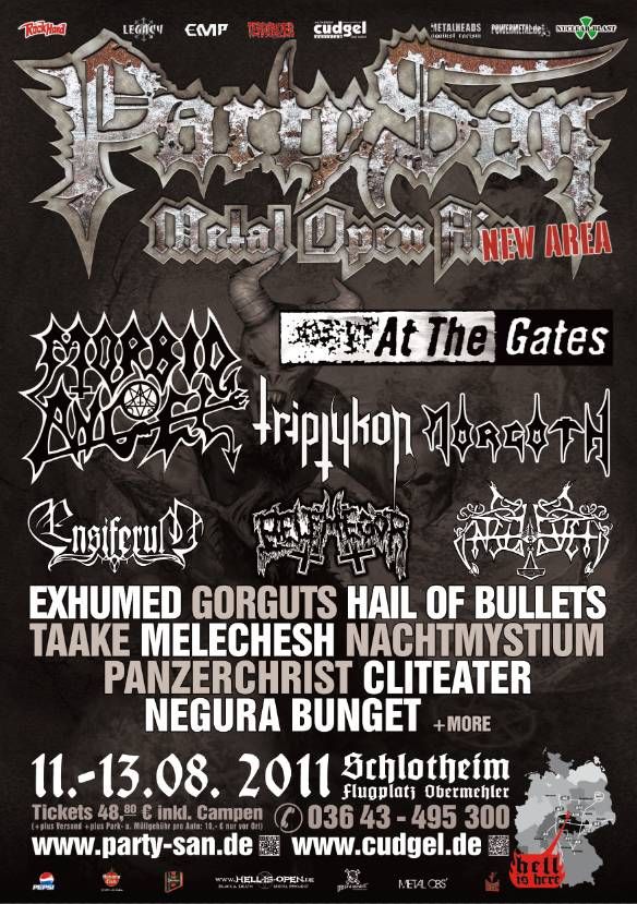 Morgoth, Helden meiner späten Jugend sind zurück. Zumindest sagt Sänger Marc Grewe das so. Ständig. Nach jedem Song brüllt er „Wir sind Morgoth und wir sind zurüüüüüüüück". Scheint nicht wirklich mehr so ganz nüchtern zu sein. Die Gitarristen geben sich da wesentlich zurückhaltender, leider nicht nur optisch sondern auch sound und spieltechnisch. Das schmälert einen ansonsten wirklich mitreißenden Gig mit grandioser Setlist ein wenig. Höhepunkt: „Pits Of Utumno" im Duett mit Dreier von Purgatory. Und nun zu At The Gates: Was hab ich mich gefreut, die mal endlich live zu sehen. Und trotzdem geht es mir so wie ca. 90 Prozent aller anderen Party-San Besuchern auch, denn nach drei Tagen Bier und Death Metal ist die Kraft weg und die Luft raus. Und das haben At The Gates nicht verdient, denn die Show hat es wirklich in sich. Ein super Sound, eine Jarhundert-Setlist mit dem Hauptaugenmerk auf „Slaughter Of The Soul" und auch einigen Überraschungen wie „The Beautiful Wound" finden letztlich nur noch vor einem knappen Drittel des Gesamtauditoriums statt. Schade, wirklich schade, denn die Band hat alles gegeben. Und wer weiß, ob wir das so in der Form jemals wieder zu Gesicht bekommen...(ET) Auf At The Gates war wohl fast jeder hier gespannt. Doch was man nun erleben durfte war ein wahres Feuerwerk. Nach dem Start mit "Slaughter Of The Souls" setzte wieder Regen ein. Doch davon ließ sich hier niemand wirklich stören. Auch Frontlegende Tomas zog nach einiger Bühnenaction seinen Pulli aus und war konstant damit beschäftigt dem Publikum ordentlich Feuer unter dem Hintern zu machen. Als die Show nach ner knappen Stunde zu ende schien, kamen sehr bekannte Geräusche aus den Boxen. Und nach dem knapp einminütigen Intro gab es dann DEN Hit: "Blinded By Fear". Nun hielt es niemanden mehr zurück und die Party erreichte ihren Höhepunkt. Mit "Kingdome Gone" endet dann das wohl geilste Konzert des Festivals.Viele zufriedene Gesichter und ordentlich Nackenschmerzen in den nächsten Tag zeugen von vielen Geilen Momenten und somit kann das nächste Jahr kommen!(DS)