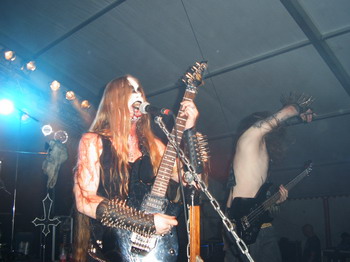 Mit langen Nieten, viel Leder, Zentimeter dickem Corpsepaint und noch viel mehr Kunstblut macht sich die Band auf, zu einem Kriegszug, gegen alles was heilig ist. Dazu gehören in diesem Falle auch meine Augen und Ohren, denn wer so dick aufträgt und dann mit einer Musik auffährt, die auch einem defekten Föhn nachempfunden sein könnte, der kann wahrlich nicht ernst genommen werden. Da hilft auch kein weiblicher Tittenbonus und auch wenn die Performance in Ordnung geht, so bleibt der Gig doch am Rande der Lächerlichkeit und vor allem eine nervige Angelegenheit. Wer allerdings GWAR, auf Black Metal getrimmt, erleben möchte, dem kann ich diese Band nur bedingungslos empfehlen.