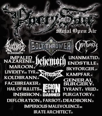 Behemoth, Bloodbath, Bolt Thrower, Deadborn, Defloration, Dismember, Endstille, Facebreaker, Farsot, General Surgery, Hail of Bullets, Impaled Nazarene, Imperious Malevolence, Insision, Irate Architect, Kampfar, Koldbrann, Legion of the Damned, Lividity, Maroon, Obituary, Purgatory, Skyforger, Tyr, Tyrant, Unanimated, Vreid