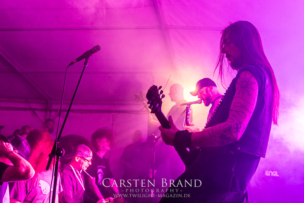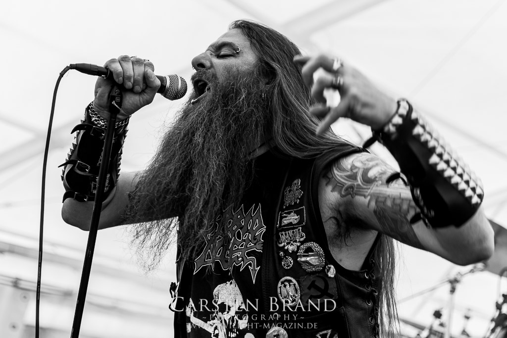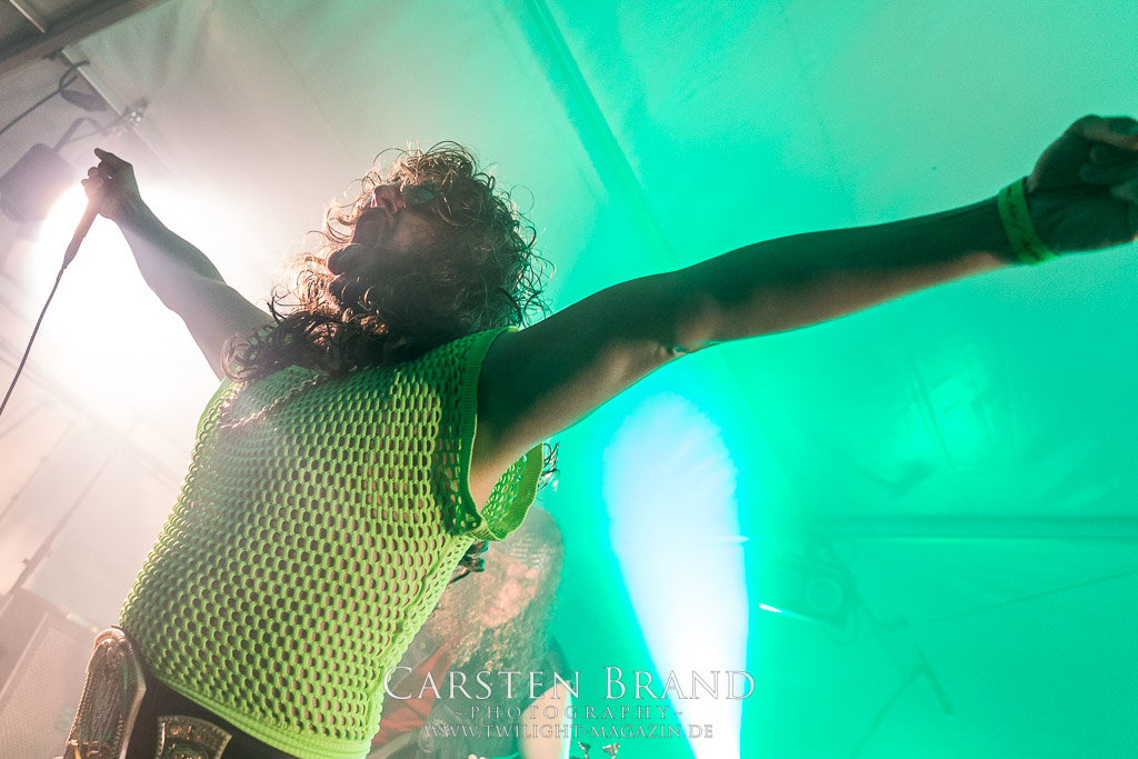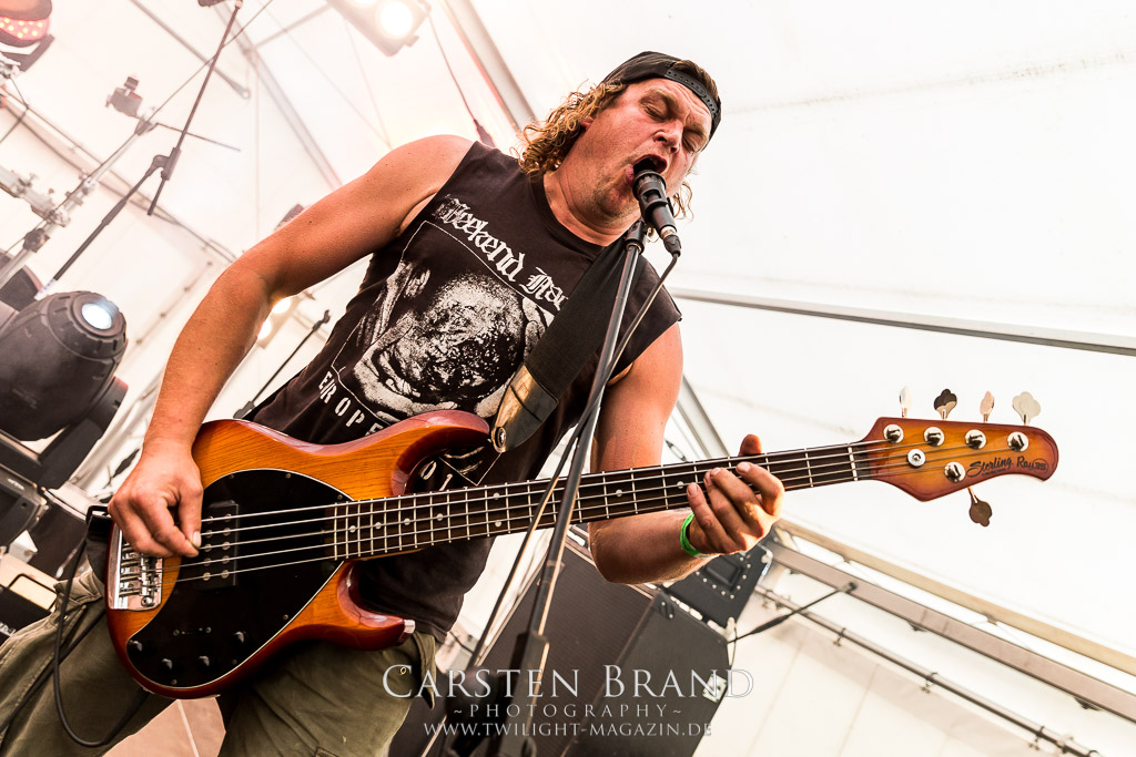 Kollege Linses Ohren sind ja einiges gewohnt. Als der mit den Worten „das ist mir zu krass“ aus dem Zelt kommt, in dem WOJCZECH gerade ihr Set begonnen haben, ist mein Interesse noch weiter geweckt. Das war eh´ schon da, denn Sänger Danilo übernimmt auch bei den von mir geschätzten Entrails Massacre die Vocals. Auf Bandcamp beschreiben die Rostocker ihren Sound als hardcoregrinddeathblackdoomcrustpunk. Das trifft es. Und tatsächlich klingen andere Bands wie Revel In Flesh oder Facebreaker, die zuvor gespielt haben im Vergleich fast schon nach Easy Listening. Die Mucke von Wojczech ist im besten Sinne chaotisch und radikal, ohne sich dabei in reinem Krach zu verlieren. Musikalisch ist mir das ein willkommener Farbtupfer im Billing.