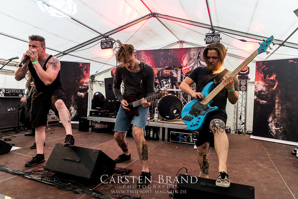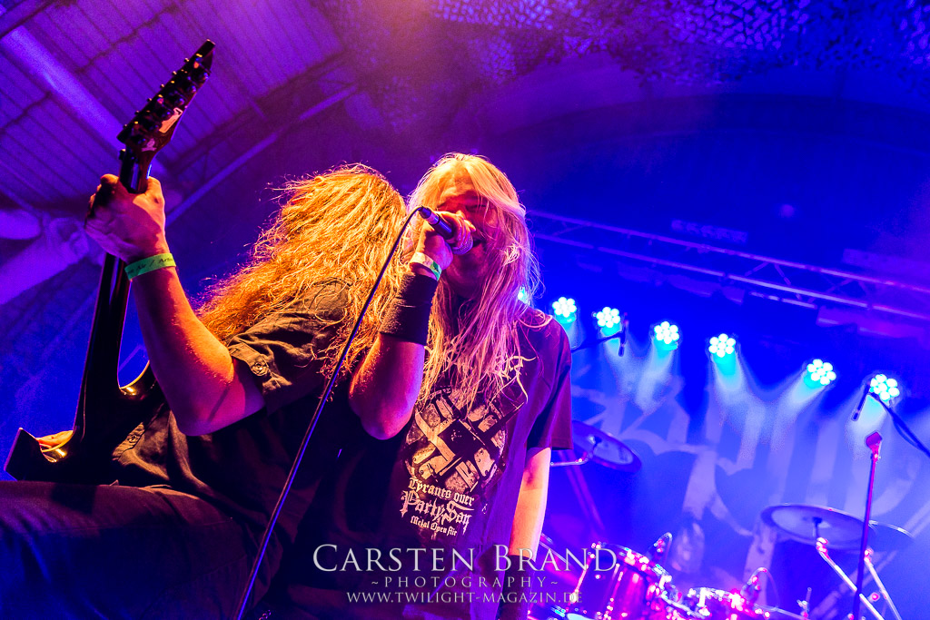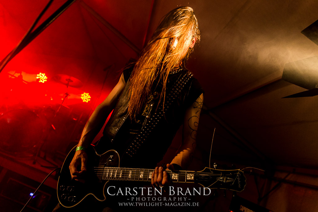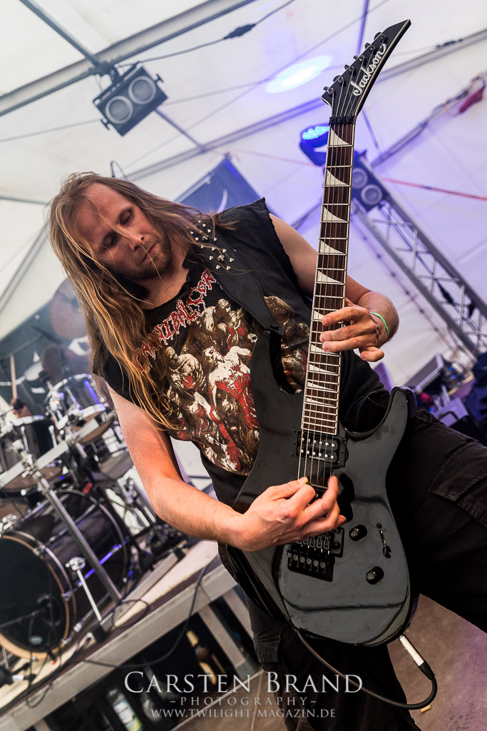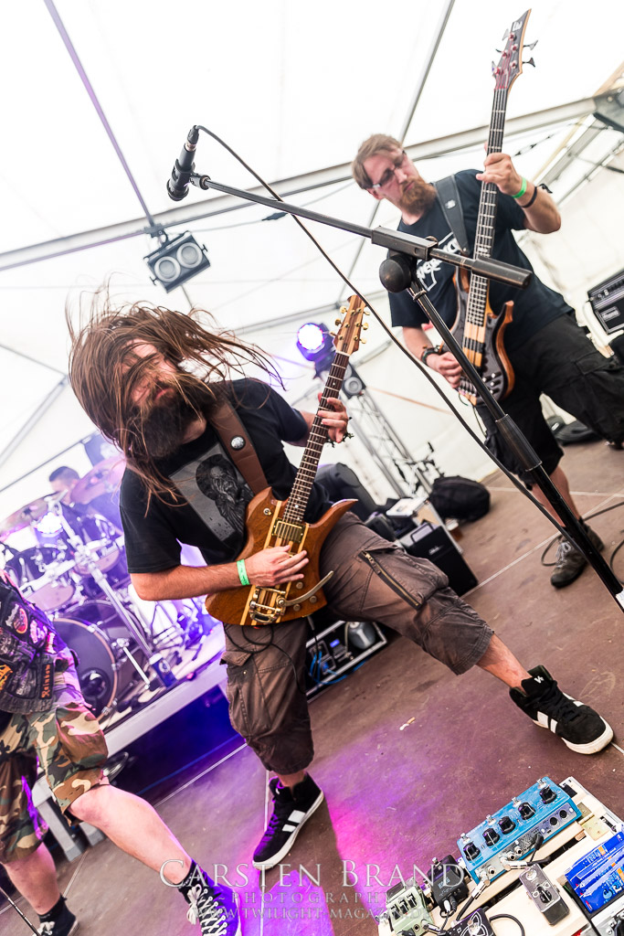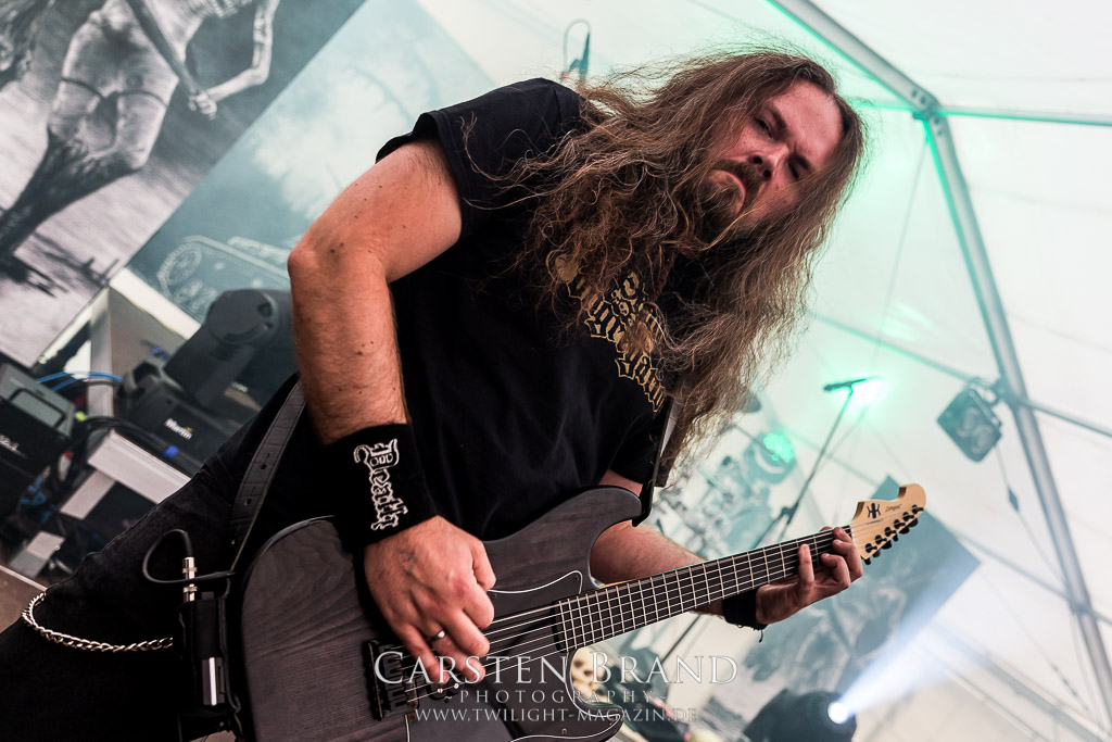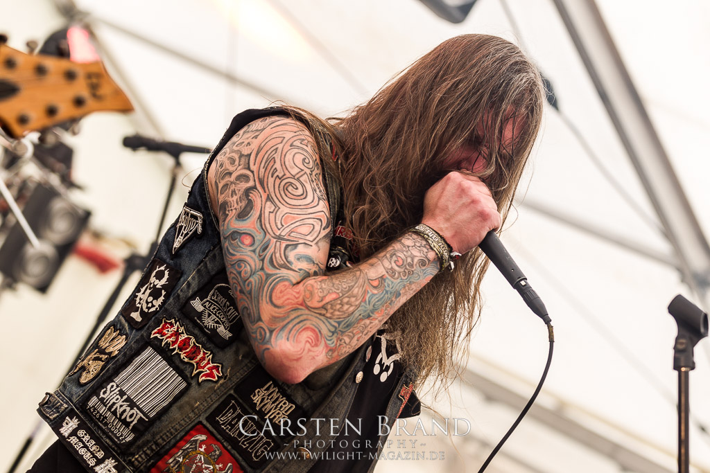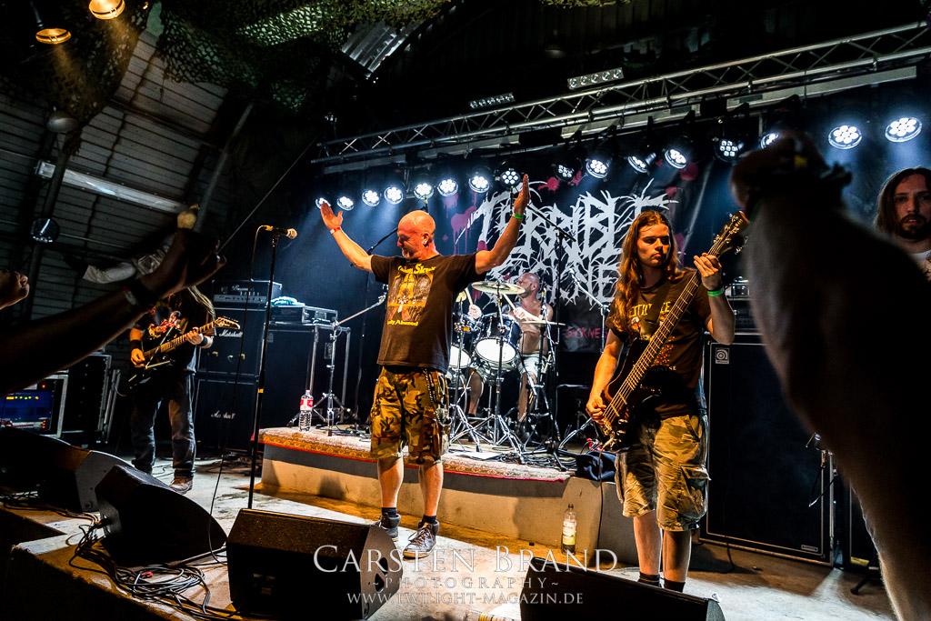 Die Magdeburger TORTURIZED haben in den letzten zehn Jahren eine gewaltige Entwicklung genommen, von der klassischen Old-School - Death Metal - Band zur modern ausgerichteten Tech-Death-Formation, und das komplett ohne Label im Rücken. Das jüngste Zeugnis "Omnivore" gleicht einer Urgewalt, die, gebündelt durch die spielerische Klasse der Musiker in kontrollierte Bahnen gelenkt wird. Das unterstreicht auch die beeindruckende halbe Stunde im Zelt, bei der der Sound heute leider nicht ganz so gut wie an den vorangegangenen Tagen ist. Dennoch würde ich mir zukünftig wieder mehr Bauch statt Kopf im Hause Torturized wünschen, sind Songs und handwerkliches Können zwar über jeden Zweifel erhaben, aber gerade Live wirkt mir das ganze mittlerweile zu klinisch, steril und klingt manchmal schon fast (Siggi, verzeih´ mir diesen Ausdruck!!!) wie Hipster - Death Metal. (JD)