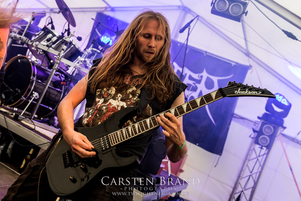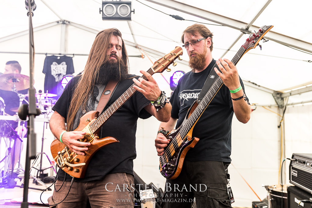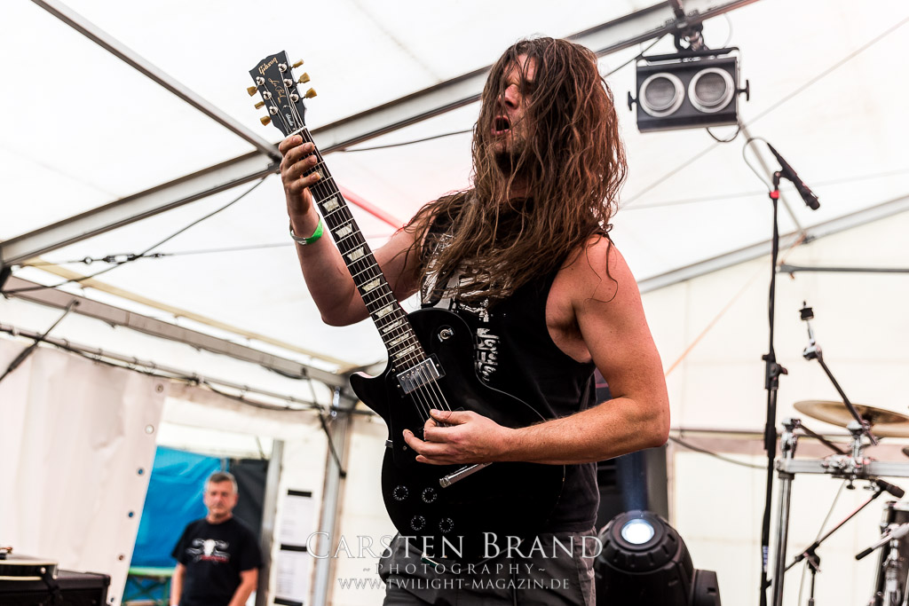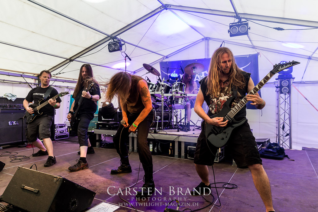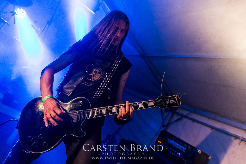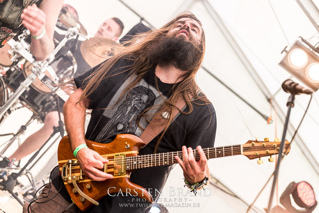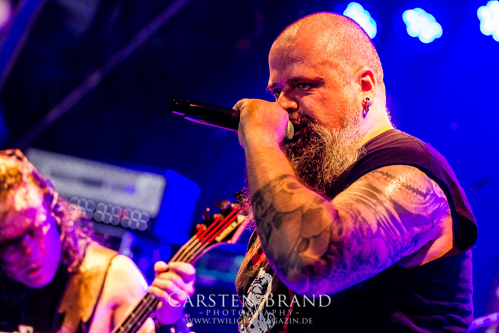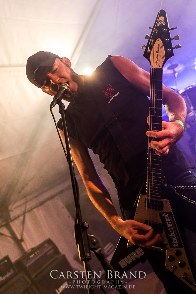 Die Magdeburger TORTURIZED haben in den letzten zehn Jahren eine gewaltige Entwicklung genommen, von der klassischen Old-School - Death Metal - Band zur modern ausgerichteten Tech-Death-Formation, und das komplett ohne Label im Rücken. Das jüngste Zeugnis "Omnivore" gleicht einer Urgewalt, die, gebündelt durch die spielerische Klasse der Musiker in kontrollierte Bahnen gelenkt wird. Das unterstreicht auch die beeindruckende halbe Stunde im Zelt, bei der der Sound heute leider nicht ganz so gut wie an den vorangegangenen Tagen ist. Dennoch würde ich mir zukünftig wieder mehr Bauch statt Kopf im Hause Torturized wünschen, sind Songs und handwerkliches Können zwar über jeden Zweifel erhaben, aber gerade Live wirkt mir das ganze mittlerweile zu klinisch, steril und klingt manchmal schon fast (Siggi, verzeih´ mir diesen Ausdruck!!!) wie Hipster - Death Metal. (JD)