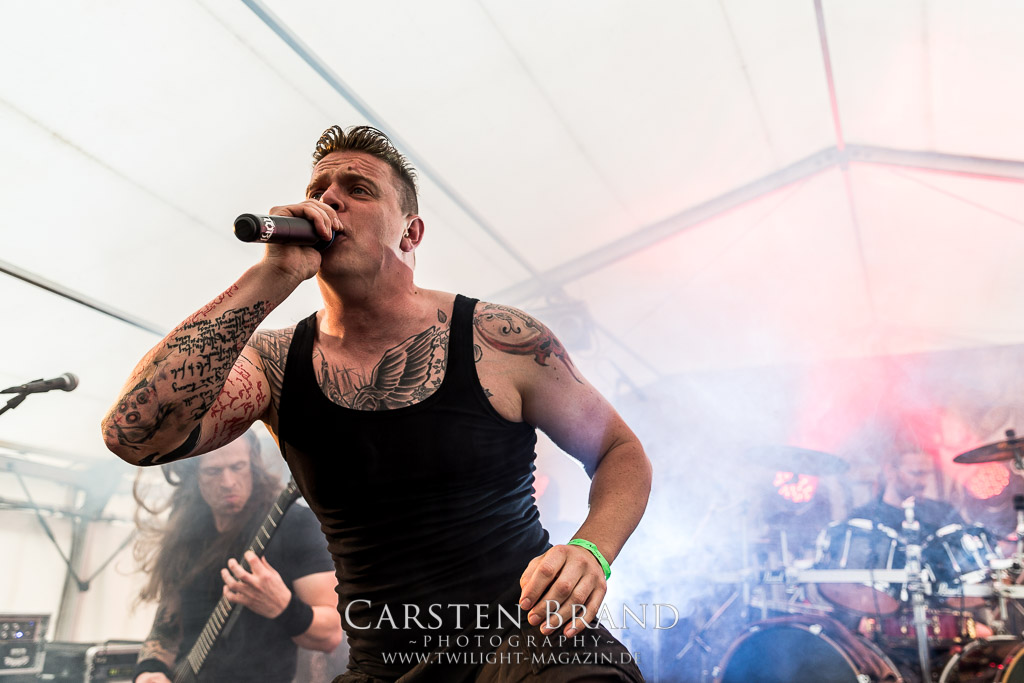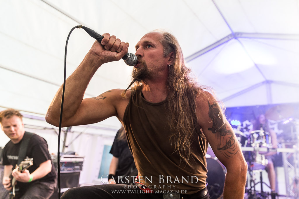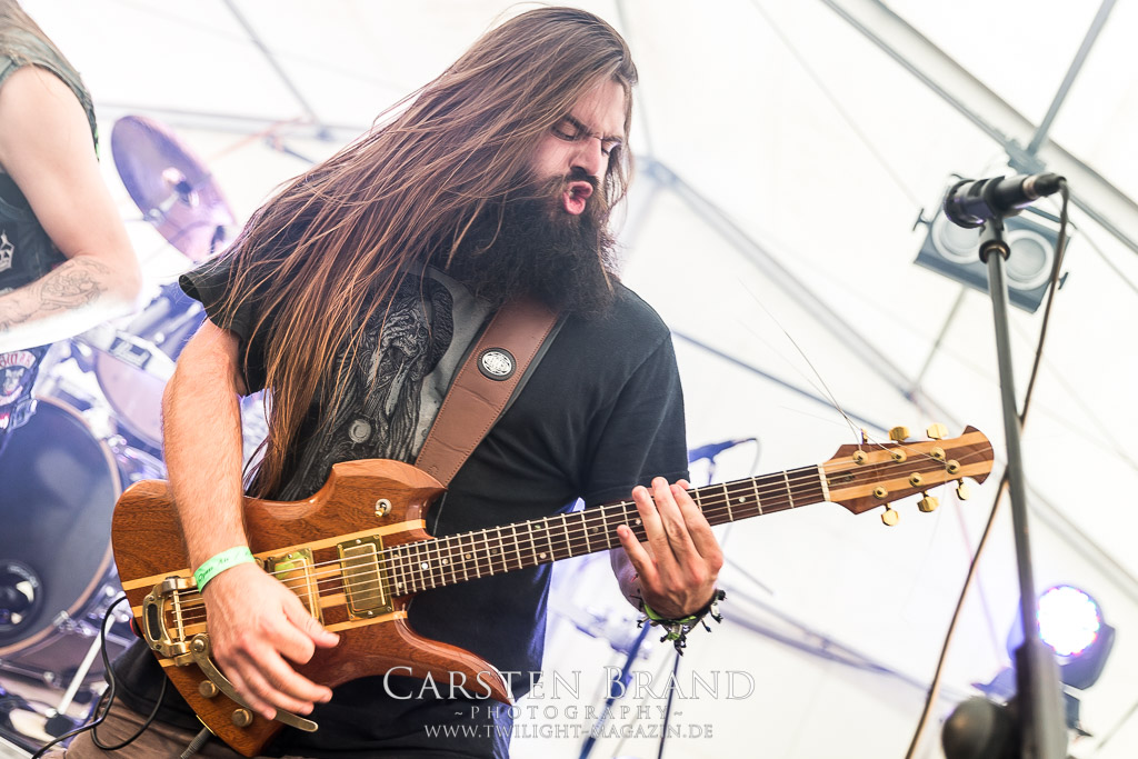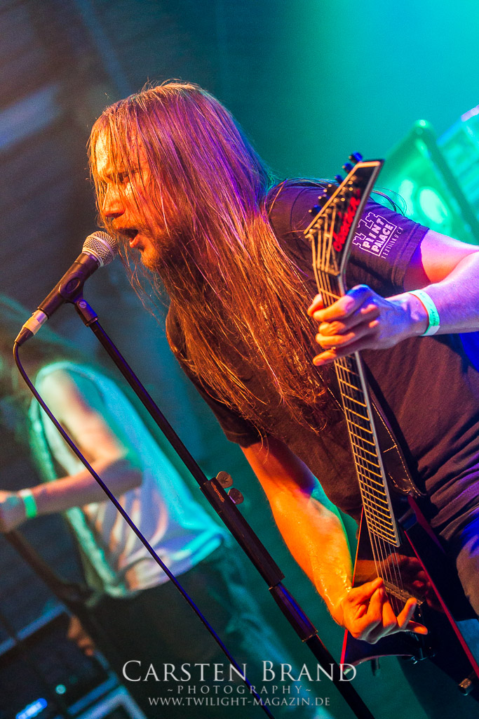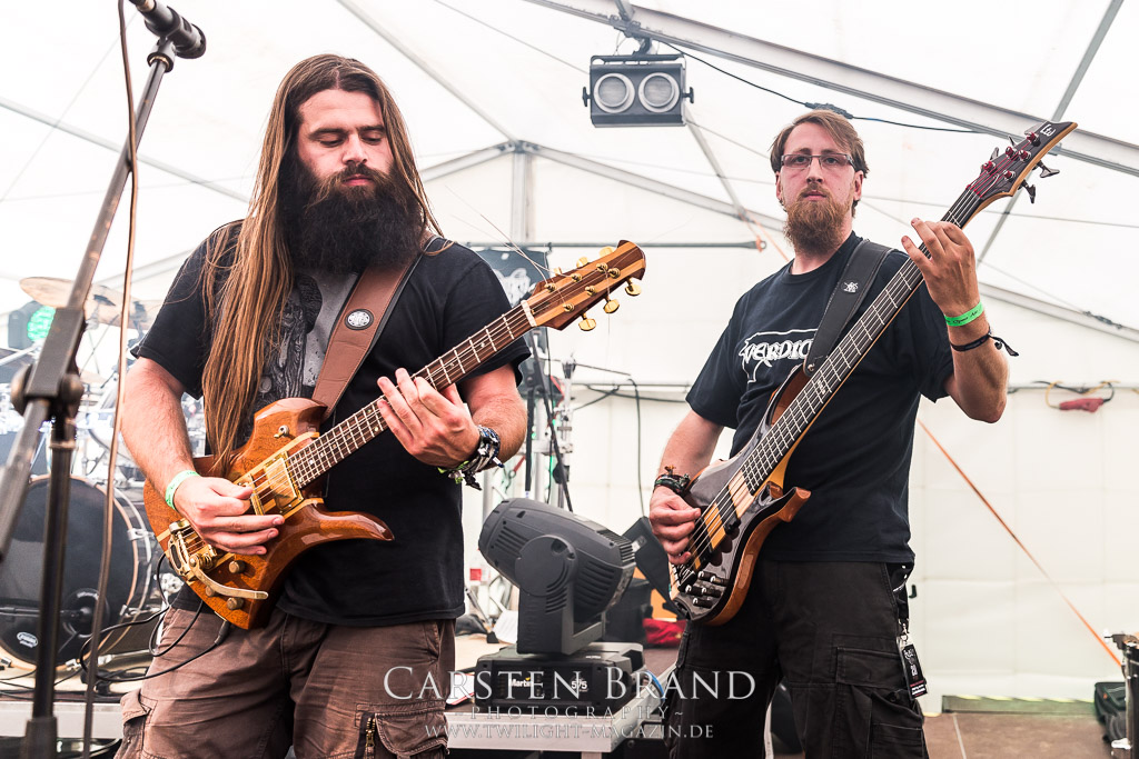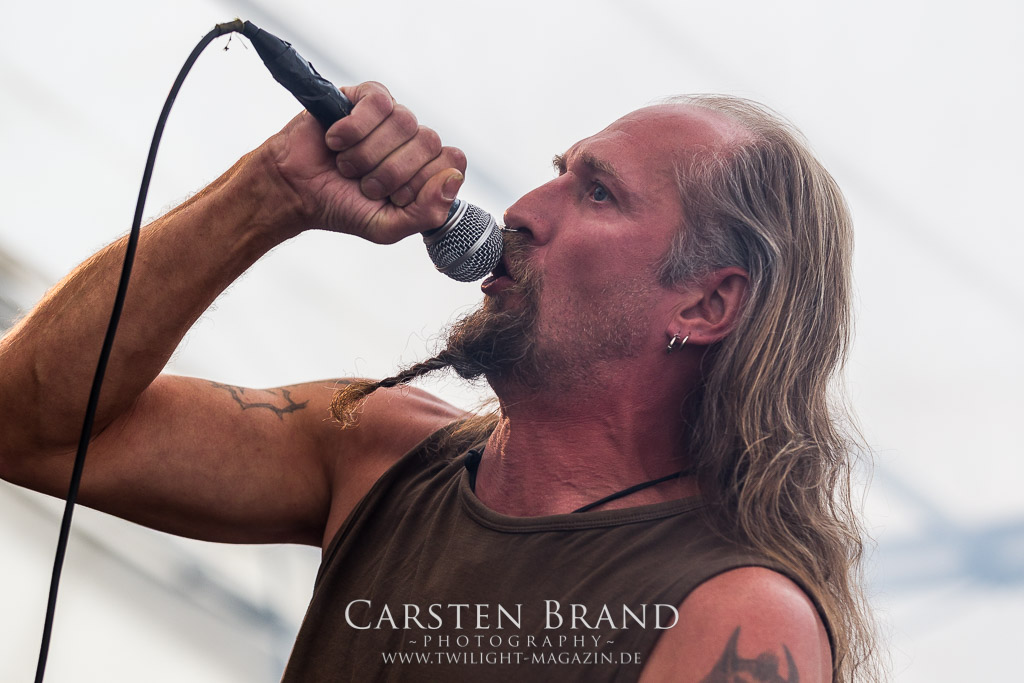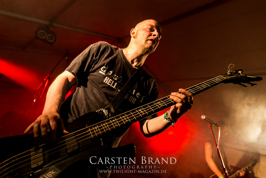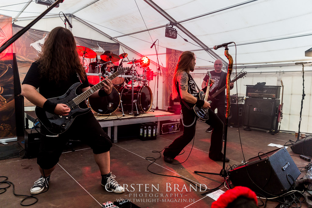 Die Magdeburger TORTURIZED haben in den letzten zehn Jahren eine gewaltige Entwicklung genommen, von der klassischen Old-School - Death Metal - Band zur modern ausgerichteten Tech-Death-Formation, und das komplett ohne Label im Rücken. Das jüngste Zeugnis "Omnivore" gleicht einer Urgewalt, die, gebündelt durch die spielerische Klasse der Musiker in kontrollierte Bahnen gelenkt wird. Das unterstreicht auch die beeindruckende halbe Stunde im Zelt, bei der der Sound heute leider nicht ganz so gut wie an den vorangegangenen Tagen ist. Dennoch würde ich mir zukünftig wieder mehr Bauch statt Kopf im Hause Torturized wünschen, sind Songs und handwerkliches Können zwar über jeden Zweifel erhaben, aber gerade Live wirkt mir das ganze mittlerweile zu klinisch, steril und klingt manchmal schon fast (Siggi, verzeih´ mir diesen Ausdruck!!!) wie Hipster - Death Metal. (JD)