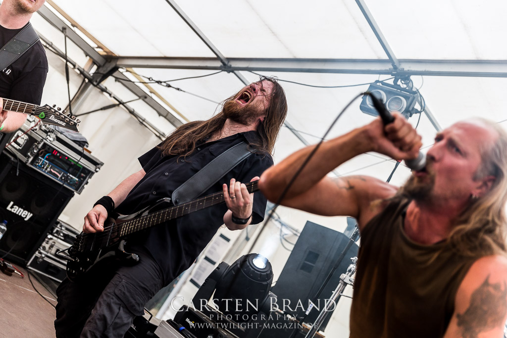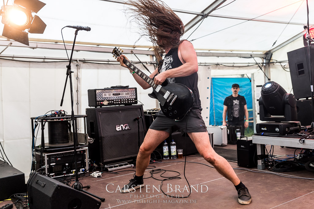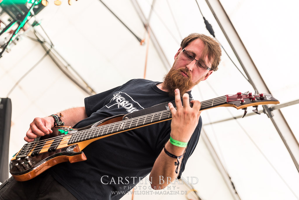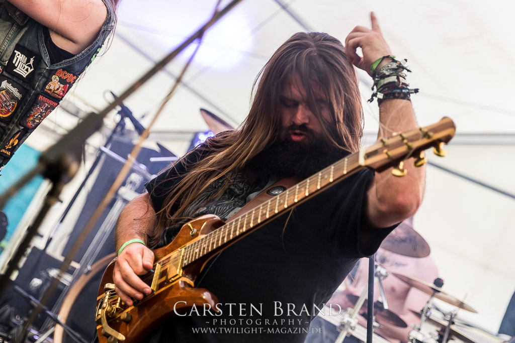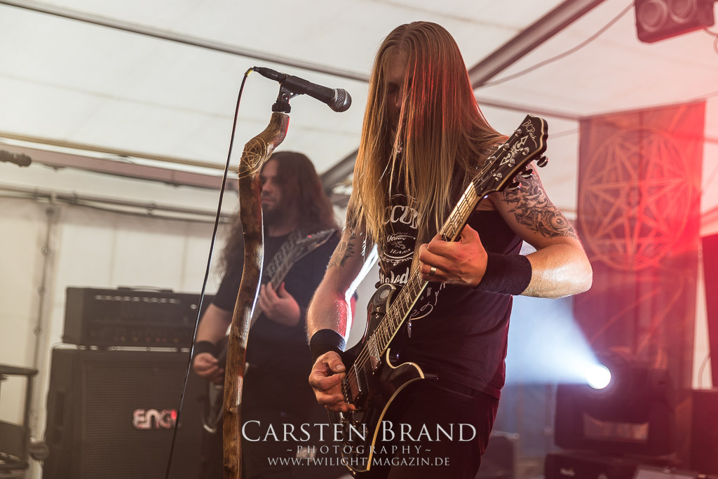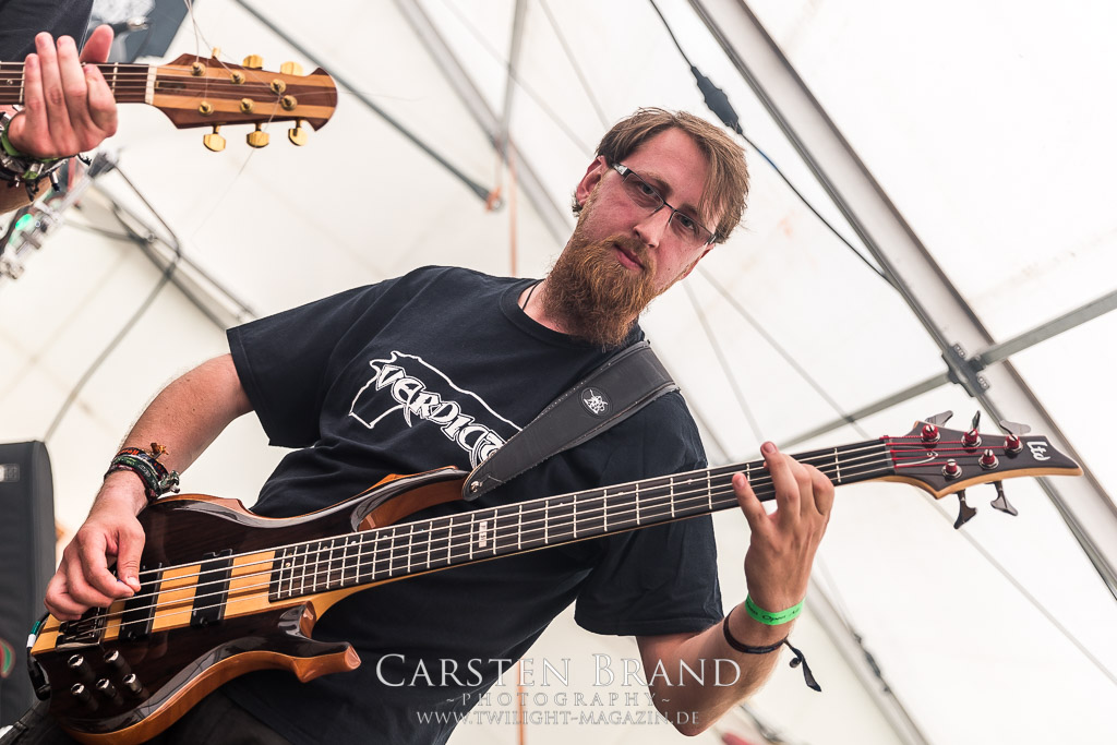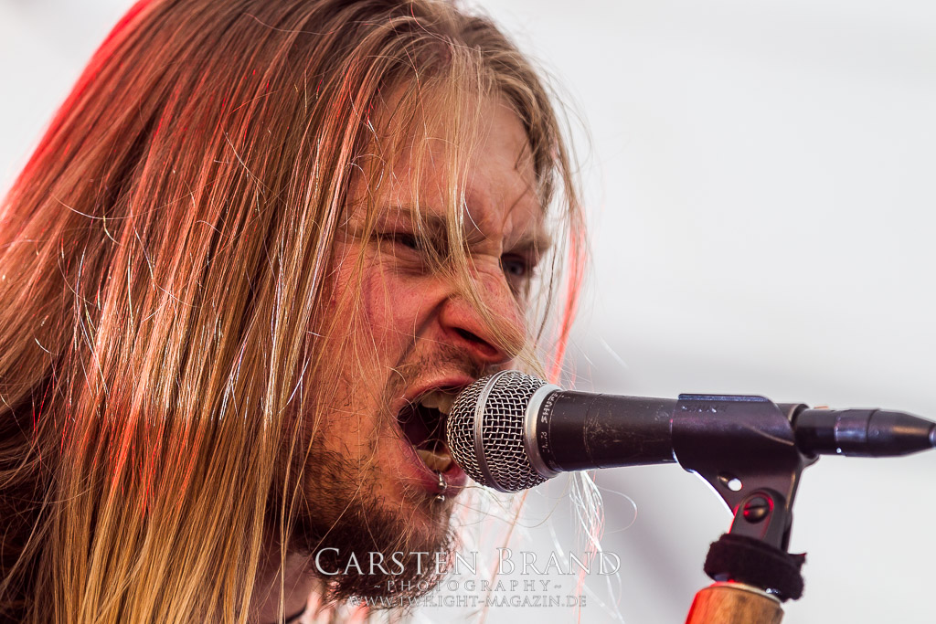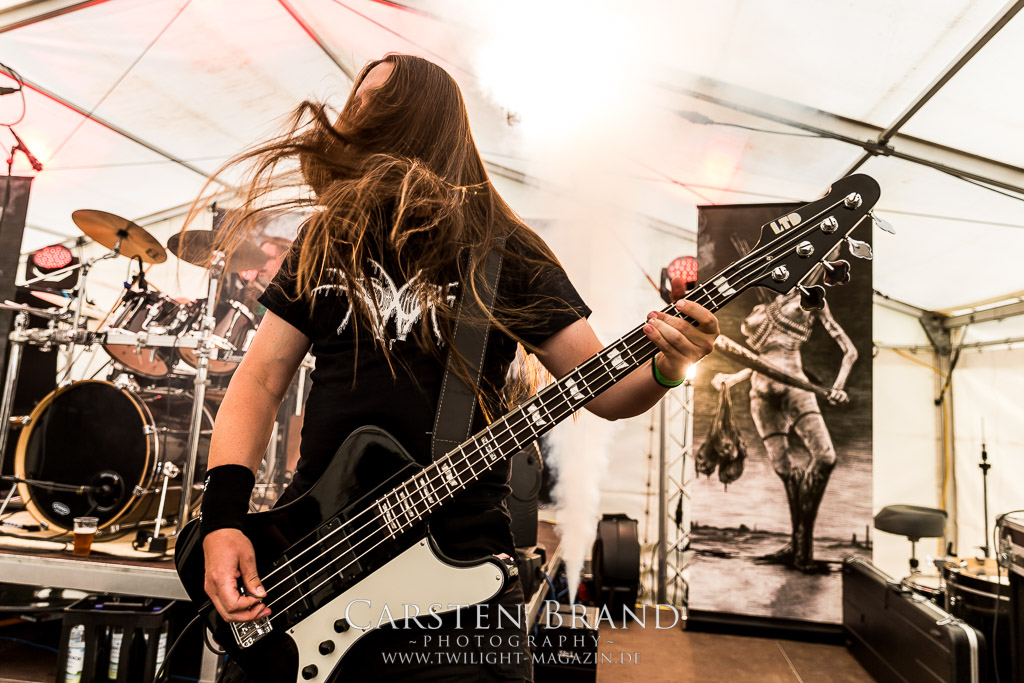 Die Magdeburger TORTURIZED haben in den letzten zehn Jahren eine gewaltige Entwicklung genommen, von der klassischen Old-School - Death Metal - Band zur modern ausgerichteten Tech-Death-Formation, und das komplett ohne Label im Rücken. Das jüngste Zeugnis "Omnivore" gleicht einer Urgewalt, die, gebündelt durch die spielerische Klasse der Musiker in kontrollierte Bahnen gelenkt wird. Das unterstreicht auch die beeindruckende halbe Stunde im Zelt, bei der der Sound heute leider nicht ganz so gut wie an den vorangegangenen Tagen ist. Dennoch würde ich mir zukünftig wieder mehr Bauch statt Kopf im Hause Torturized wünschen, sind Songs und handwerkliches Können zwar über jeden Zweifel erhaben, aber gerade Live wirkt mir das ganze mittlerweile zu klinisch, steril und klingt manchmal schon fast (Siggi, verzeih´ mir diesen Ausdruck!!!) wie Hipster - Death Metal. (JD)