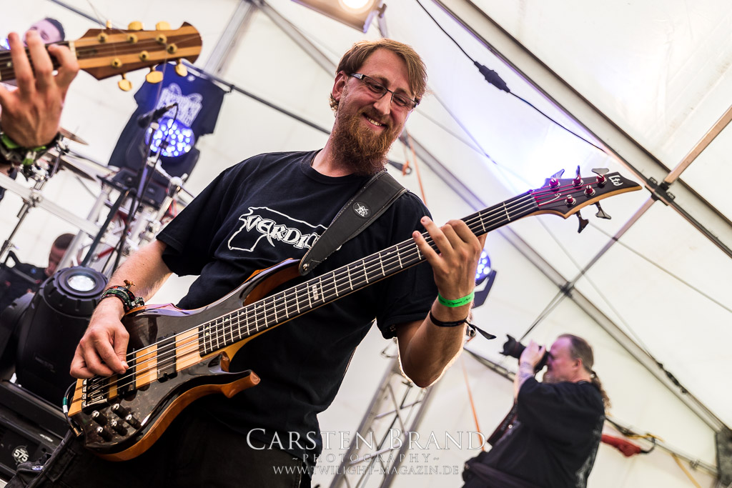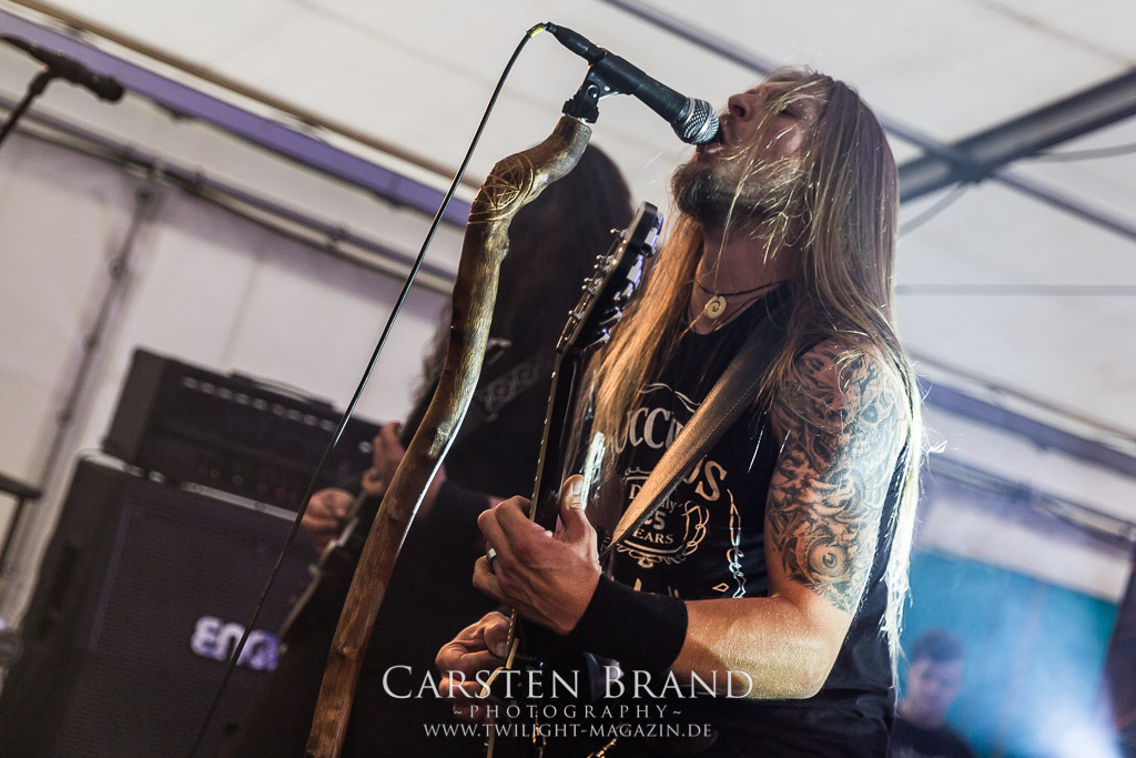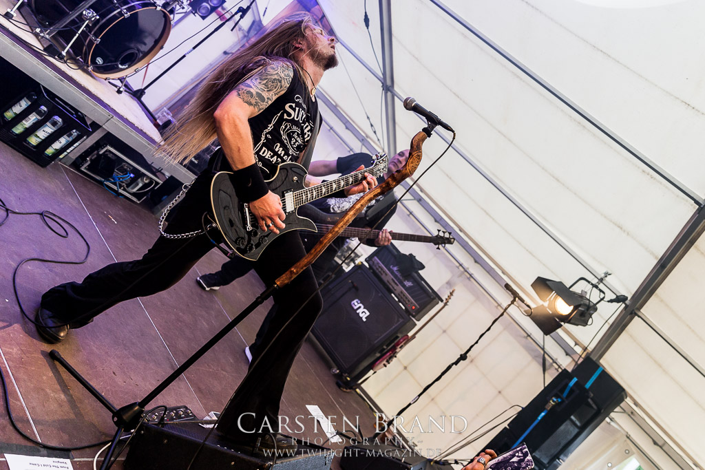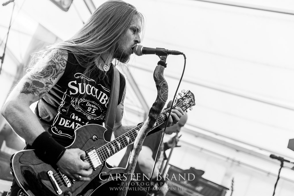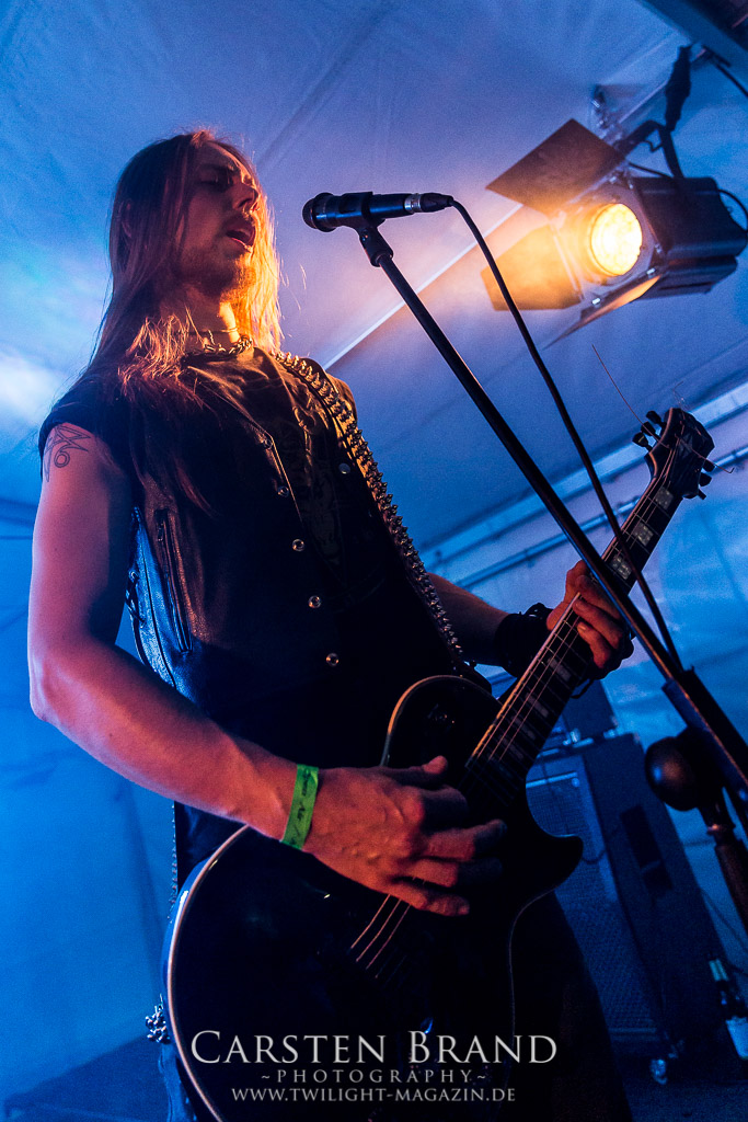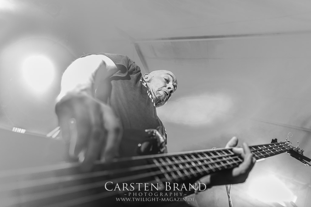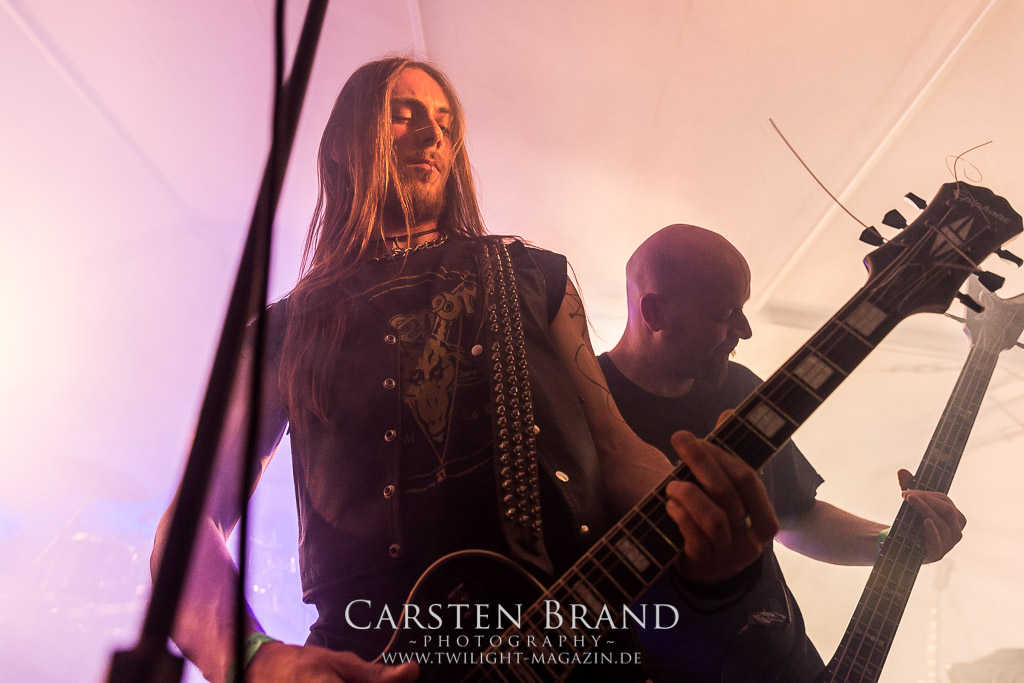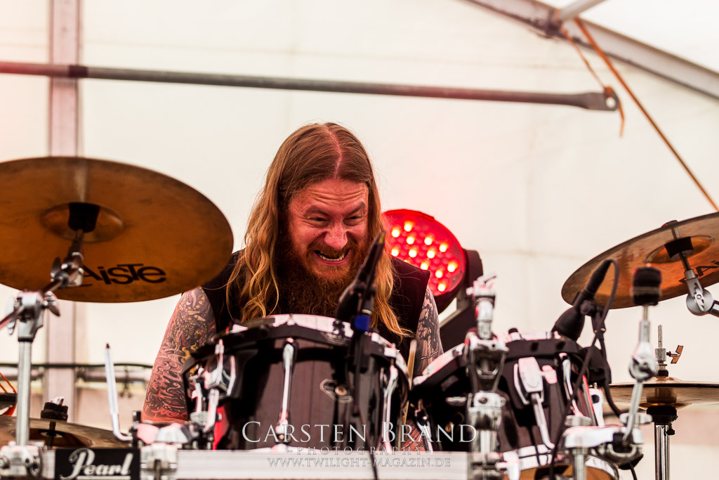 Die Magdeburger TORTURIZED haben in den letzten zehn Jahren eine gewaltige Entwicklung genommen, von der klassischen Old-School - Death Metal - Band zur modern ausgerichteten Tech-Death-Formation, und das komplett ohne Label im Rücken. Das jüngste Zeugnis "Omnivore" gleicht einer Urgewalt, die, gebündelt durch die spielerische Klasse der Musiker in kontrollierte Bahnen gelenkt wird. Das unterstreicht auch die beeindruckende halbe Stunde im Zelt, bei der der Sound heute leider nicht ganz so gut wie an den vorangegangenen Tagen ist. Dennoch würde ich mir zukünftig wieder mehr Bauch statt Kopf im Hause Torturized wünschen, sind Songs und handwerkliches Können zwar über jeden Zweifel erhaben, aber gerade Live wirkt mir das ganze mittlerweile zu klinisch, steril und klingt manchmal schon fast (Siggi, verzeih´ mir diesen Ausdruck!!!) wie Hipster - Death Metal. (JD)