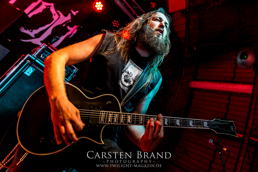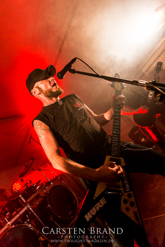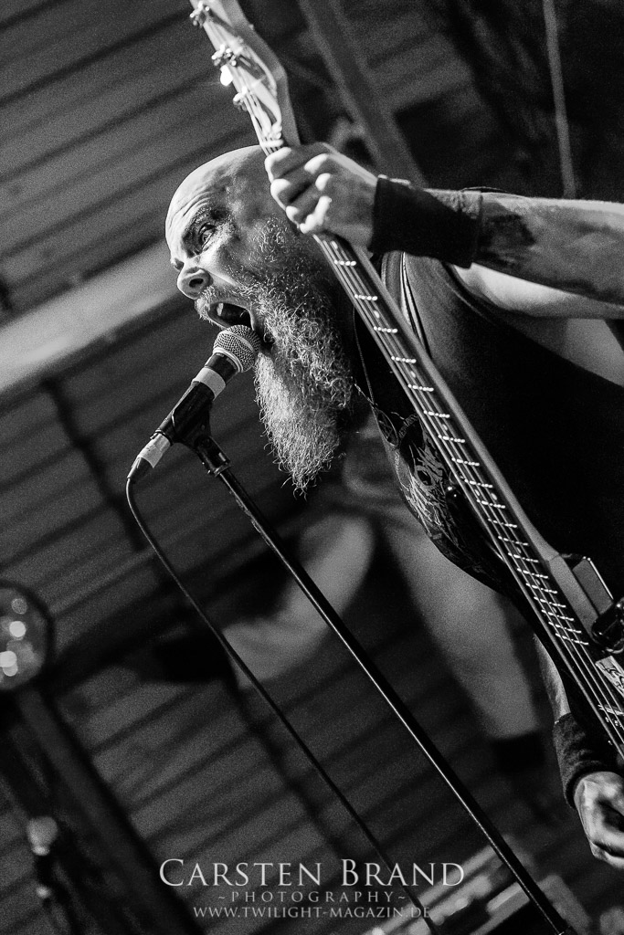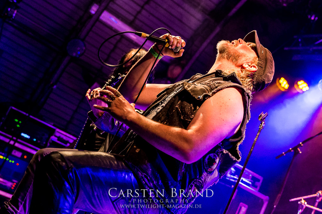 Weniger Black Sabbath als Pantera haben die Sondershausener von BLACK MOOD in ihren Einflüssen, wodurch sie sich in ihrer ähnlichen Grundausrichtung von ihren Kollegen abheben. Das Duo, um die Brüder Izz (Gitarre, Vocals) und Sleaze (Drums) steht mittlerweile in der Tradition von Bands, die einen Bassisten für verzichtbar halten und stattdessen für die Gitarre mit allerlei Verstärker-Technik experimentieren, um möglichst wenig Sound-Einbußen zu haben. Wie schon bei meinem ersten Kontakt mit den Thüringern, die im vergangenen Jahr als Opener für die kongenialen Castle in Göttingen fungierten, spielen sich die beiden Herren den Allerwertesten ab und wissen das Publikum von Beginn an mit ihrem groovenden, metallischen Southern-Rock zu überzeugen.