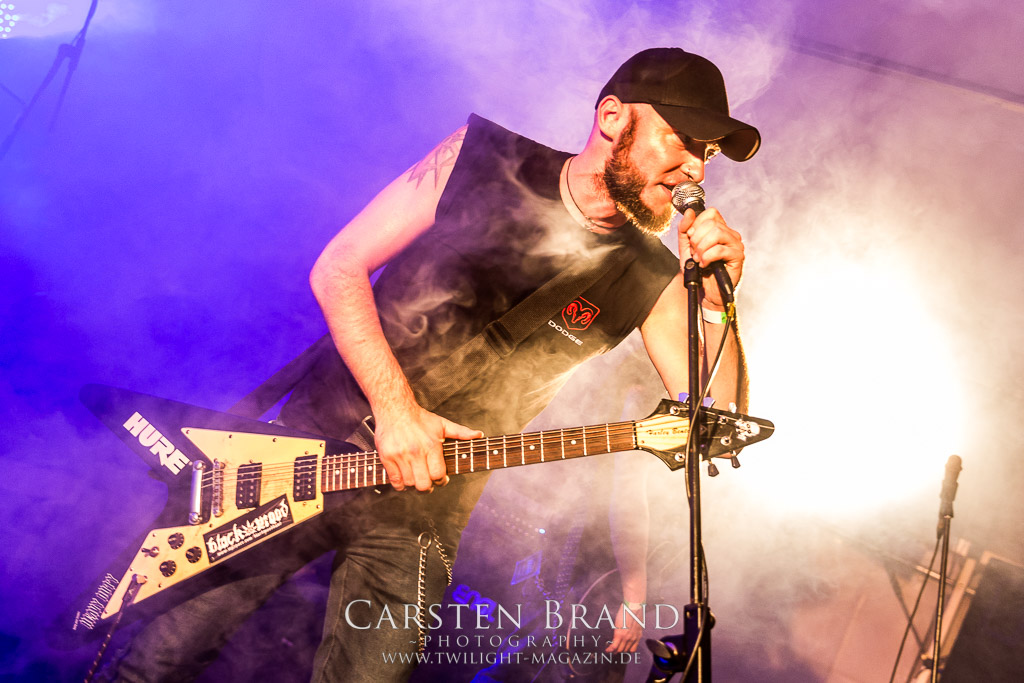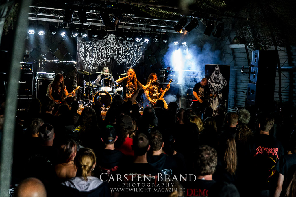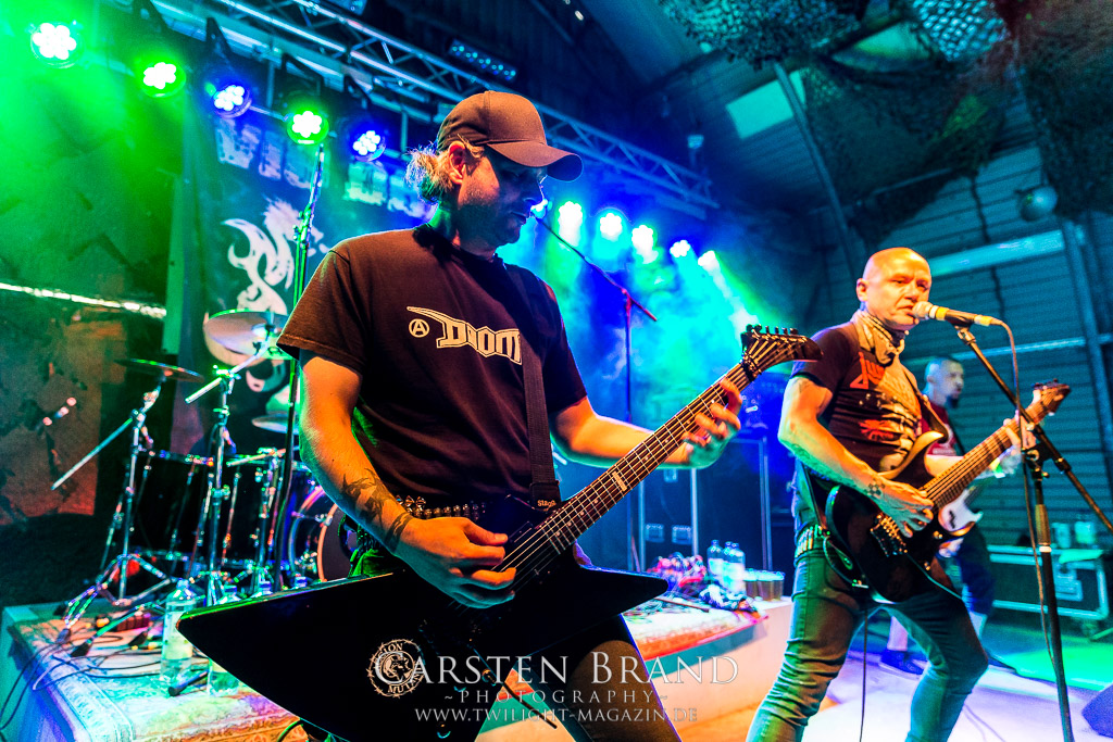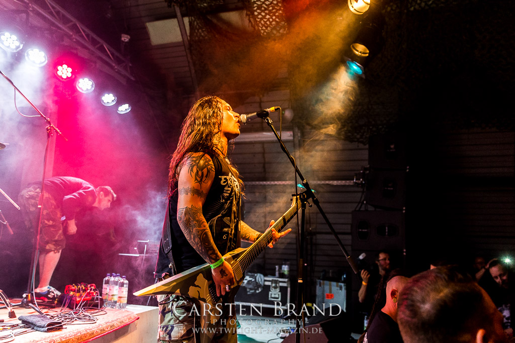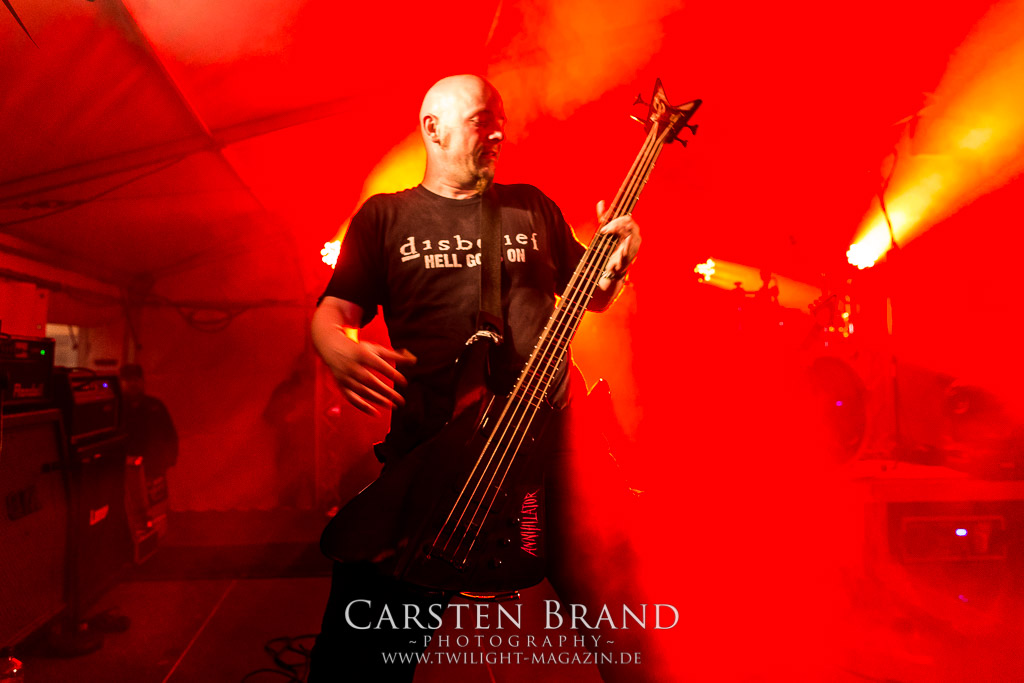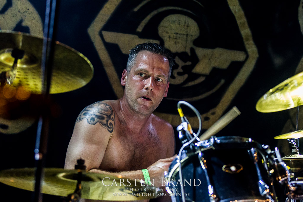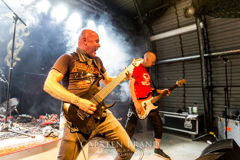 Dass die Band ihr stilistisches Alleinstellungsmerkmal, nämlich die ungarischen Folklore-Einflüsse, auf ihren zukünftigen Veröffentlichungen zunehmend vernachlässigte, führte nicht nur dazu, dass sich das Quartett spätestens ab "Destroy" zunehmend aus meiner Hörweite verabschiedete, sondern, dass ich mit Ektomorf bis heute vornehmlich Musik verbinde, die wie Sepultura klingt, als diese schon scheiße waren. Doch die Band funktioniert hervorragend und sogar als Co-Headliner ziehen sie die Leute nicht nur in Scharen in den Hangar, sondern wissen diese auch noch amtlich zum Toben zu bringen, so dass ich neidlos anerkennen muss, dass diese Formation, wenn sie auch musikalisch nicht originell sein mag, nach wie vor über überragende Live-Qualitäten verfügt. Und auch die Streitmacht Bergisch´ Land weiß rund drei Stunden zuvor zu überzeugen. Der melodische Death Metal mit deutschen Texten ist mittlerweile erfreulich weit entfernt von Pagan Metal - Klischees und wildert stattdessen in Amon Amarth´schen gefilden, aus der Zeit, als diese noch musikalisch ernstzunehmen waren. Somit muss ich auch hier konstatieren, dass Obscurity, die wie das Protzen in diesem Jahr bereits den zwanzigsten Geburtstag feiern, sich selbst mit diesem durchaus abgefeierten Auftritt ein schönes Präsent machen, dass musikalisch eine weitere Abwechslung zwischen all dem Geballer ist. Was sonst noch passierte? Nachdem Auftritt der emsländischen Melodic-Deather ISLAY beginnt mit DISASTER K. F. W. im Zelt der Auftakt zum Abend der ostdeutschen Metal-Legenden. Auch wenn das seit 1985 aktive Quintett um den ehemaligen Reiter-Drummer Skeleton die Intensität ihres bärenstarken jüngsten Albums "Pieces" nicht voll auf die Bühne bringen kann, so machen Songs wie "The Black Death" doch ordentlich Laune und bereiten den Boden, für das, was da noch kommen soll.