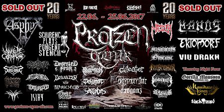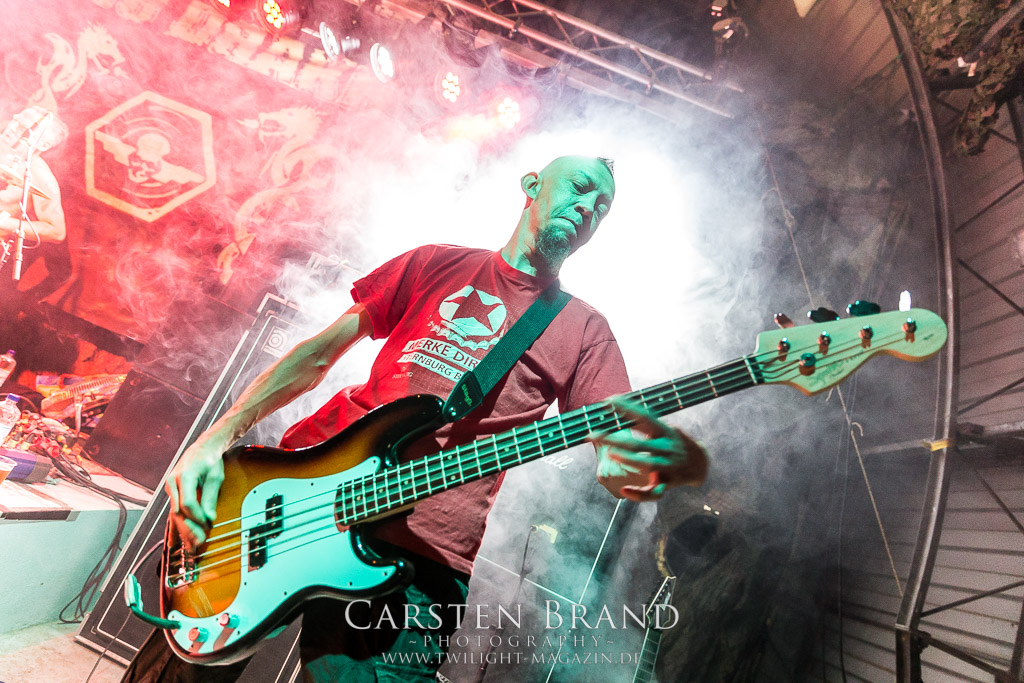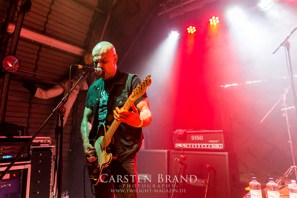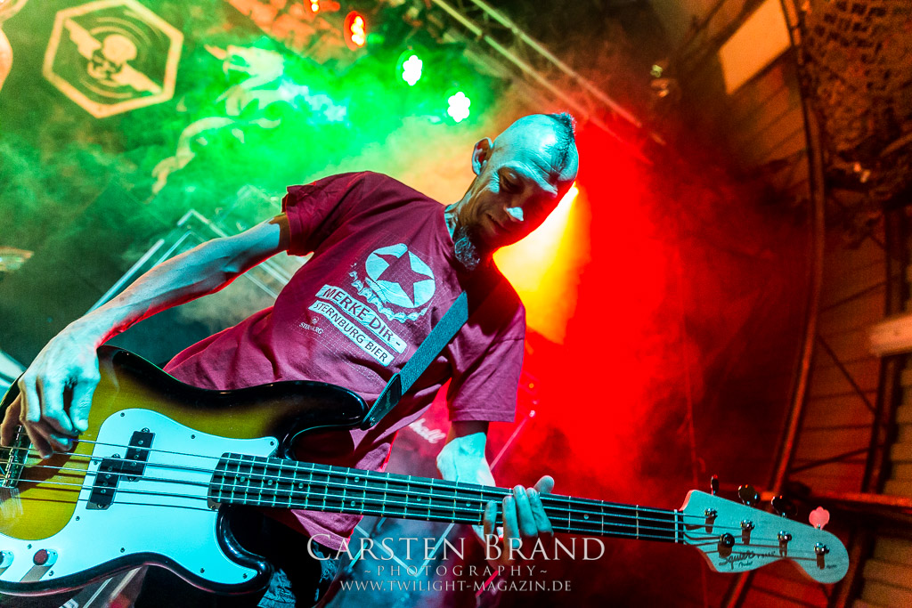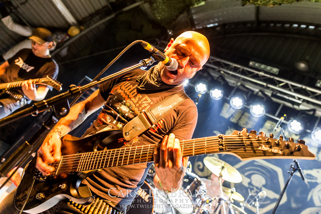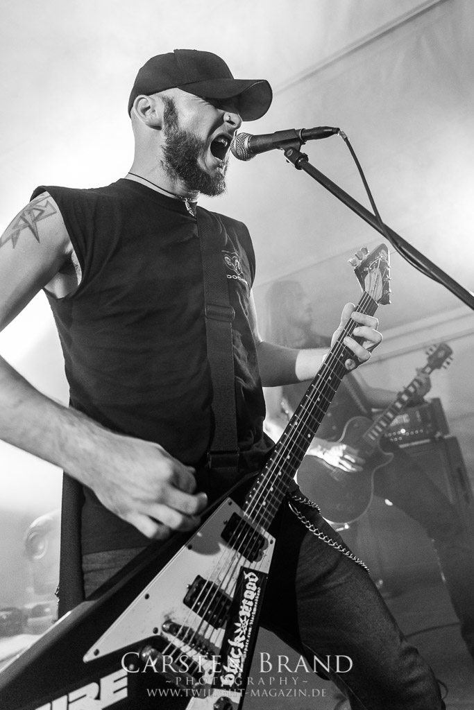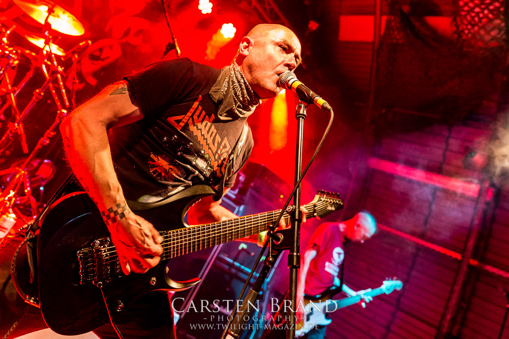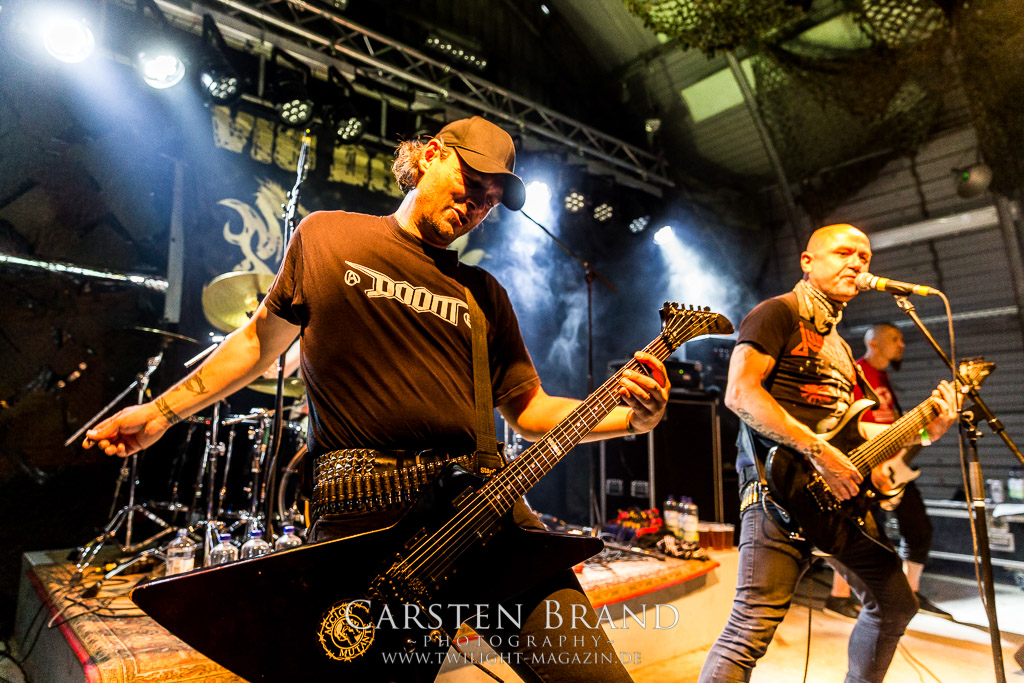 Dass die Band ihr stilistisches Alleinstellungsmerkmal, nämlich die ungarischen Folklore-Einflüsse, auf ihren zukünftigen Veröffentlichungen zunehmend vernachlässigte, führte nicht nur dazu, dass sich das Quartett spätestens ab "Destroy" zunehmend aus meiner Hörweite verabschiedete, sondern, dass ich mit Ektomorf bis heute vornehmlich Musik verbinde, die wie Sepultura klingt, als diese schon scheiße waren. Doch die Band funktioniert hervorragend und sogar als Co-Headliner ziehen sie die Leute nicht nur in Scharen in den Hangar, sondern wissen diese auch noch amtlich zum Toben zu bringen, so dass ich neidlos anerkennen muss, dass diese Formation, wenn sie auch musikalisch nicht originell sein mag, nach wie vor über überragende Live-Qualitäten verfügt. Und auch die Streitmacht Bergisch´ Land weiß rund drei Stunden zuvor zu überzeugen. Der melodische Death Metal mit deutschen Texten ist mittlerweile erfreulich weit entfernt von Pagan Metal - Klischees und wildert stattdessen in Amon Amarth´schen gefilden, aus der Zeit, als diese noch musikalisch ernstzunehmen waren. Somit muss ich auch hier konstatieren, dass Obscurity, die wie das Protzen in diesem Jahr bereits den zwanzigsten Geburtstag feiern, sich selbst mit diesem durchaus abgefeierten Auftritt ein schönes Präsent machen, dass musikalisch eine weitere Abwechslung zwischen all dem Geballer ist. Was sonst noch passierte? Nachdem Auftritt der emsländischen Melodic-Deather ISLAY beginnt mit DISASTER K. F. W. im Zelt der Auftakt zum Abend der ostdeutschen Metal-Legenden. Auch wenn das seit 1985 aktive Quintett um den ehemaligen Reiter-Drummer Skeleton die Intensität ihres bärenstarken jüngsten Albums "Pieces" nicht voll auf die Bühne bringen kann, so machen Songs wie "The Black Death" doch ordentlich Laune und bereiten den Boden, für das, was da noch kommen soll.