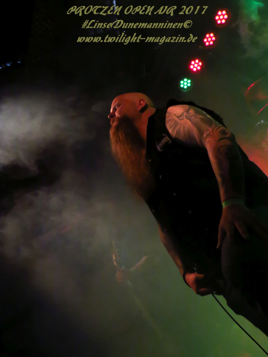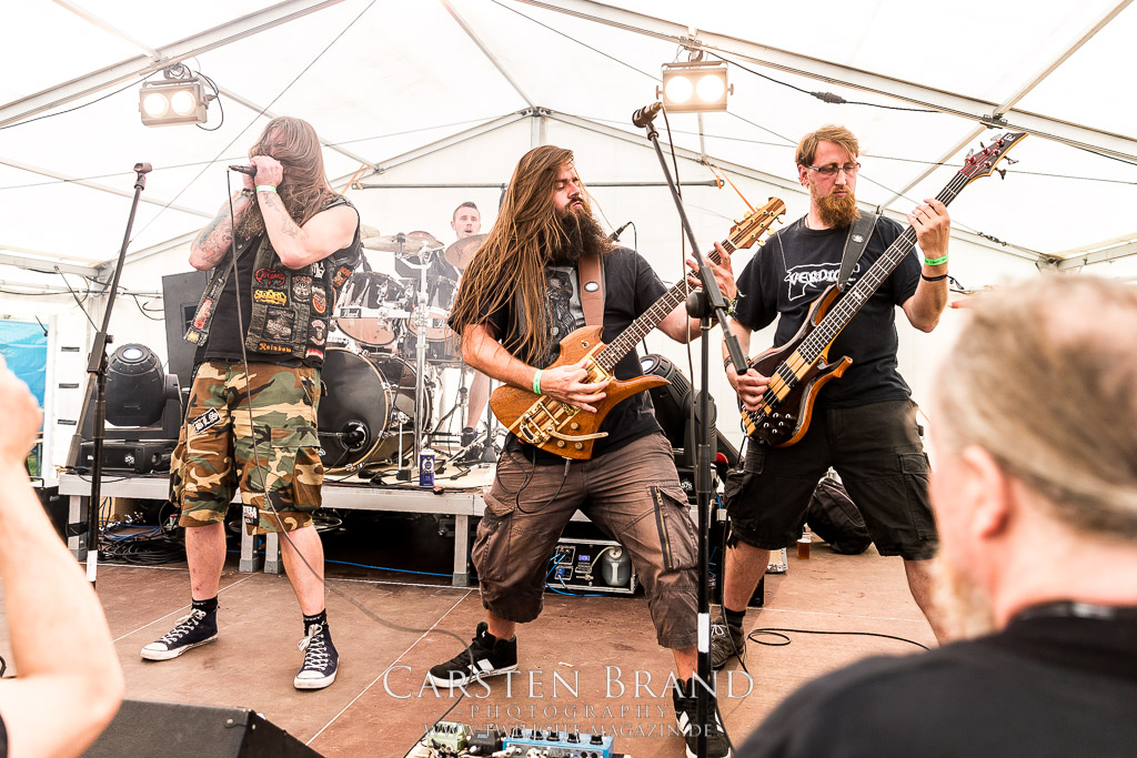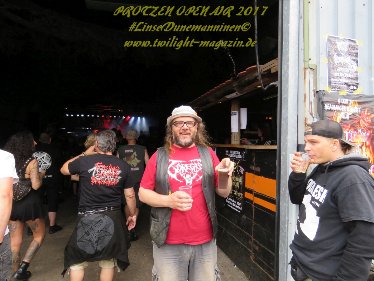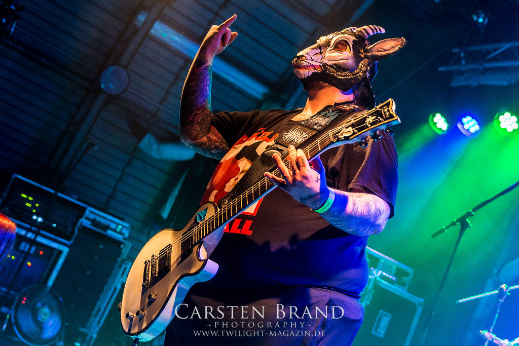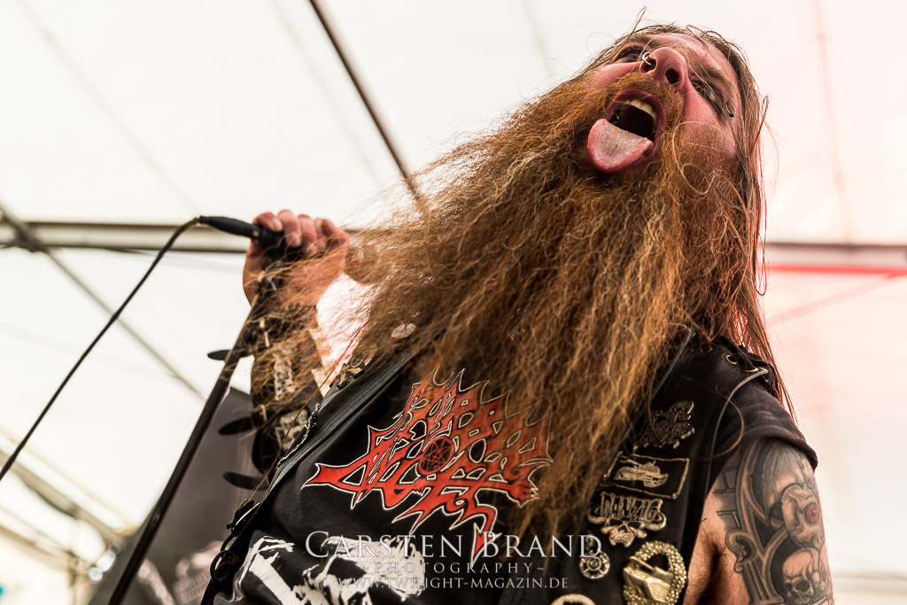 MILKING THE GOATMACHINE wissen da im Anschluss deutlich besser zu mobilisieren. Das Grindcore Trio mit den Ziegenmasken und der Vorliebe für Euro-Dance um den brüllenden Trommler Goatleeb Udder versteht sich durchaus auf brutalen, simplen aber abwechslungsreichen Death-Grind mit einer ordentlichen Prise Ironie, ohne dabei albern zu wirken. Auch wenn nicht wirklich meine musikalische Baustelle, so lasse ich mich am Ende doch gerne packen und mitreißen. Ganz starke Performance, die zeigt, wieso die Berliner schon seit geraumer Zeit in aller Munde sind. Wer sich übrigens in der Zwischenzeit fragt, wo denn die BEARDED BASTARDS und SUCCUBUS abgeblieben sind, welche gemeinsam mit Atomwinter das Zelt gerockt haben, dem sei gesagt, dass die Band- und Bühnenaufstockung durchaus Vorteile aber eben auch Nachteile hat, wenn es eben Schlag auf Schlag ohne Unterbrechung durchgeht. Und da das Zelebrieren des Wiedersehens und die Gespräche bei diversen Getränken mit vielen Freunden und Wegbegleitern im Rahmen der Protzen-Familie ein wesentlicher Bestandteil dieses Festivals ist, möge man mir es nachsehen, wenn ich diese beiden Bands unterschlage, um genussvoll durchzuschnaufen.