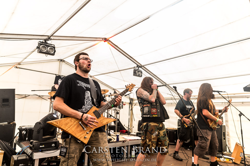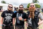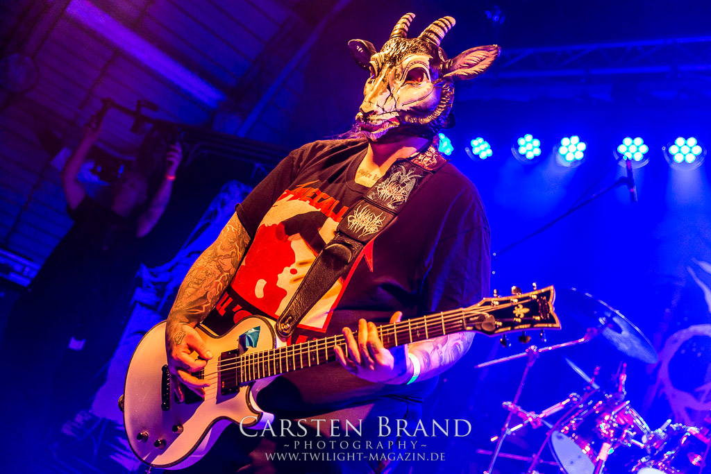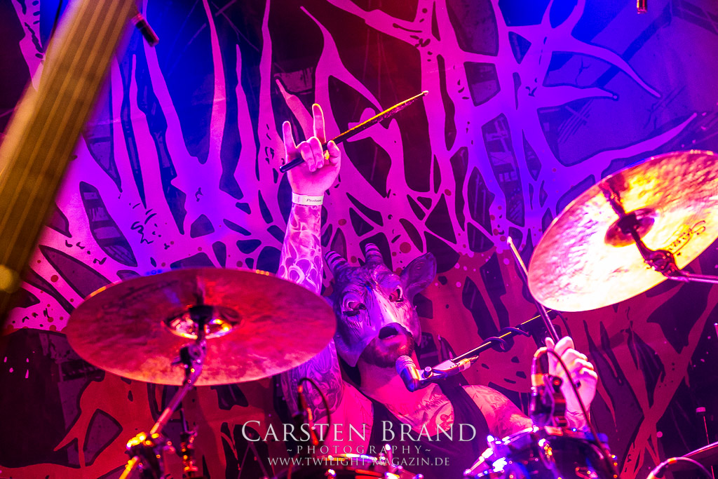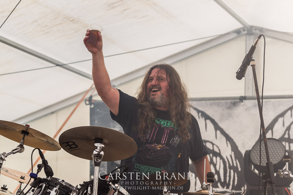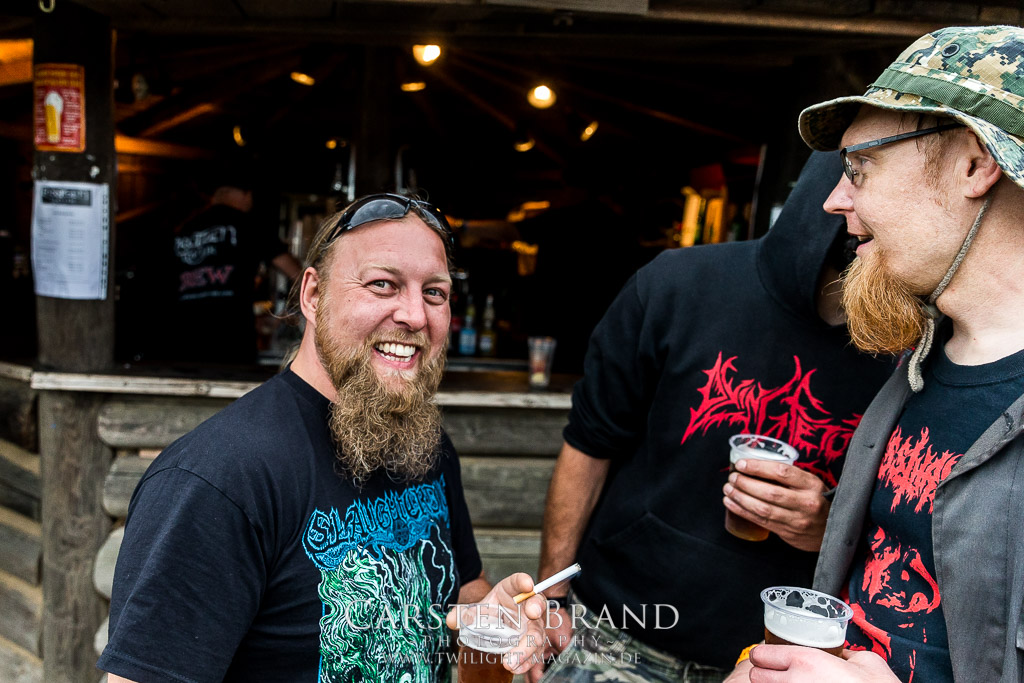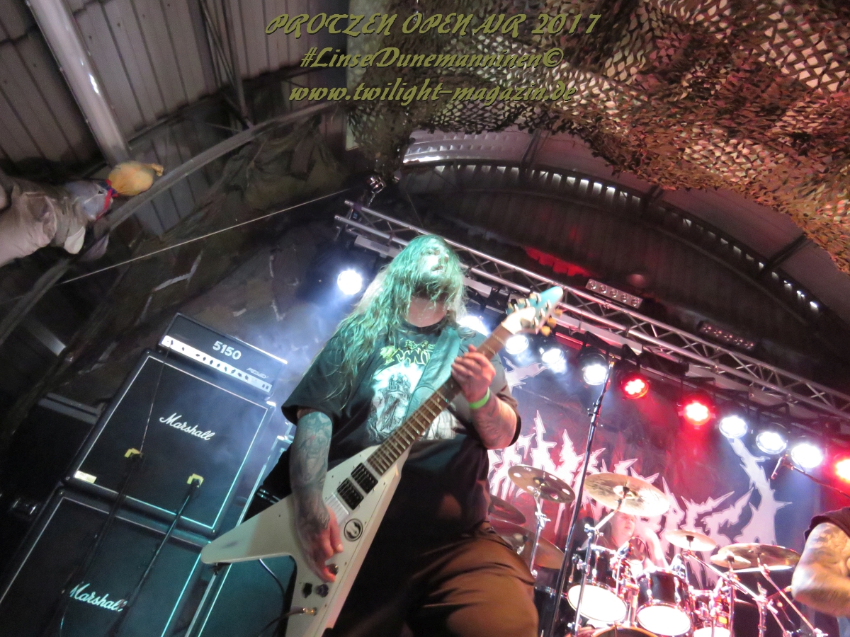 MILKING THE GOATMACHINE wissen da im Anschluss deutlich besser zu mobilisieren. Das Grindcore Trio mit den Ziegenmasken und der Vorliebe für Euro-Dance um den brüllenden Trommler Goatleeb Udder versteht sich durchaus auf brutalen, simplen aber abwechslungsreichen Death-Grind mit einer ordentlichen Prise Ironie, ohne dabei albern zu wirken. Auch wenn nicht wirklich meine musikalische Baustelle, so lasse ich mich am Ende doch gerne packen und mitreißen. Ganz starke Performance, die zeigt, wieso die Berliner schon seit geraumer Zeit in aller Munde sind. Wer sich übrigens in der Zwischenzeit fragt, wo denn die BEARDED BASTARDS und SUCCUBUS abgeblieben sind, welche gemeinsam mit Atomwinter das Zelt gerockt haben, dem sei gesagt, dass die Band- und Bühnenaufstockung durchaus Vorteile aber eben auch Nachteile hat, wenn es eben Schlag auf Schlag ohne Unterbrechung durchgeht. Und da das Zelebrieren des Wiedersehens und die Gespräche bei diversen Getränken mit vielen Freunden und Wegbegleitern im Rahmen der Protzen-Familie ein wesentlicher Bestandteil dieses Festivals ist, möge man mir es nachsehen, wenn ich diese beiden Bands unterschlage, um genussvoll durchzuschnaufen.