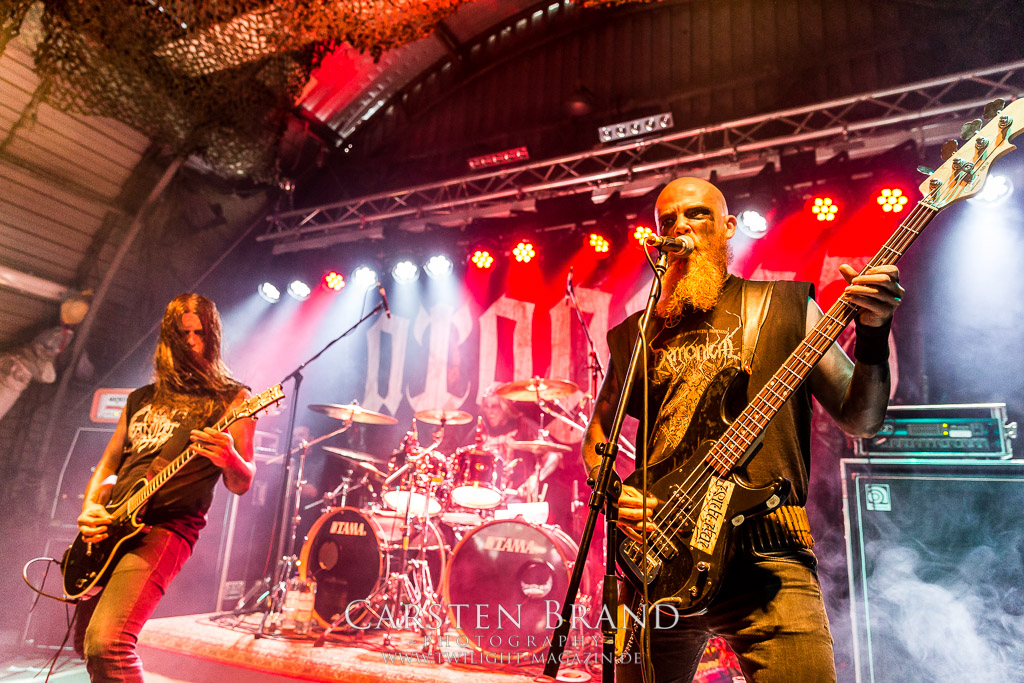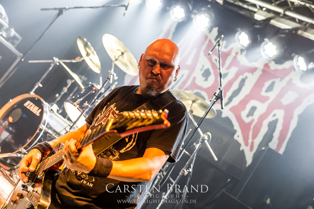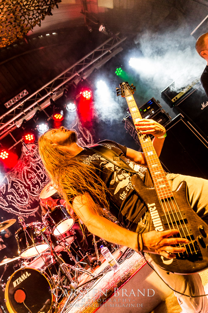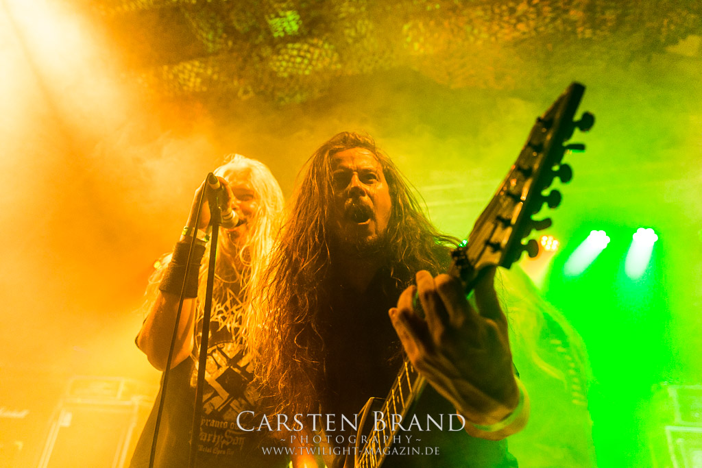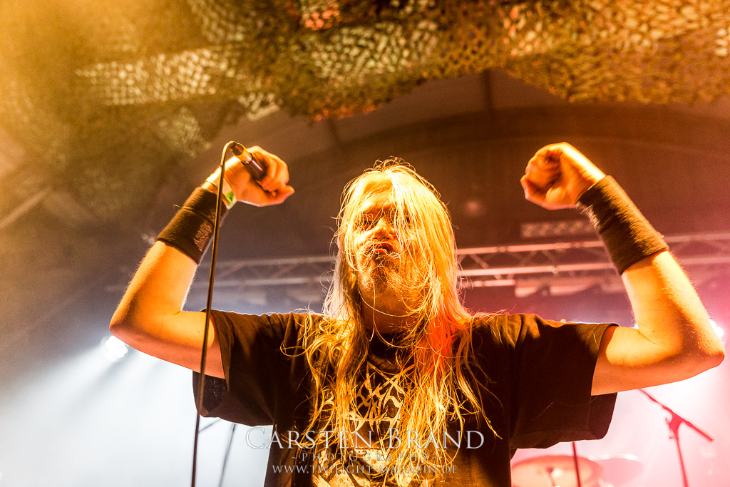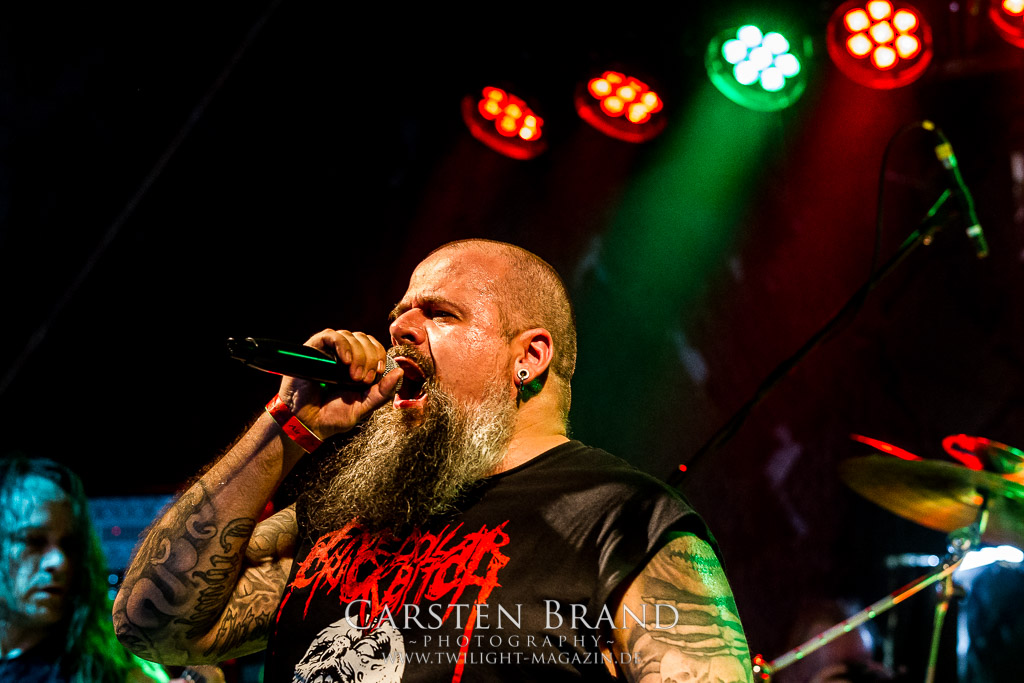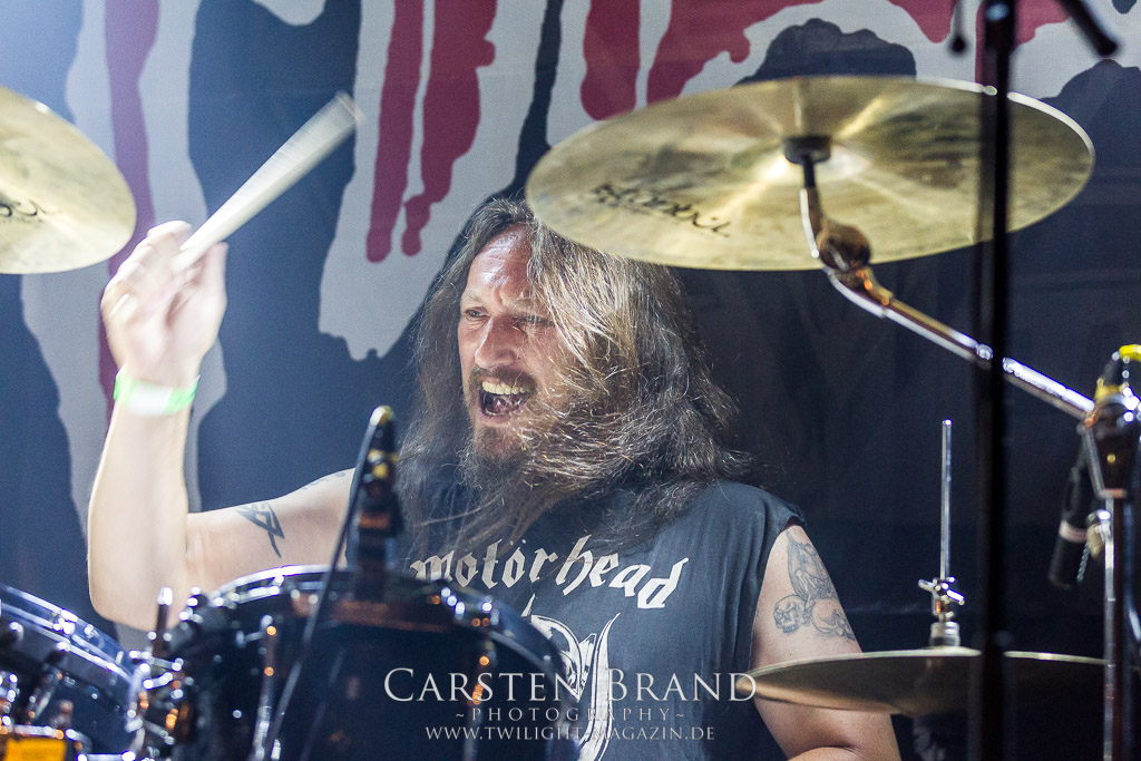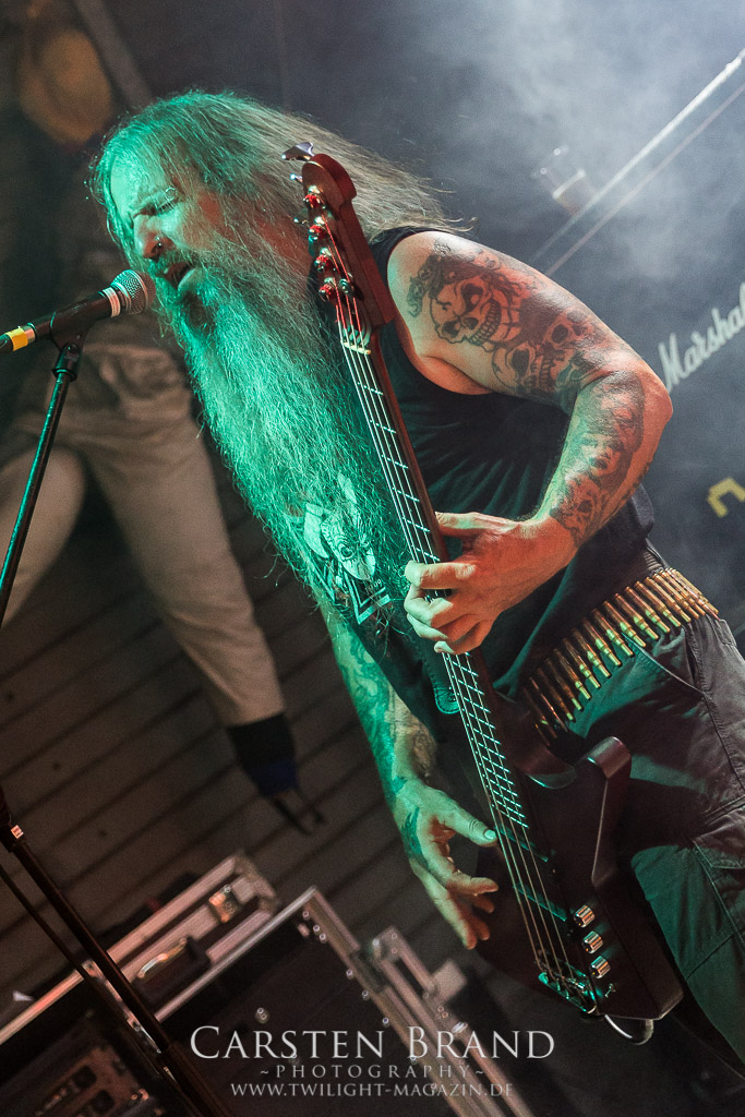 Paul Speckmann wirkt nicht nur optisch wie Vater Abraham, er ist tatsächlich der Methusalem der Death Metal - Szene. Zwar hat der MASTER-Frontmann musikalisch in über drei Dekaden meiner Ansicht nie die ganz hochkarätigen Klassiker erschaffen, sein Einfluss und vor allem seine musikalische Beständigkeit und Präsenz ist jedoch unbestritten und das rechtfertigt tatsächlich die hohe Position im Billing. Knochentrocken rotzt der Wahl-Tscheche mit seinen beiden Mitstreitern die tief im Thrash verwurzelten Brecher aus 35 Jahren Bandgeschichte aus dem Ärmel. Auch wenn ich dem alten Mann immer noch nachtrage, dass er Krabathor einst auseinanderdividiert hat, Master werden an diesem Abend ihrer Position gerecht.