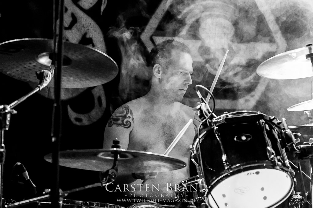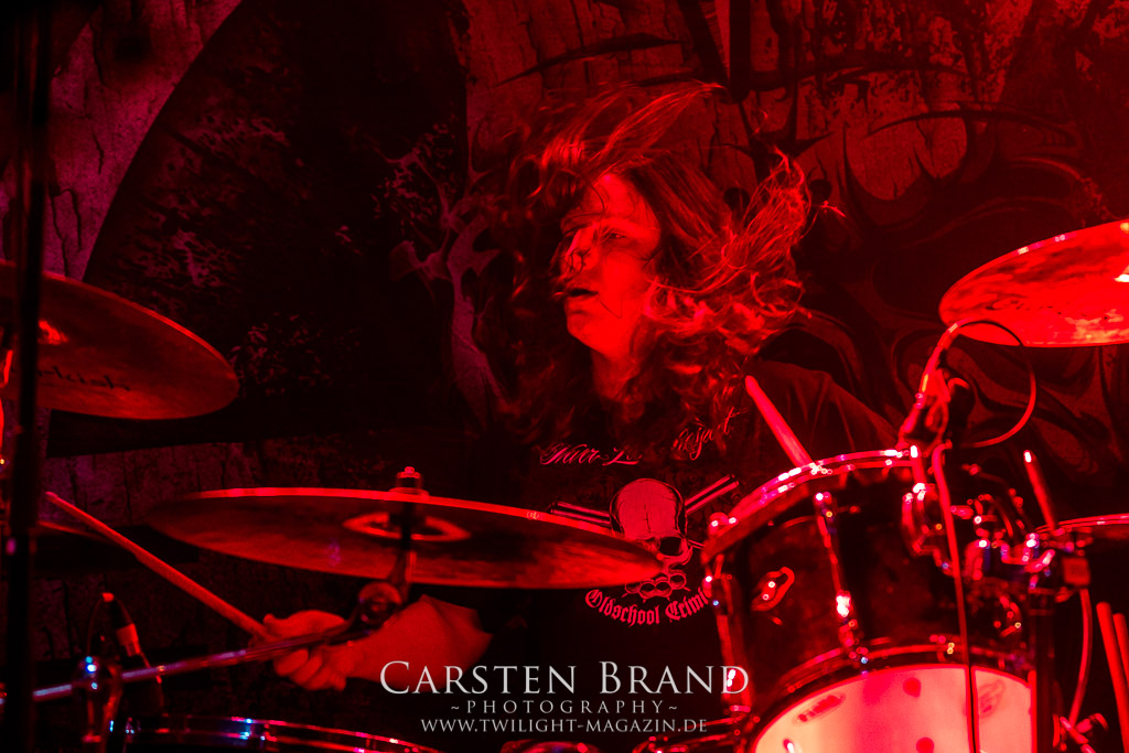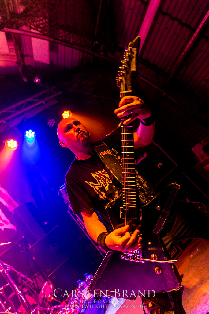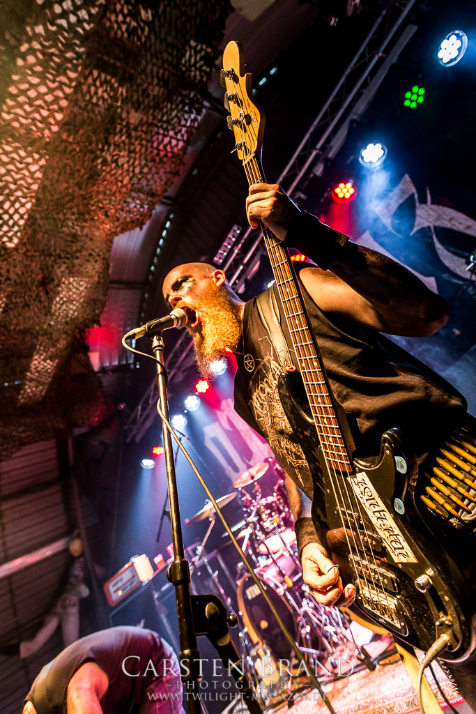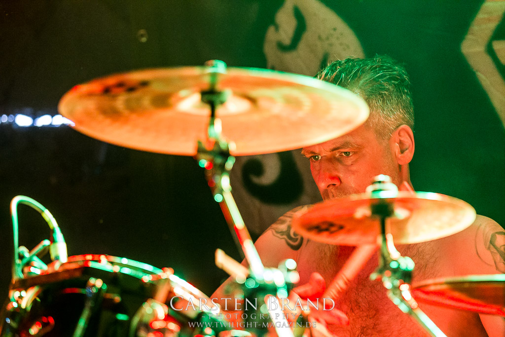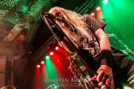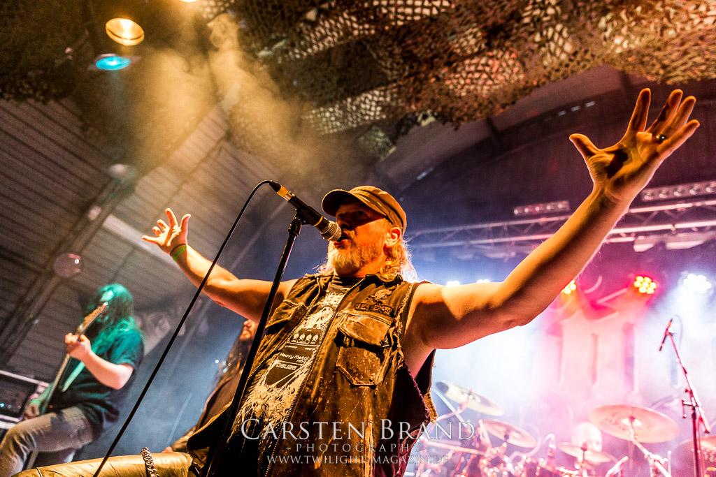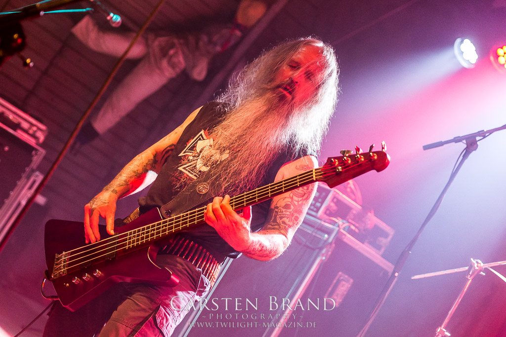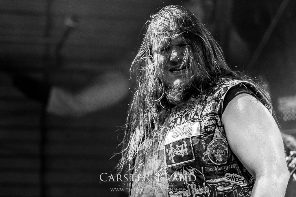 Paul Speckmann wirkt nicht nur optisch wie Vater Abraham, er ist tatsächlich der Methusalem der Death Metal - Szene. Zwar hat der MASTER-Frontmann musikalisch in über drei Dekaden meiner Ansicht nie die ganz hochkarätigen Klassiker erschaffen, sein Einfluss und vor allem seine musikalische Beständigkeit und Präsenz ist jedoch unbestritten und das rechtfertigt tatsächlich die hohe Position im Billing. Knochentrocken rotzt der Wahl-Tscheche mit seinen beiden Mitstreitern die tief im Thrash verwurzelten Brecher aus 35 Jahren Bandgeschichte aus dem Ärmel. Auch wenn ich dem alten Mann immer noch nachtrage, dass er Krabathor einst auseinanderdividiert hat, Master werden an diesem Abend ihrer Position gerecht.