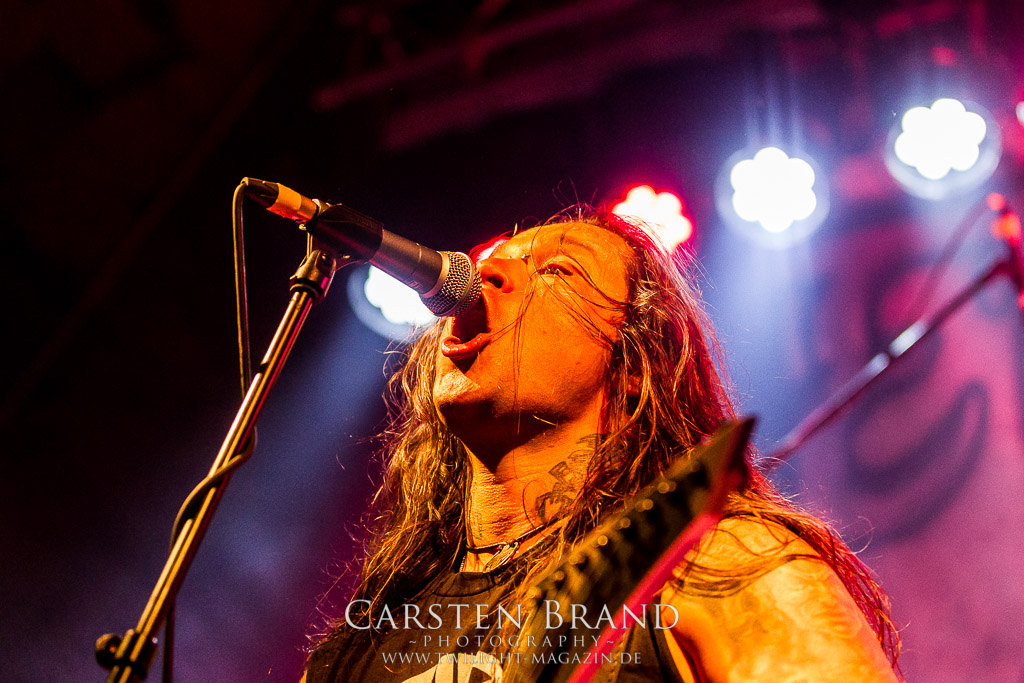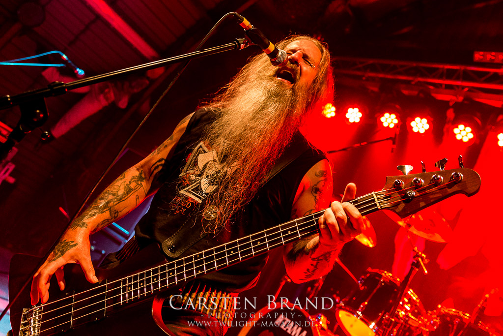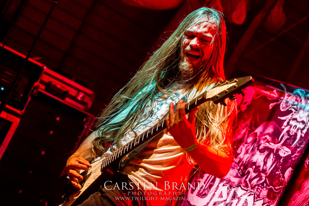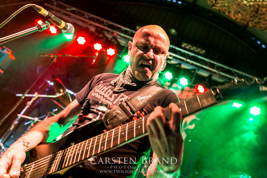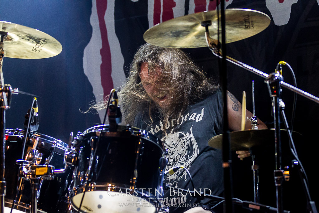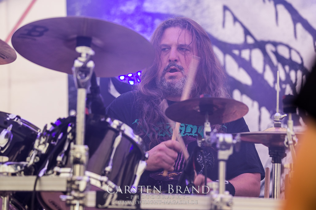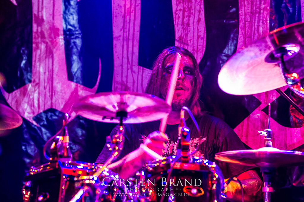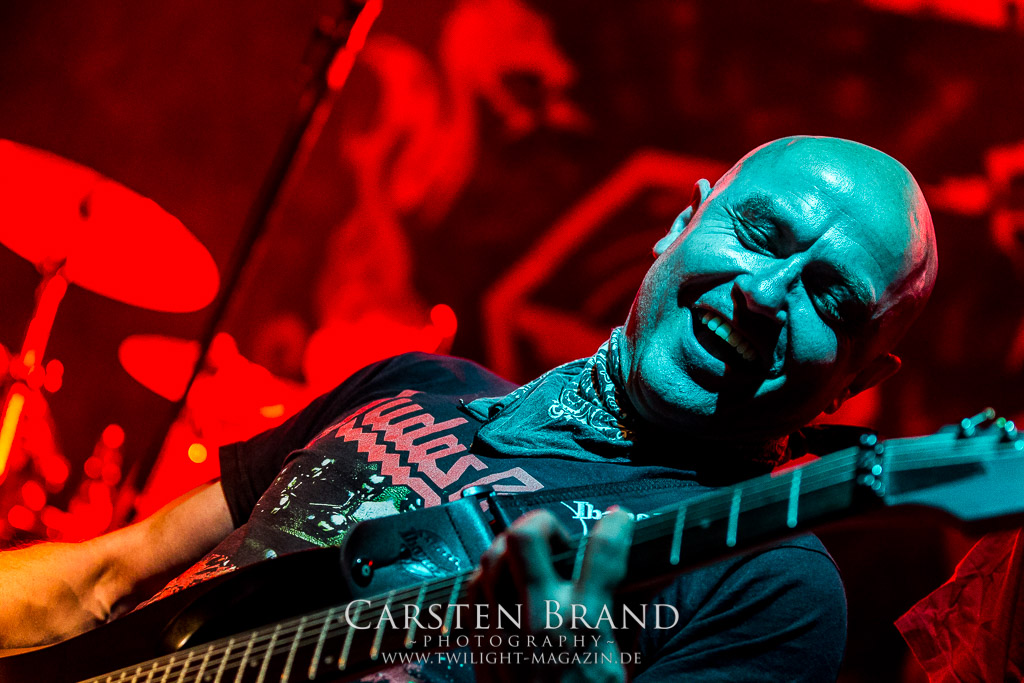 Paul Speckmann wirkt nicht nur optisch wie Vater Abraham, er ist tatsächlich der Methusalem der Death Metal - Szene. Zwar hat der MASTER-Frontmann musikalisch in über drei Dekaden meiner Ansicht nie die ganz hochkarätigen Klassiker erschaffen, sein Einfluss und vor allem seine musikalische Beständigkeit und Präsenz ist jedoch unbestritten und das rechtfertigt tatsächlich die hohe Position im Billing. Knochentrocken rotzt der Wahl-Tscheche mit seinen beiden Mitstreitern die tief im Thrash verwurzelten Brecher aus 35 Jahren Bandgeschichte aus dem Ärmel. Auch wenn ich dem alten Mann immer noch nachtrage, dass er Krabathor einst auseinanderdividiert hat, Master werden an diesem Abend ihrer Position gerecht.