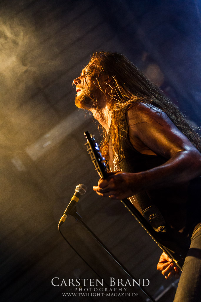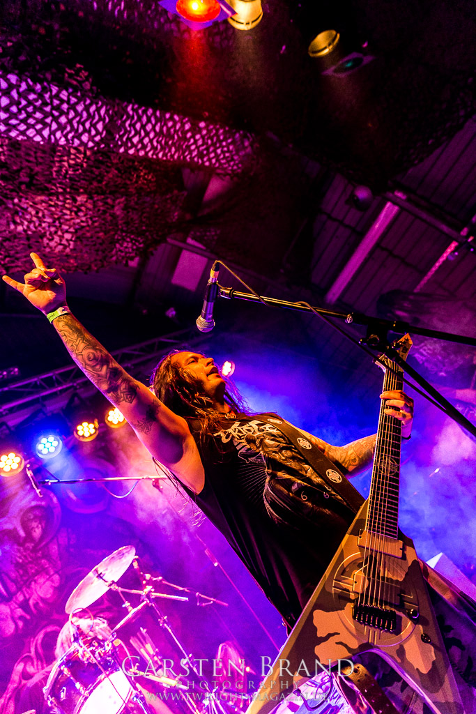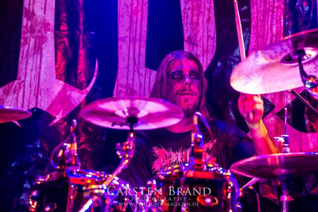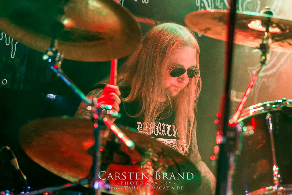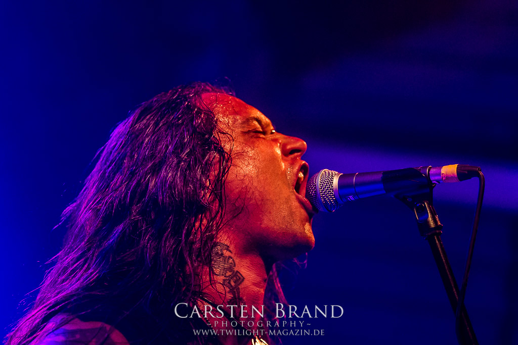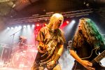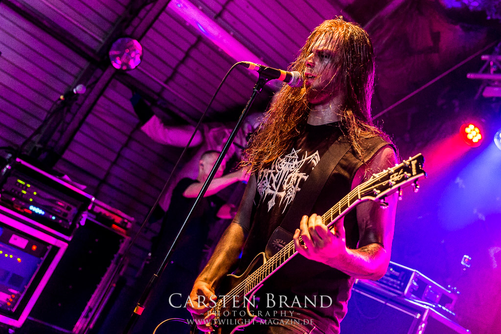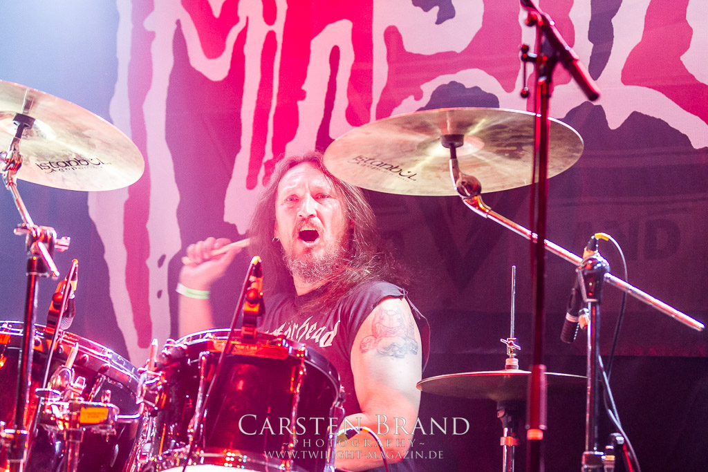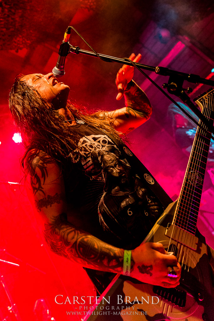 Paul Speckmann wirkt nicht nur optisch wie Vater Abraham, er ist tatsächlich der Methusalem der Death Metal - Szene. Zwar hat der MASTER-Frontmann musikalisch in über drei Dekaden meiner Ansicht nie die ganz hochkarätigen Klassiker erschaffen, sein Einfluss und vor allem seine musikalische Beständigkeit und Präsenz ist jedoch unbestritten und das rechtfertigt tatsächlich die hohe Position im Billing. Knochentrocken rotzt der Wahl-Tscheche mit seinen beiden Mitstreitern die tief im Thrash verwurzelten Brecher aus 35 Jahren Bandgeschichte aus dem Ärmel. Auch wenn ich dem alten Mann immer noch nachtrage, dass er Krabathor einst auseinanderdividiert hat, Master werden an diesem Abend ihrer Position gerecht.