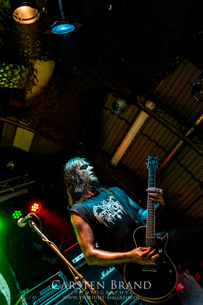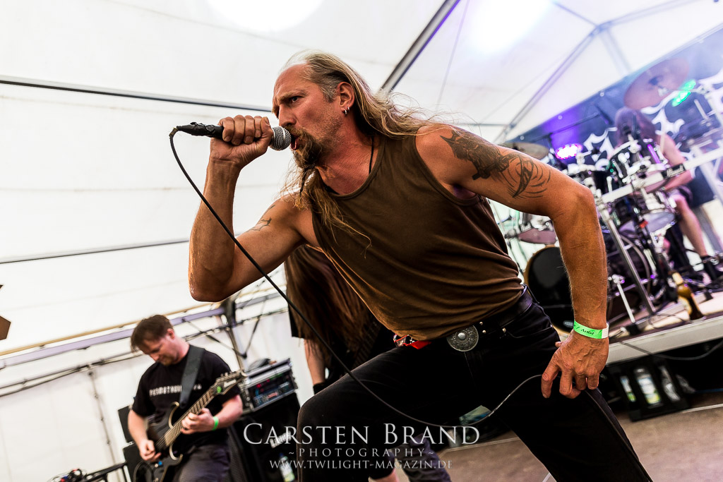 In der Nacht hat es sich zwar mächtig abgekühlt aber drückend, windig und regnerisch ist es nach wie vor, so dass sich erstmals seit meinem eigenen, relativ späten Protzen-Debut nicht der Drang einstellt, einen vormittäglichen Ausflug zu den nahe gelegenen Badeseen zu unternehmen. Was nicht nur Nachteile hat, denn somit komme ich in den seltenen Genuss, dem Festivalauftakt am Freitag beizuwohnen. Und der gehört den Heidelberger Altmeistern von INTO DARKNESS. Mit Unterbrechungen gibt es das Quartett schon seit 1997 und die Erfahrung merkt man den Jungs deutlich an, doch auch wenn Performance, Technik und Songmaterial jedem Morbid Angel - Jünger ein anerkennendes Grinsen ins Gesicht zaubert, originell und wirklich bahnbrechend ist die Vorstellung im mäßig gefüllten Hangar nicht. Insgesamt aber eine achtbare Vorstellung eines soliden Openers.