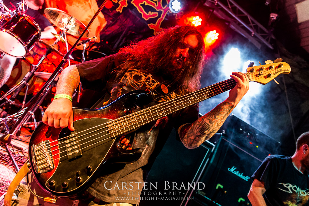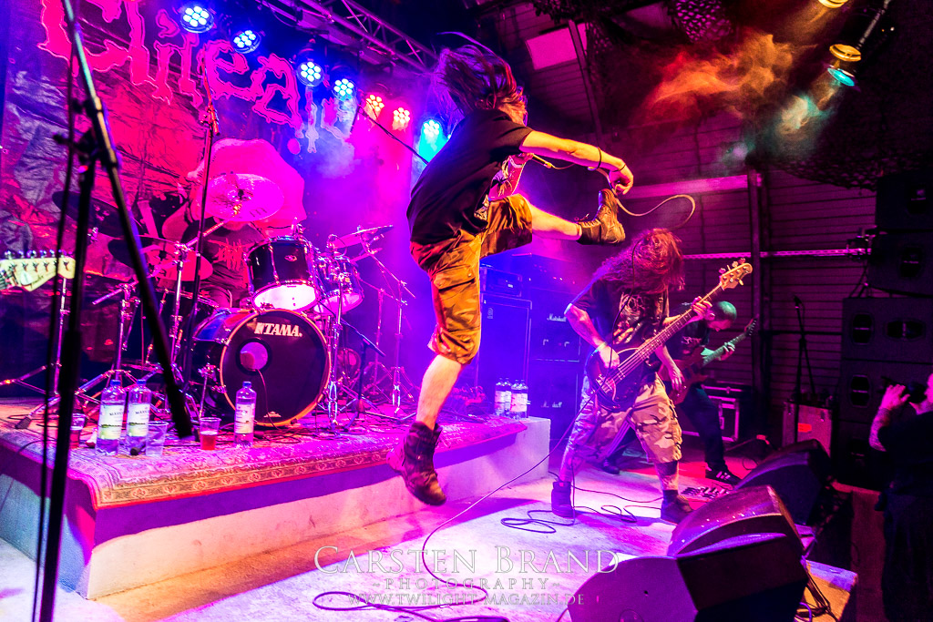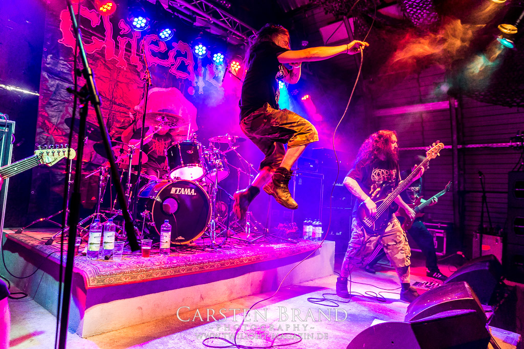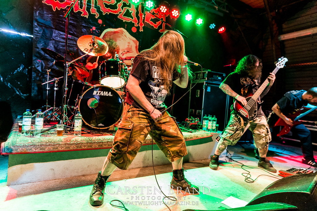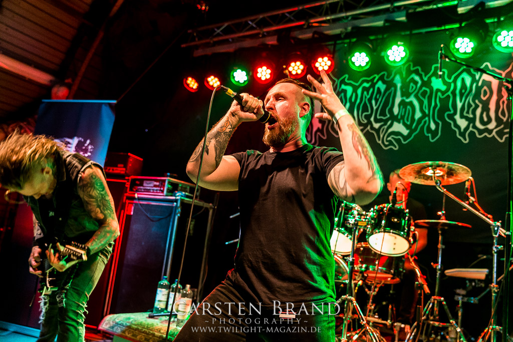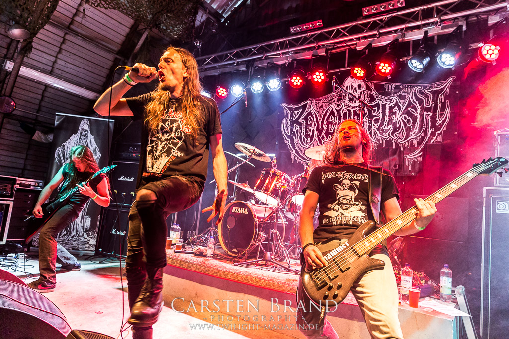 Die Schwaben von REVEL IN FLESH gastieren im Rahmen ihrer Mini-Tour mit FACEBREAKER in Protzen. Die deutschen Schwedenstahl-Anbeter sind seit ihrem letzten Auftritt 2015 wesentlich besser geworden und präsentieren einen amtlichen Abriss. Insgesamt kommen sie aber nach wie vor nicht über den Status einer - wenn auch sehr guten - Dismember-Gedächtniskapelle hinaus. Mir fehlt hier einfach das letzte, gewisse Etwas, was die schwedischen Kollegen LIK zweifelsohne haben. Immerhin, ihren deutschen Kollegen von Fleshcrawl haben Revel In Flesh mittlerweile den Rang ganz klar abgelaufen. Und sie gefallen mir auch einmal mehr besser als ihre Tourkollegen von Facebreaker, eine Schweden-Band, die so gar nicht nach typischen Schwedensound tönt. Knochentrocken, brutal und direkt ins Gesicht und irgendwie beliebig und austauschbar konnte mich das Quintett noch nie wirklich hinter dem Ofen hervor locken und ich denke das wird in diesem Leben auch nichts mehr.