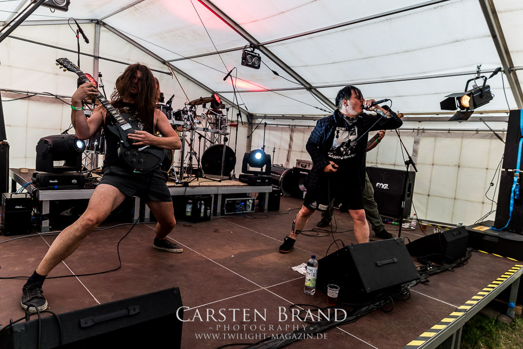 Ich gebe offen zu, dass erst die Absage von Haemorrhage und die damit verbundene Bekanntgabe von VIU DRAKH als Ersatz dazu geführt hatten, dass der Besuch des diesjährigen Protzen-Jubileums für mich unverzichtbar wurde. Vielen jüngeren Lesern und Besuchern dürften die Hallenser nahezu unbekannt sein. Sie waren jedoch um die Jahrtausendwende eine der aktivsten und besten deutschen Live-Bands und noch dazu eine der musikalisch außergewöhnlichsten Bands in der Schnittmenge zwischen Death Metal, Crust, Grind und Punk. Das 2002er Album "Death Riff Society" ist ein bis heute kaum gewürdigter, vergessener und unerreichter Klassiker, der die Band seinerzeit sogar auf Europatour mit Cannibal Corpse führte. Danach folgte ein Split auf Raten und teilweise die Fortführung mit den nicht weniger genialen Korades. Und dass die Band nun ausgerechnet auf dem diesjährigen Open Air ihr Comeback feiert ist dem alljährlichen, gebetsmühlenartigen Einreden von Veranstalter Mario auf alle Beteiligten des Origina l- Line-Up´s zu verdanken, eine Beharrlichkeit, die man ihm gar nicht hoch genug anrechnen kann. Doch kann die Band aus dem Stand tatsächlich die gleiche Explosivität wie vor mehr als einer Dekade auf die Bretter bringen oder sollte eine große Enttäuschung anstehen? Erste, durchgesickerte Stimmen vom Vorabend, an dem Viu Drakh mit ihren Freunden von Malignant Turmour daheim eine Generalprobe veranstaltet hatten, verhießen Gutes, ließen aber die Spannung im Vorfeld nur noch weiter ins Unermessliche steigen. Doch schon mit den ersten Takten macht das Quartett klar, dass sie es immer noch können. Mit rasiermesserscharfem, krachendem Sound knallen Viu Drakh dem Publikum Klassiker für Klassiker vor den Latz, als wären sie nie weg gewesen. "Death Riff Society", "Mutant Gods", "Caravan", "Dead Or Alive", "Black Milk" vom "Take No Prisoners..."-Album, ja sogar "Noize Militia" vom Demo der Vorgängerband TinPanAlley ist in der Setlist und am Ende fehlt auch die obligatorische Motörhead-Hymne "Ace Of Spades" natürlich nicht. Dieser Gig ist Zeitreise und Frischzellenkur zugleich. Während der nachdrücklichen Vorstellung verjünge ich mich mal eben locker um 15 Jahre, um mich hernach sofort wieder um 20 Jahre gealtert zu fühlen. Was bleibt ist pures Glück und ein breites Grinsen angesichts dieser Vorstellung, sowohl bei den Musikern auf der Bühne, wie auch bei den Fans. Dieser Gig ist eine Machtdemonstration. Fortsetzung folgt? Eigentlich führt kein weg daran vorbei allerdings dürfte es wohl eher unwahrscheinlich sein. Aber ich bin unheimlich glücklich und dankbar, dass ich Viu Drakh und ihre Songs noch einmal live erleben durfte, noch dazu in dieser Art und Weise. (JD)