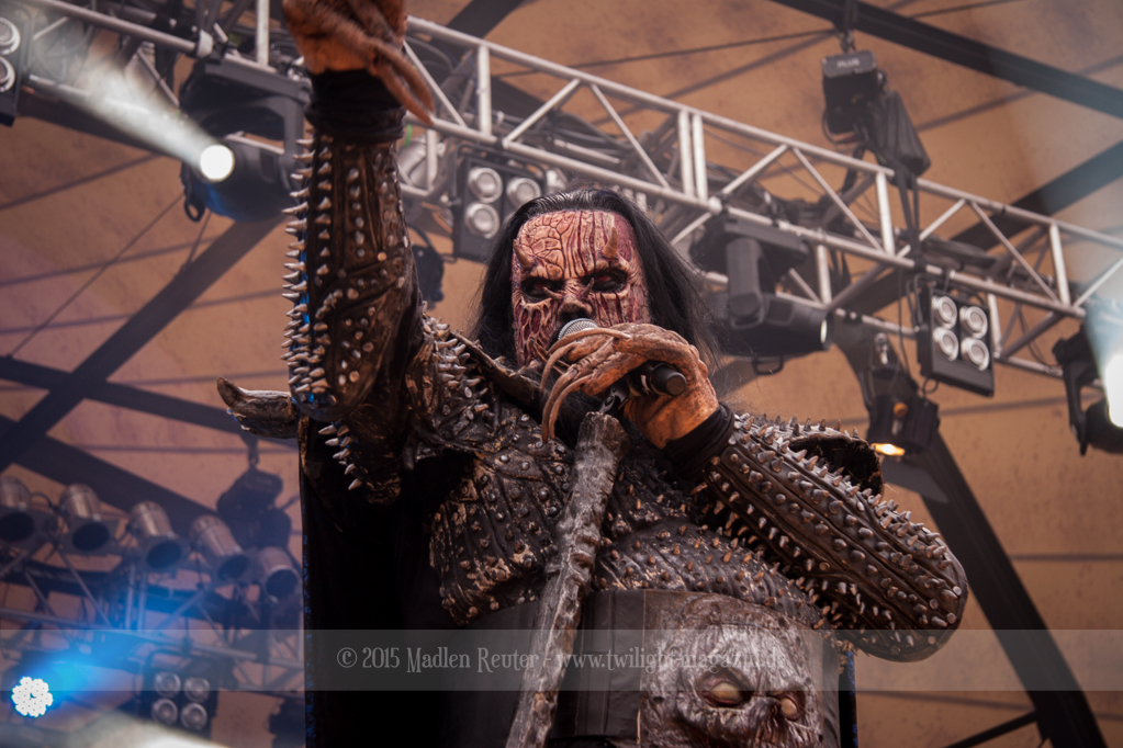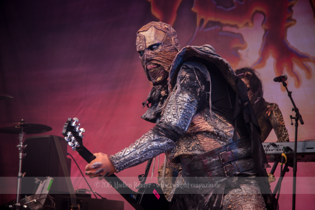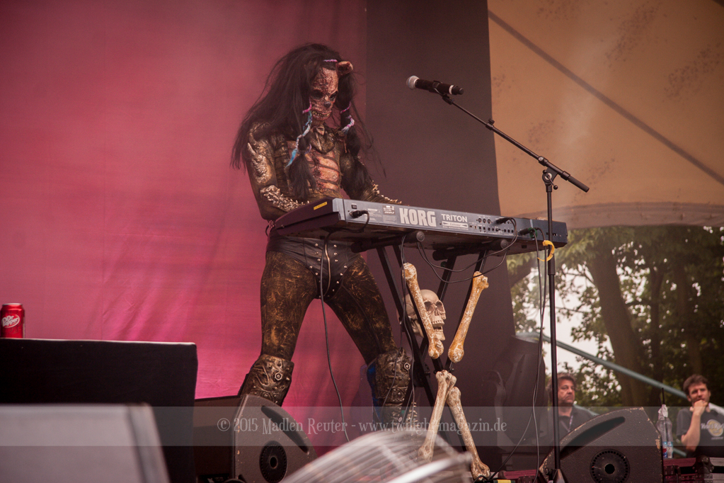 Dann wurde es auch schon Zeit für meine Lieblingsband, LORDI. Bei dem Wetter zolle ich noch größeren Respekt an die Monster, als ich es sonst schon tue, denn bereits vor dem ersten Song floss der Schweiß in Sturzbächen an ihnen hinunter. Einzig das Bassmonster scheint etwas träge, Gitarrist Amen und Aushilfskeyboarder Nalle geben dafür 120%. Halleluja, Nalle ist vielleicht ein geiler Typ – Der gute steht Hella in absolut gar nichts nach. Leider war die Setlist recht kurz, und kaum neue Songs fanden Platz darin. Lediglich „Nailed By The Hammer Of Frankenstein“ & „Scare Force One“ wurden gespielt. Auch der Livehit „Sincerely With Love“ wurde gestrichen, dafür fand jedoch „They Only Come Out At Night“ (Nein, kein Besuch von Udo.) einen Weg auf die Bühne. Als größte Überraschung entpuppte sich dann das ALICE COOPER Cover „He’s Back“ – Absolut geiler Song, und die Version der Monster ist einfach der Knaller! Und passend dazu, bekamen die Monster einen kurzen Besuch von Jason Voorhees. Ansonsten bleibt mir nicht viel zu sagen, die Show war der Hammer, und auch der Rest der zahlreichen Zuschauer war begeistert. Mit jedem Auftritt verliebe ich mich mehr in diese wunderhübschen Motherf*cker!