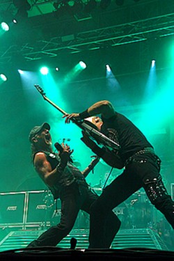 Gegen halb Zehn war es dann Zeit für die Amis von ICED EARTH. Amtlich eingekleidet mit Jeans-Leder-Kombis von Toxic Vision enterten Schaffer & Co die Rock Stage und feuerten gleich ordentlich in die Menge. Ich habe die Band zwar schon einige Male gesehen, aber – glaube ich – noch nie ohne Barlow. Mit dem ehemaligen INTO ETERNITY Shouter Stu Block hat Schaffer ja seit 2011 einen amtlichen Metalfrontman an Bord. Block sauste auch wie ein Wilder über die Bühne und lieferte einen wirklich guten Job ab. Mit Songs wie „Dystopia“, „Anthem“, „V“ und „Boiling Point“ wurden gleich vier Songs des aktuellen Albums gespielt. Doch auch die Fans der älteren Stücke kamen auf ihre Kosten, denn mit „Dark Saga“, „I Died For You“ oder dem grandiosen „Watching over me“ hatte man eine ganze Reihe hochkarätiger Oldies in der Playlist. Mit „Pure Evil“ – für mich einer der stärksten Songs der Show – wurde sogar die „Stormrider“-Ära bedacht. Neben der gelungenen Songauswahl und dem agilen Frontmann konnte die Band vor allem durch eine grandiose Lichtshow punkten. Alles in allem bereiteten die Amis den nachfolgenden ACCEPT einen fruchtbaden Acker, so dass diese nur noch die Ernte einfahren mussten.
