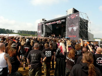 Es schien, als hätten sie einen Pakt mit dem Wettergott: Kurz vor dem Auftritt von 3 Inches of Blood hatte es aufgehört zu regnen, so dass die Kanadier vor einer trockenen und (dank Stroh) praktisch nicht matschigen Main Stage rocken konnten. Wer sich um diese Uhrzeit schon aus seinem Zelt gequält hatte, bekam vom bärtigen Fronter mit Kutte und genretypischer Quietschstimme eine hübsche Batterie melodischen Power-Thrash, dessen Energie mit einem Schuss Pathos am Anfang noch wenig, gegen Ende immer besser ankam. Während seine Stimme am Anfang noch zu leise abgemischt war, jaulte sich Sänger Sänger Cam Pipes später ohne weitere Probleme durch die Diskografie der Band und quittierte seine Biertrink-Pausen sogar mit brav auswendig gelernten, deutschen Sätzen ("Hau weg die Scheiße!"). Neben den Krachern des neuesten Albums der Band, darunter natürlich "Trial of Champions", "Forest King" oder "The Goatriders Horde" war mit "Deadly Sinners" auch einer der älteren Titel mit an Bord. Dass am Ende "We want more"-Rufe laut wurden, war da kaum verwunderlich – auf Grund des strikten Zeitplans jedoch unerfüllbar. Statt dessen kniete sich die Band noch zu einem Gruppenfoto auf die Bühne, schwenkte zum Abschied die Flagge ihrer Heimat (British Columbia) – und machte sich auf die Socken.