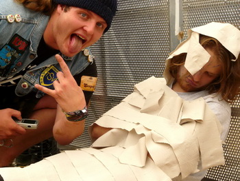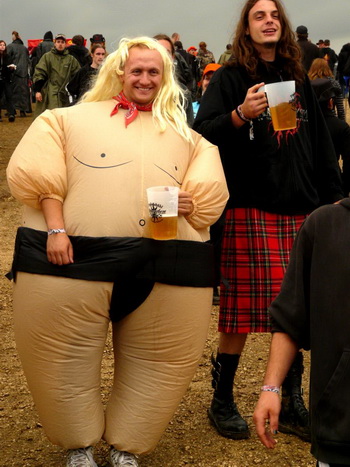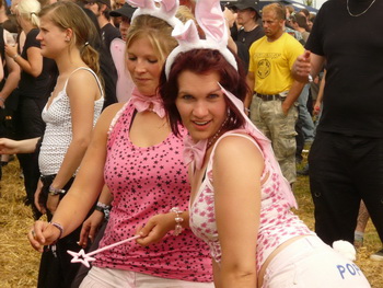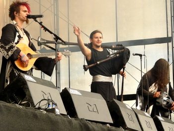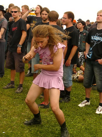 Direkt im Anschluss gab’s auf der Main Stage das Kontrastprogramm: Saltatio Mortis luden mit dem Opener "Prometheus" zu einer Partie lockeren Mittelalter-Rocks, die von Anfang an gut ankam. Neben der bewährten Mischung aus Dudelsack und Gitarre gab’s viel zum mitsingen und klatschen, vor allem vom neuesten Album "Aus der Asche" (2007). Beim sechsten Lied holte sich Sänger Alea, der Bescheidene, zusätzlich noch Unterstützung von einem Menschlein, das ich zunächst für ein Mädchen hielt, sich später aber als Junge entpuppte und akustisch leider kaum rüberkam. Egal. Dem Volke gefiel’s bestens, besonders die Crowdsurfer im Stringtanga, welche dem geflügelten Wort vom "nackten Arsch ins Gesicht" eine völlig neue Bedeutung verliehen. Gingen die Mannen einmal von dannen, konnten sie das unbekümmert tun – sie hatten trotz düsteren Wetters einiges zur guten Stimmung beigetragen.