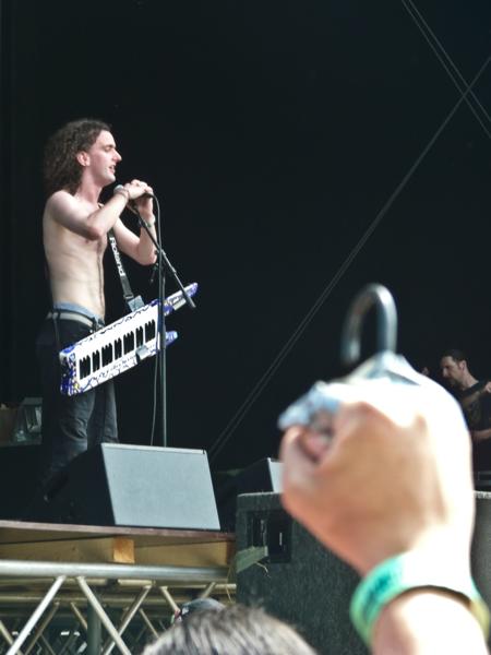 Mit Sonic Syndicate war wohl einer der wohl populärsten Vertreter jener Mischung aus Schweinegrunzen und gefälligem Pop-Rock-Gesang angereist, die sich in den letzten Jahren großer kommerzieller Erfolge erfreute. Dementsprechend war man auch mit allerlei Brimbamborium angereist, wie den zwei großen Stellwänden zum aktuellen Album "Love & Other Disasters". Viele Hunde konnte man damit dennoch nicht hinter dem Ofen hervorlocken: Gerade in den hinteren Reihen war das Publikum extrem dünn. Gekommen waren nur jene, denen die parallel spielenden Satyricon entweder zu hart oder zu affig waren. Und so waren es nur die vordersten Reihen, die zu "Flashback" umhersprangen oder zu "Aftermath" einen kleinen Circle Pit anzettelten, während die Band sich sichtlich Mühe gab, Energie zu verbreiten; dann und wann wirkten sogar die Bewegungen auf der Bühne wohl durchchoreografiert und abgesprochen. Spätestens nach dem sechsten Lied klangen die Titel jedoch langsam alle gleich, und auch das Publikum dünnte sich immer weiter aus, bis nur noch ca. dreihundert müde Seelen übrig geblieben waren. Ausgerechnet mit denen wollte die Band aber dann partout den "biggest Circle Pit ever" starten - mit dem bislang dünnsten Publikum des Festivals, einem Song im Schlafwagentempo, und einem Zweitsänger, dem auf halber Strecke die Stimme versagte. Als Sonic Syndicate sich schließlich von der Bühne verabschiedeten, dürften daher nur echte Hardcore-Fans der Band das bedauert haben. Mich jedenfalls konnten sie nicht so recht begeistern.